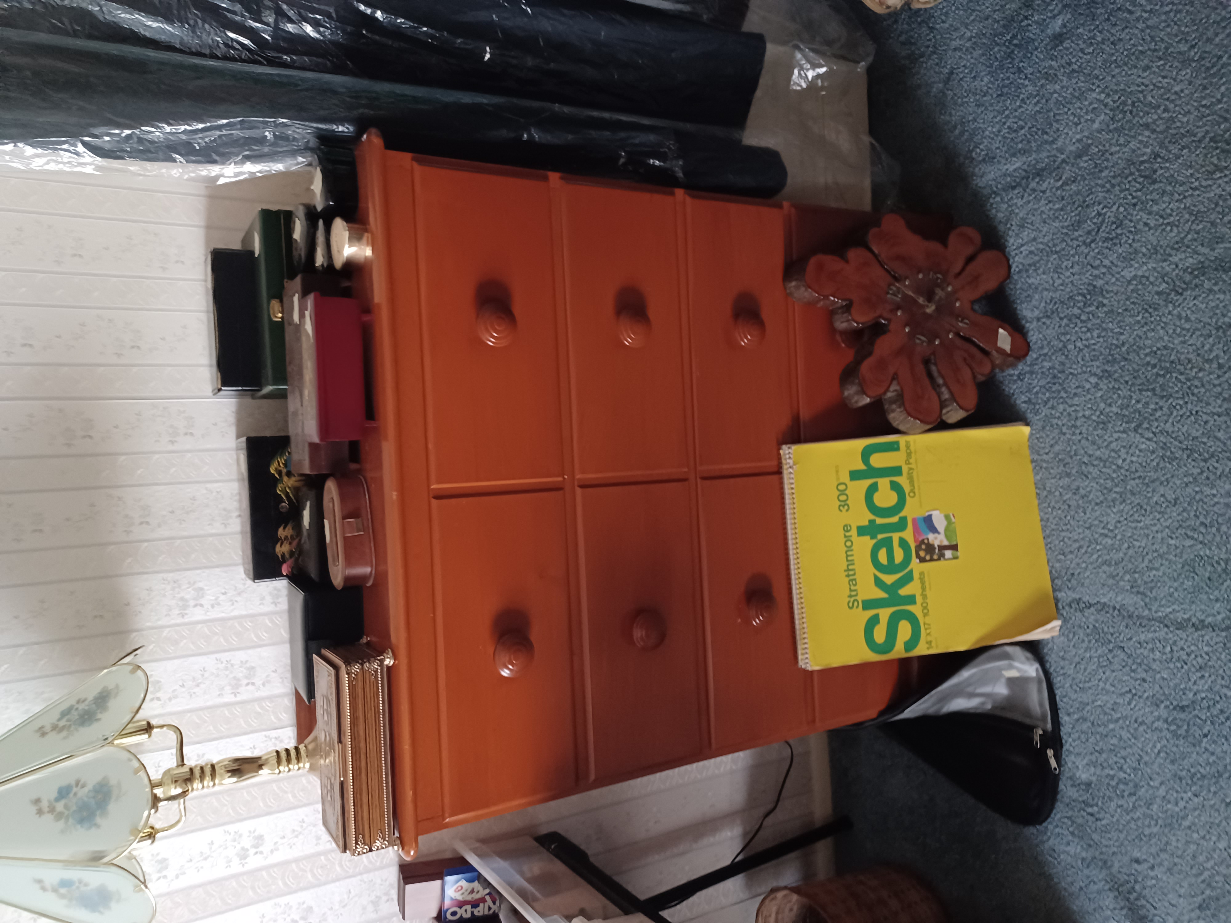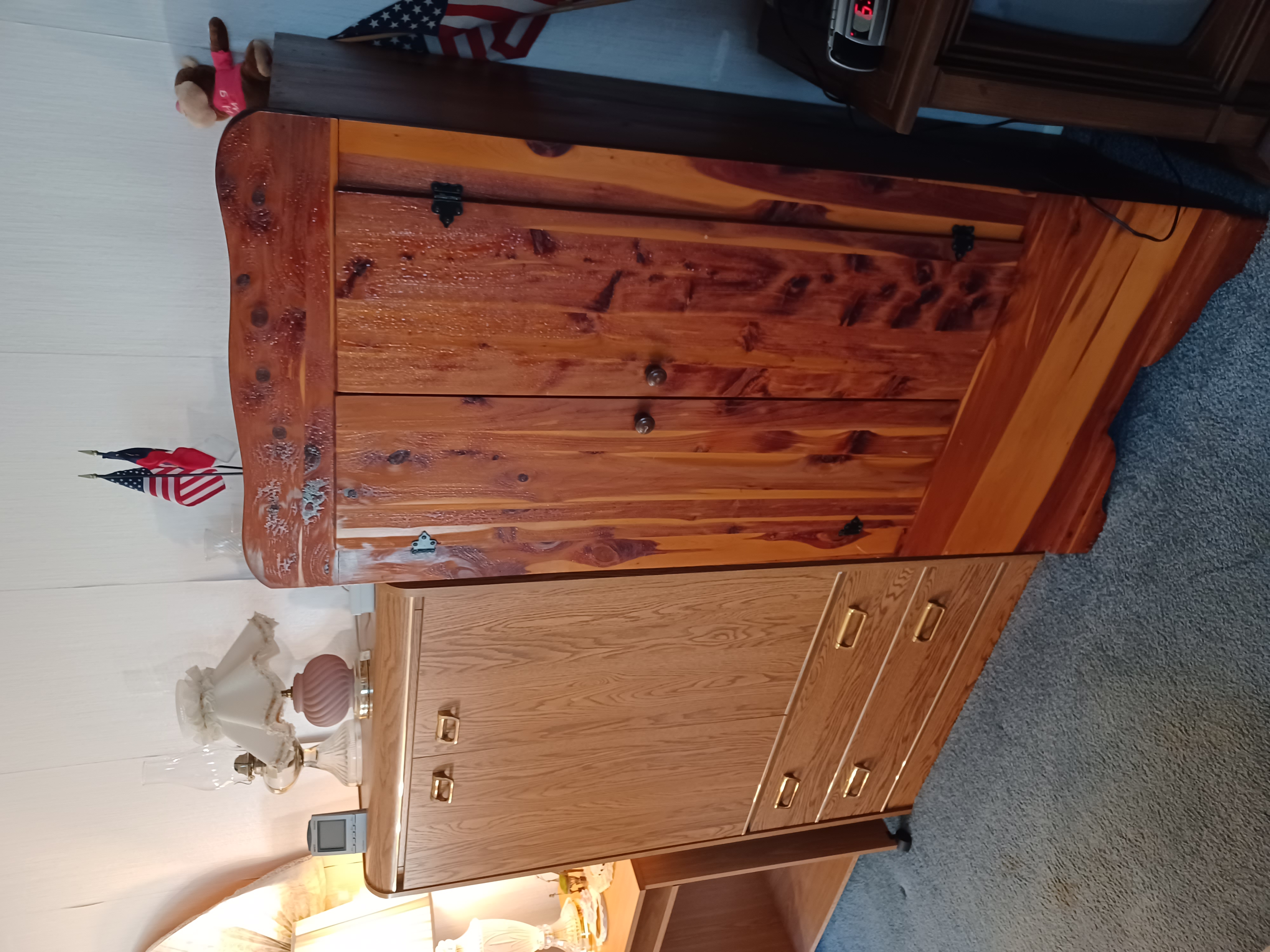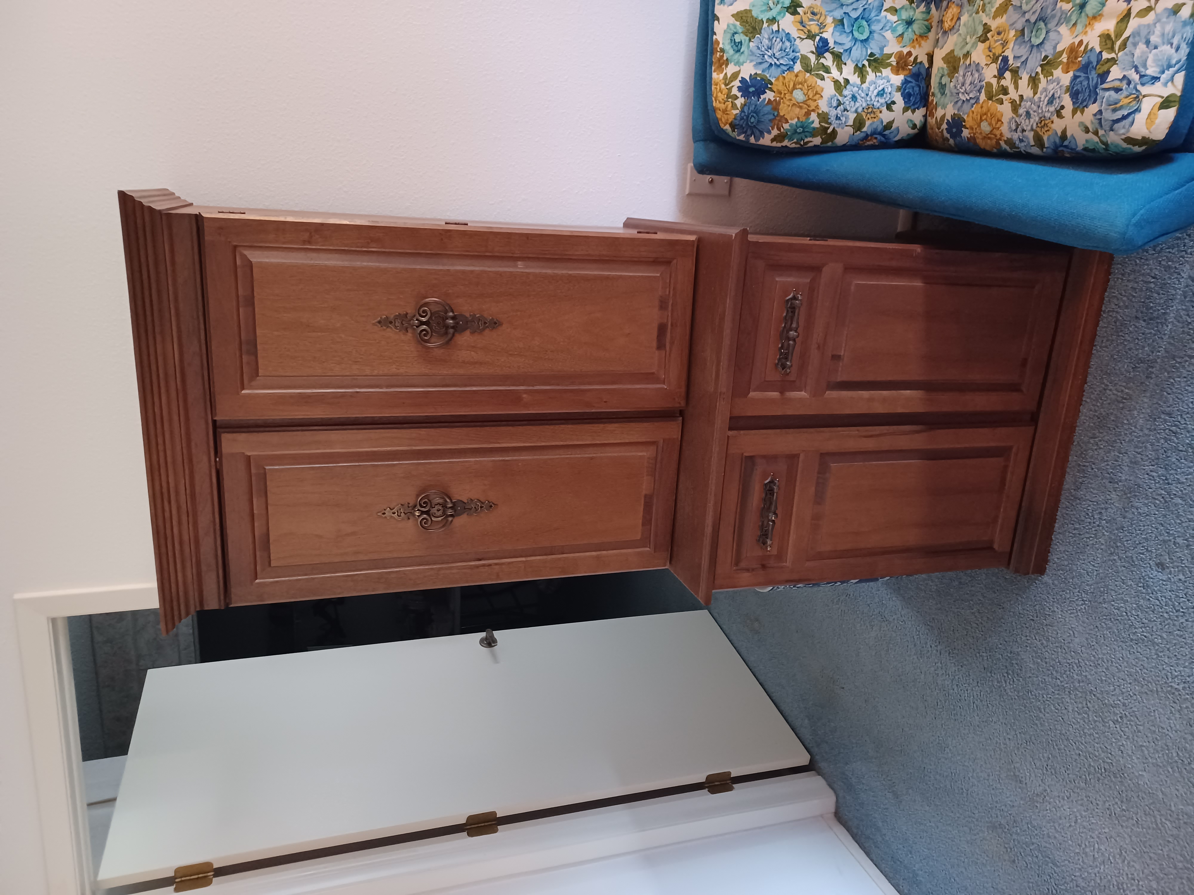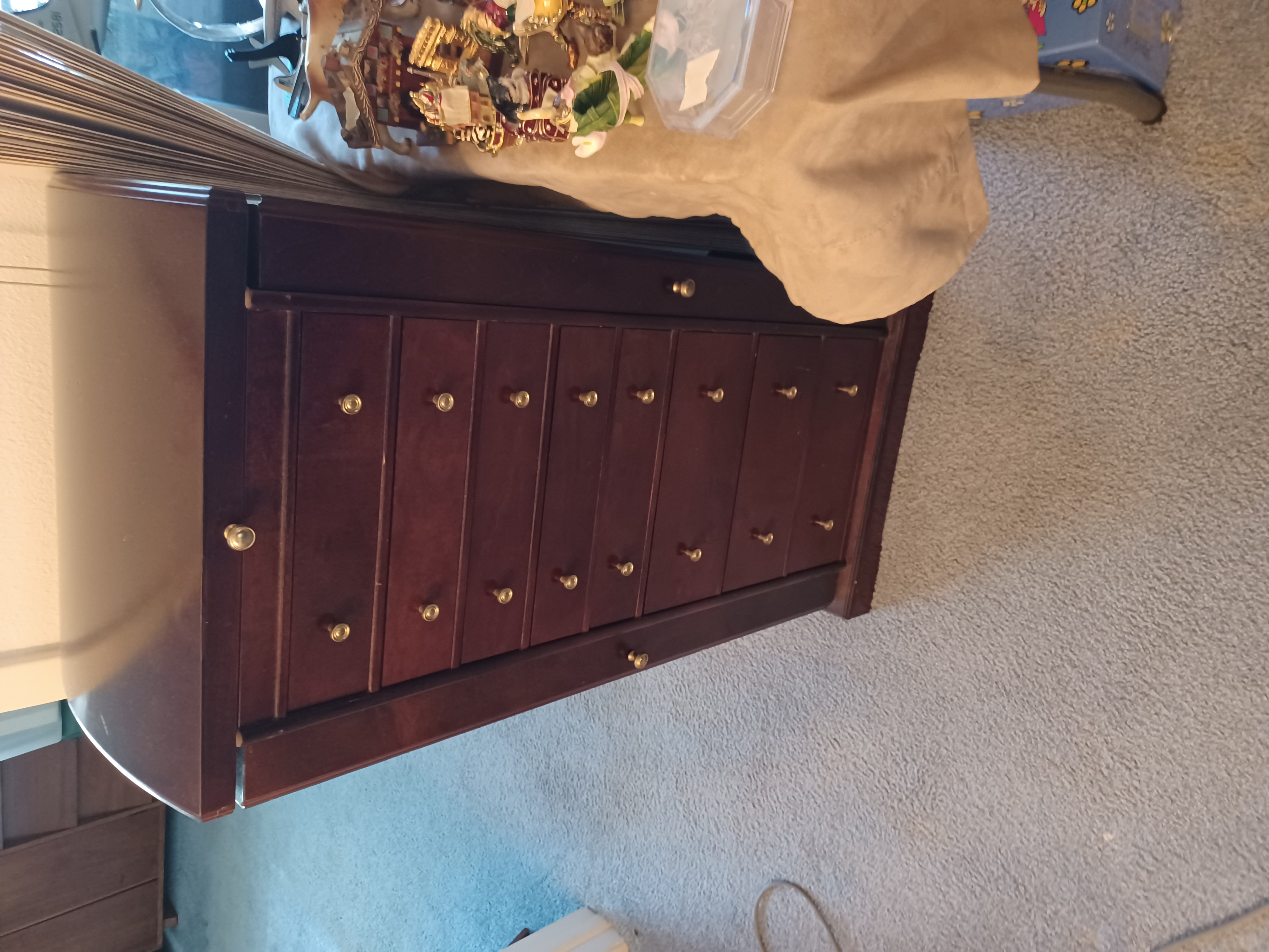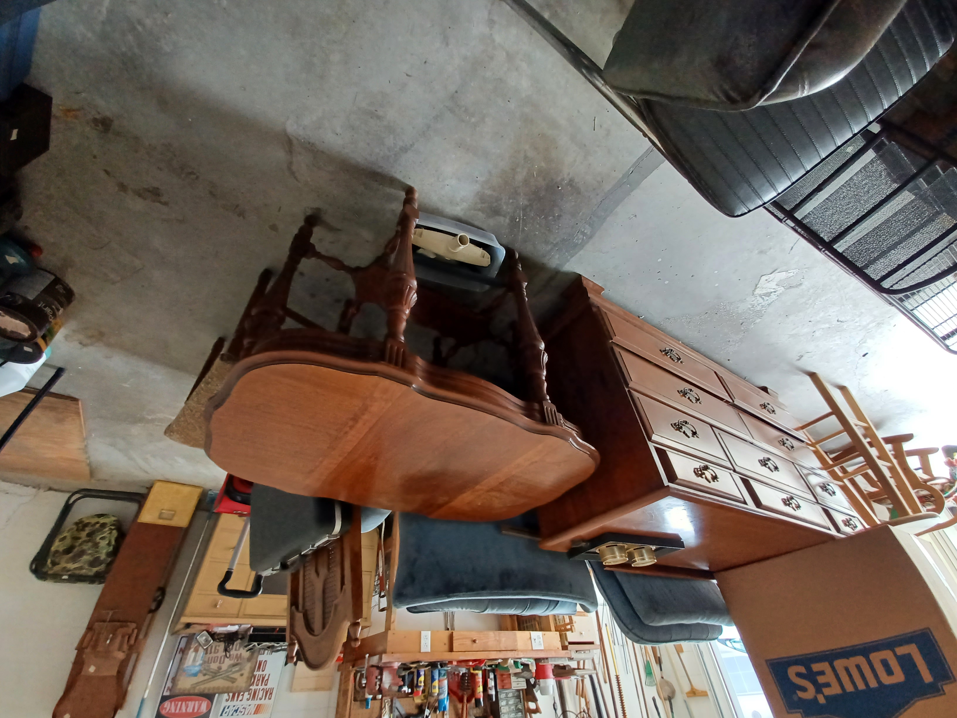 You’ll also find a vintage Singer upright sewing cabinet with machine, smaller bedroom furniture pieces, and a hope chest with a padded seat.