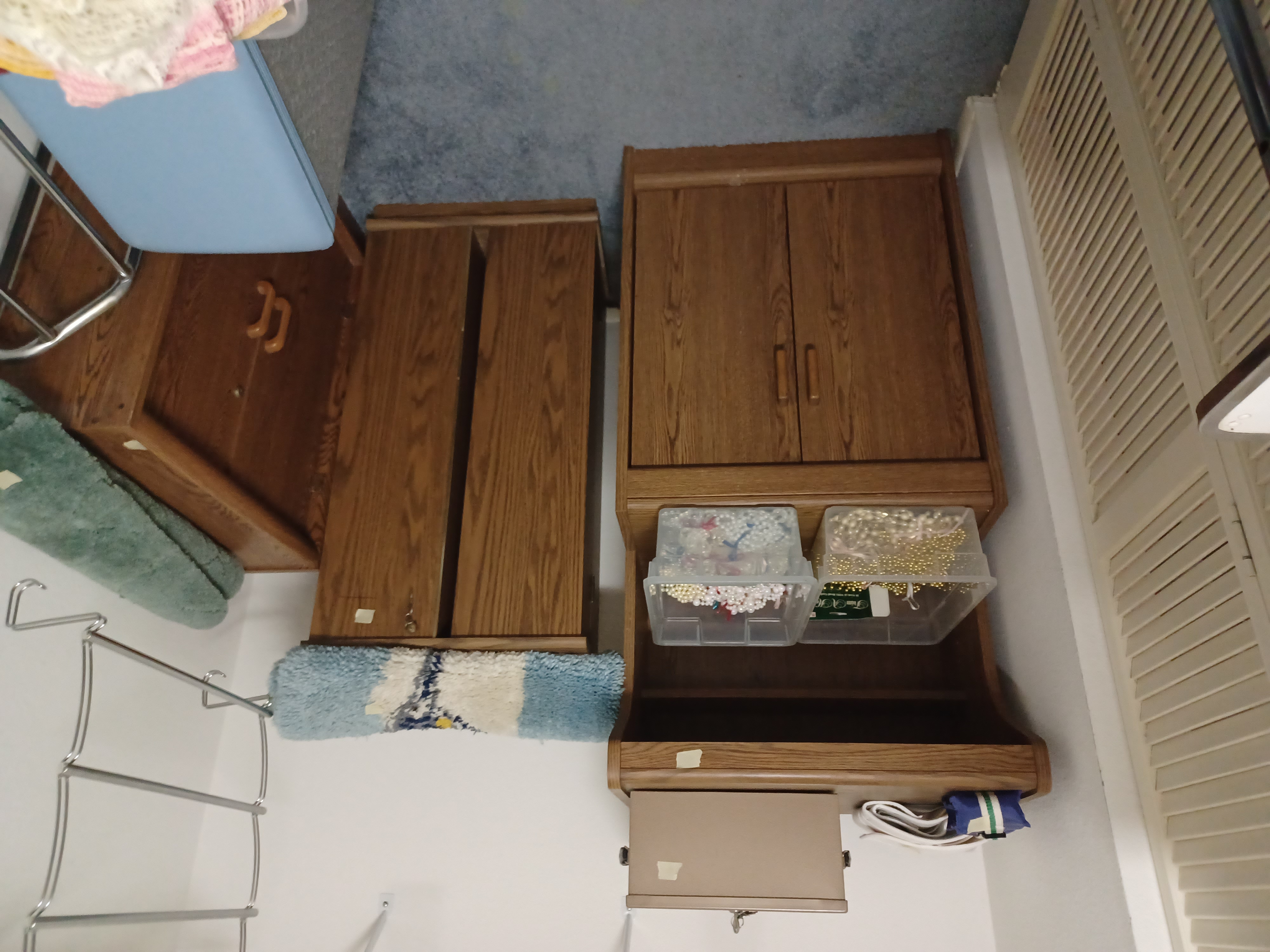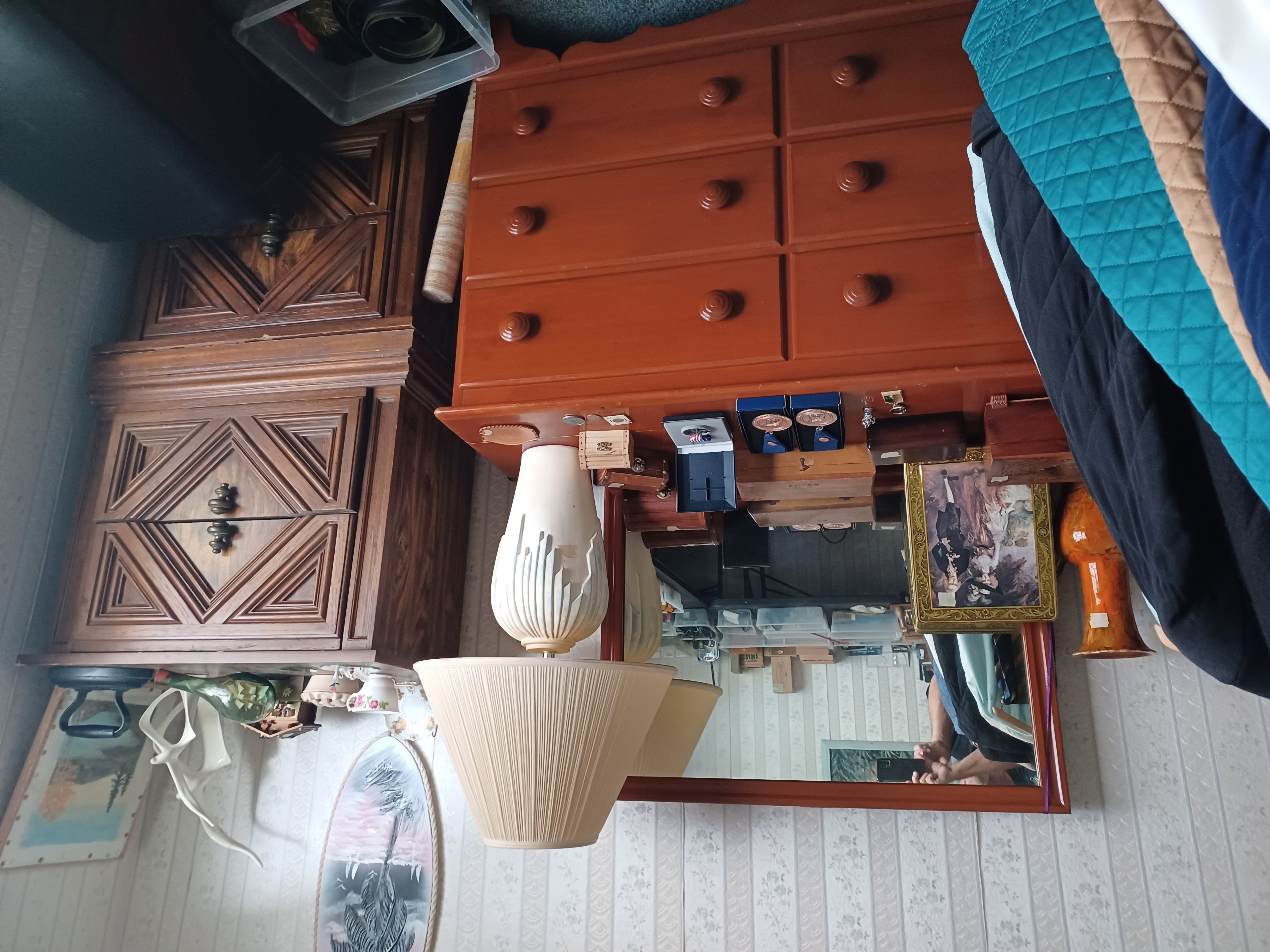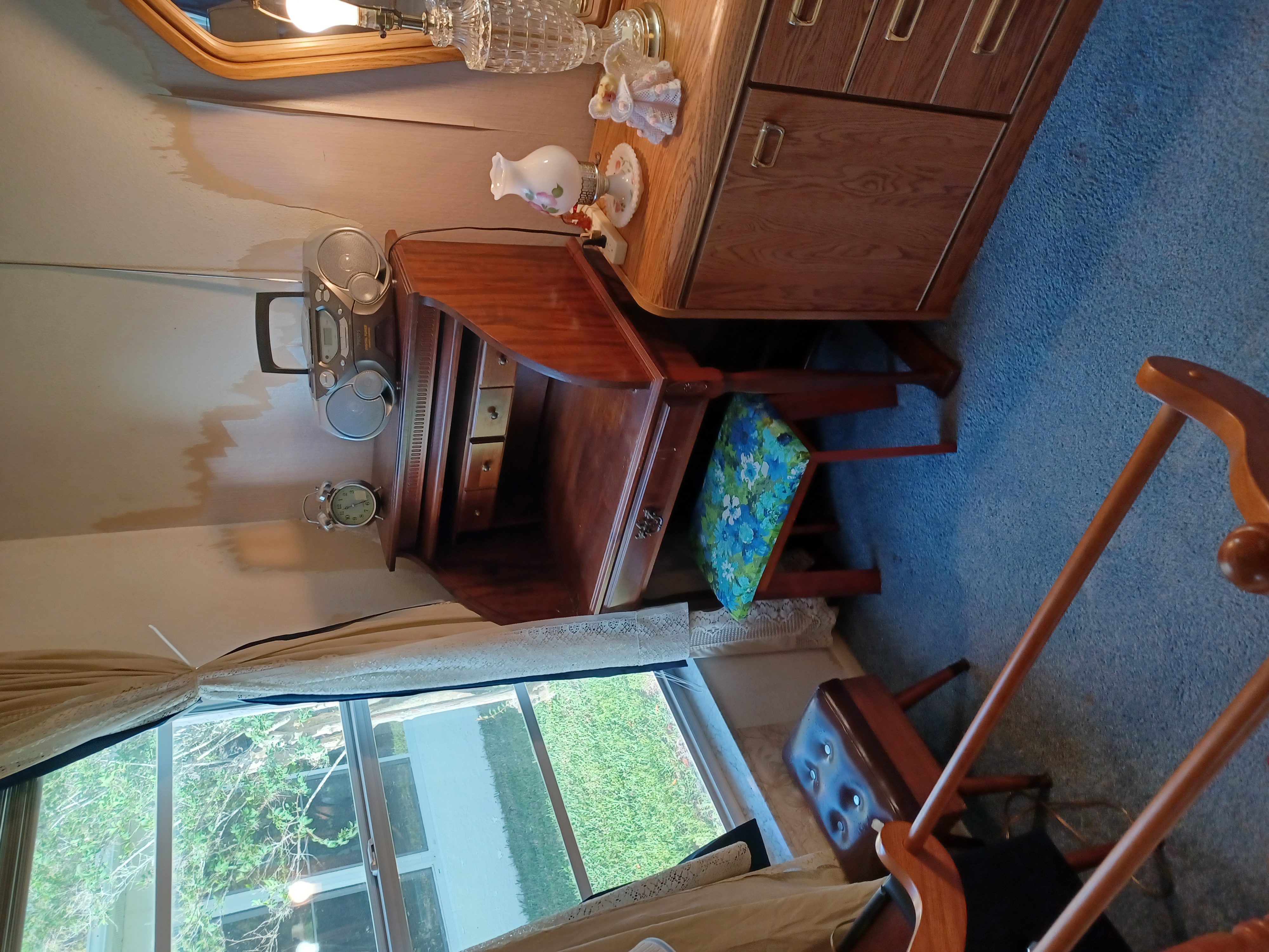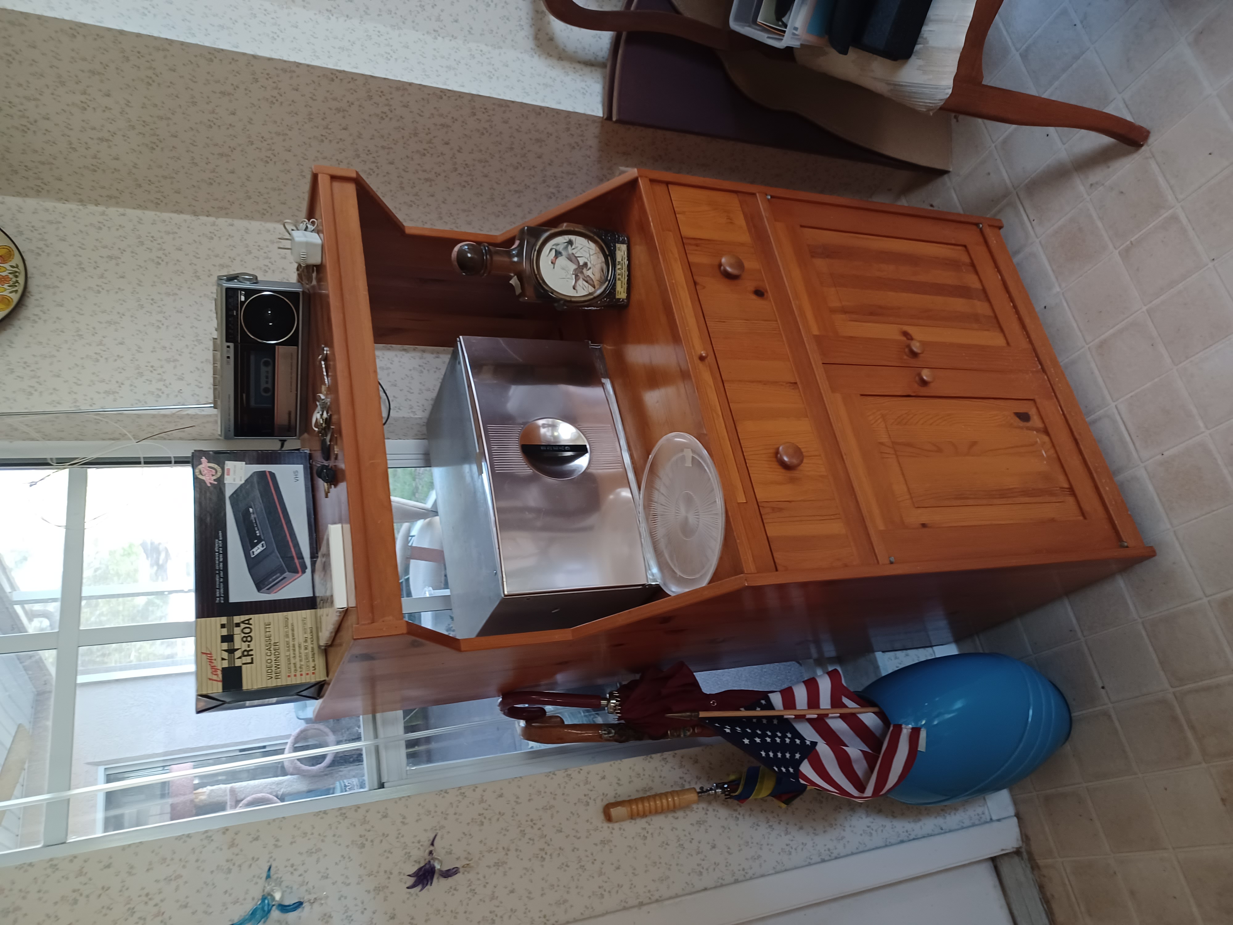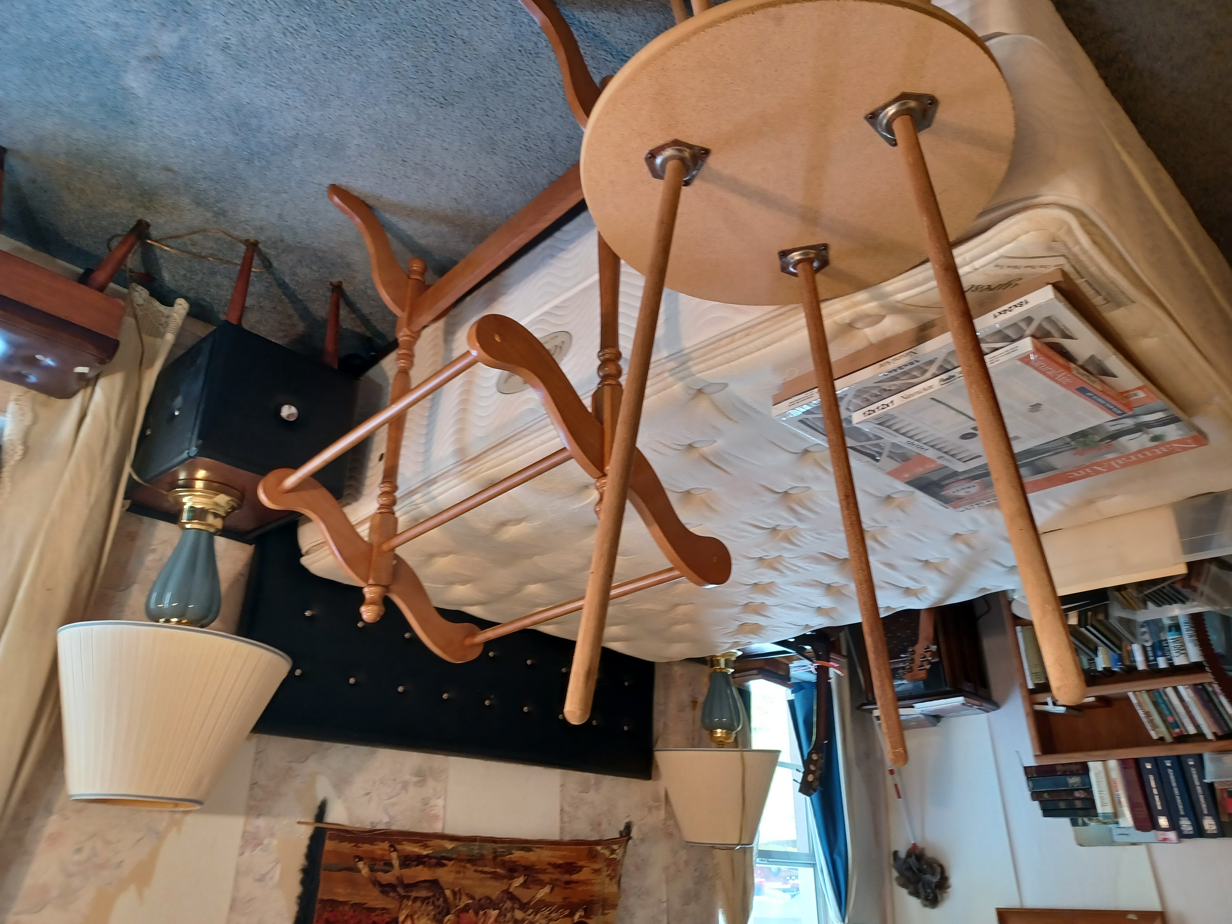 You’ll also find a vintage Singer upright sewing cabinet with machine, smaller bedroom furniture pieces, and a hope chest with a padded seat.