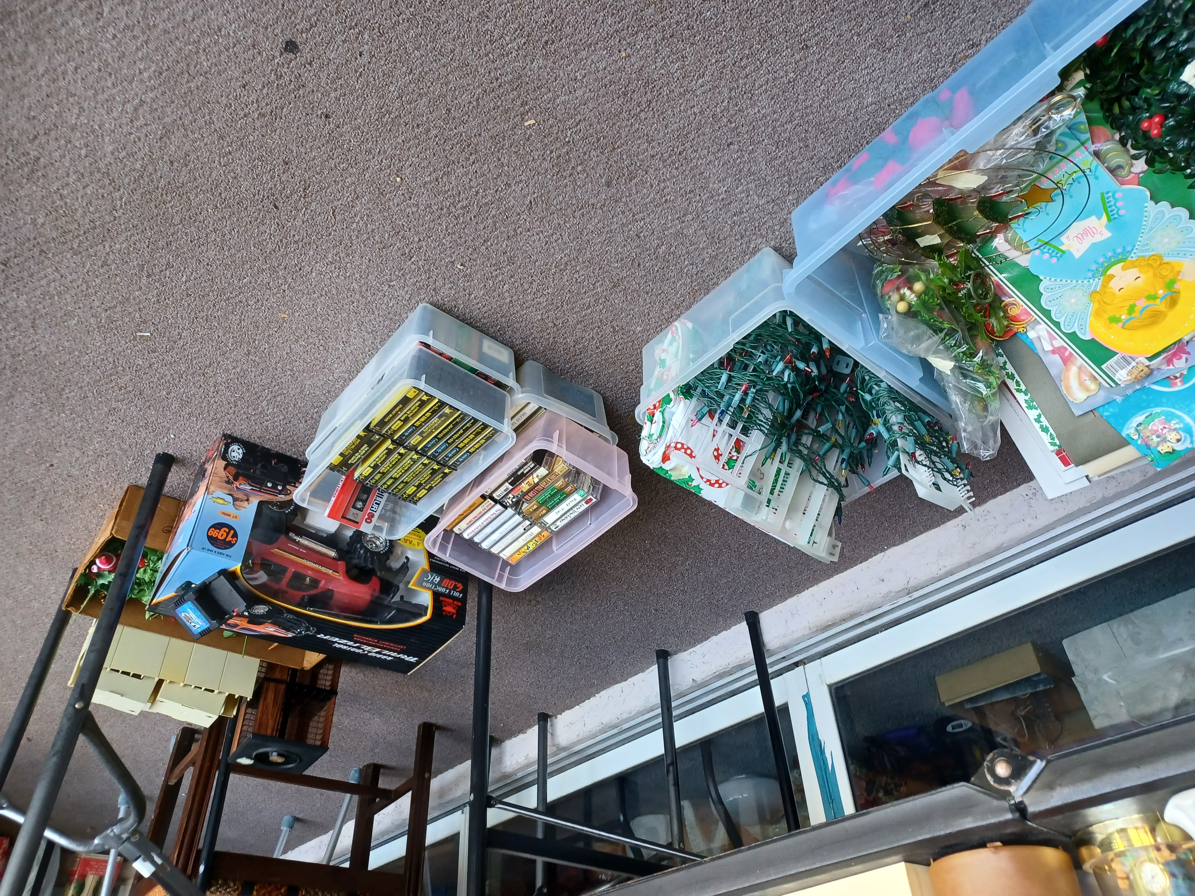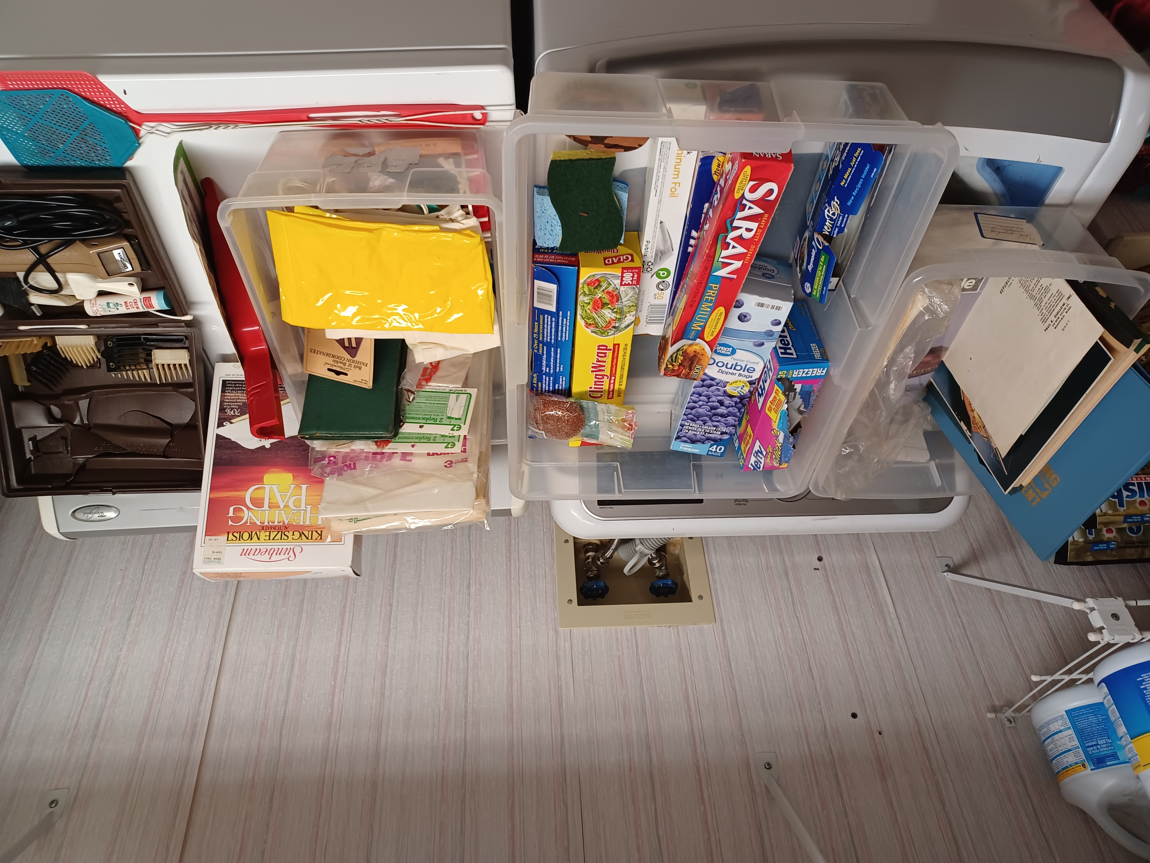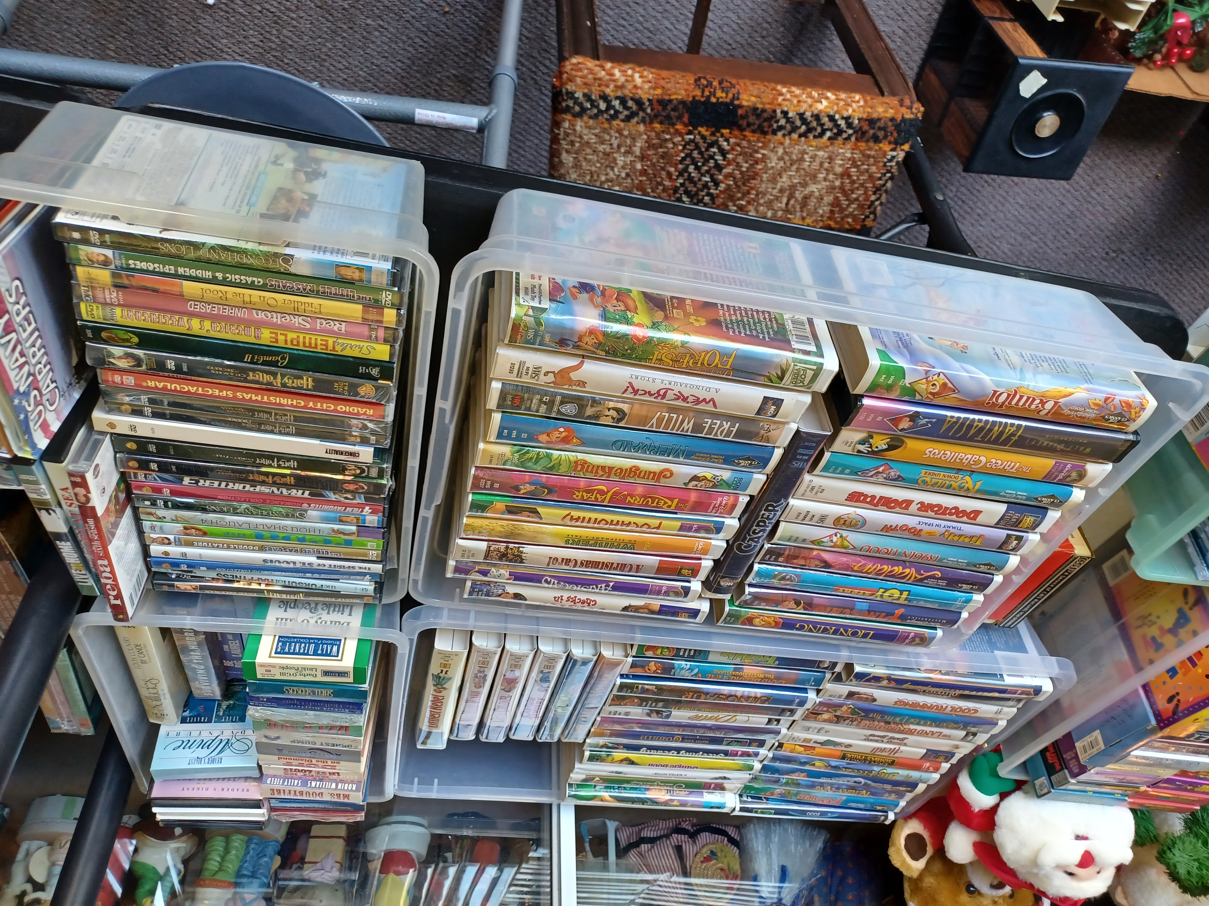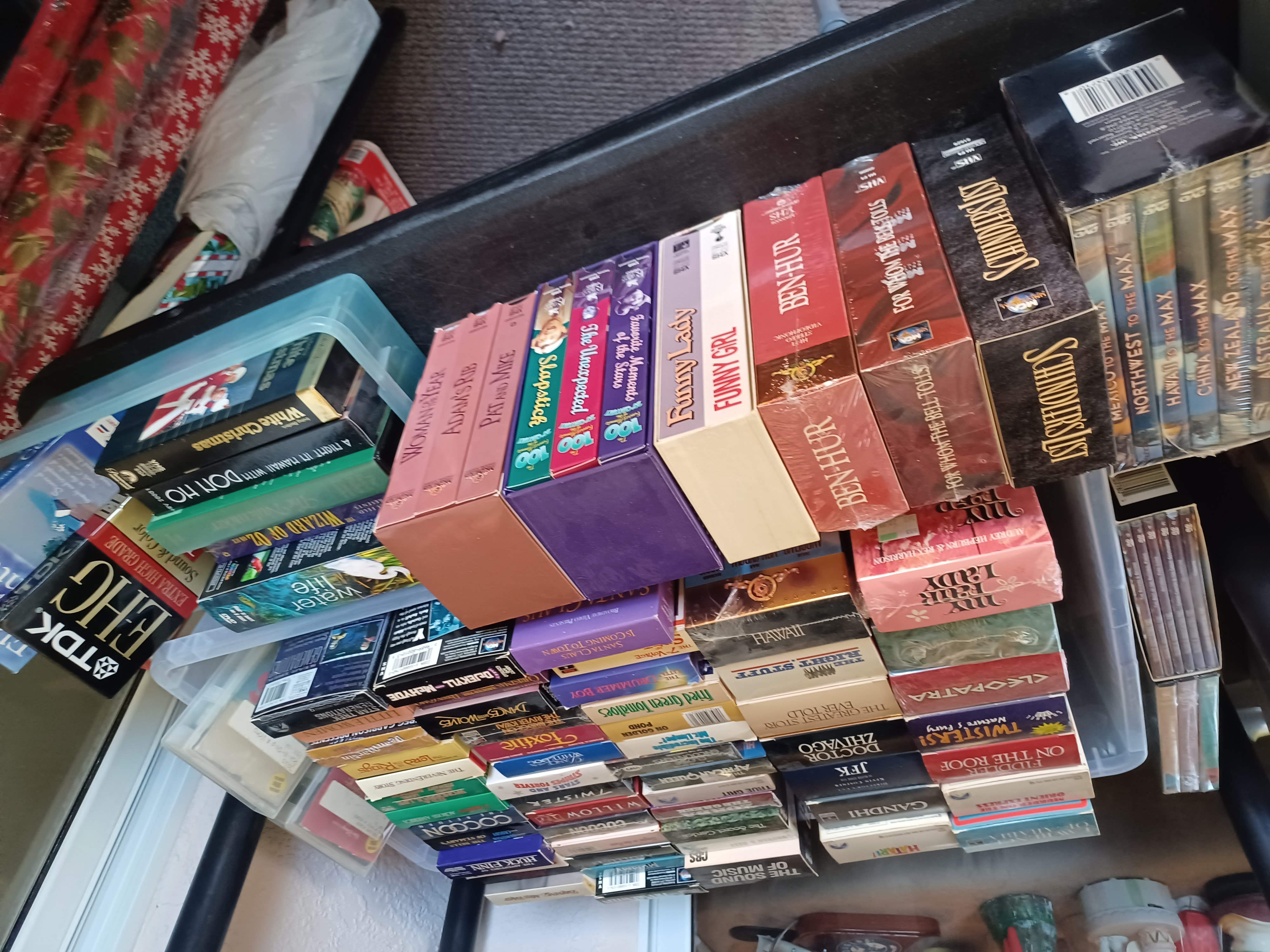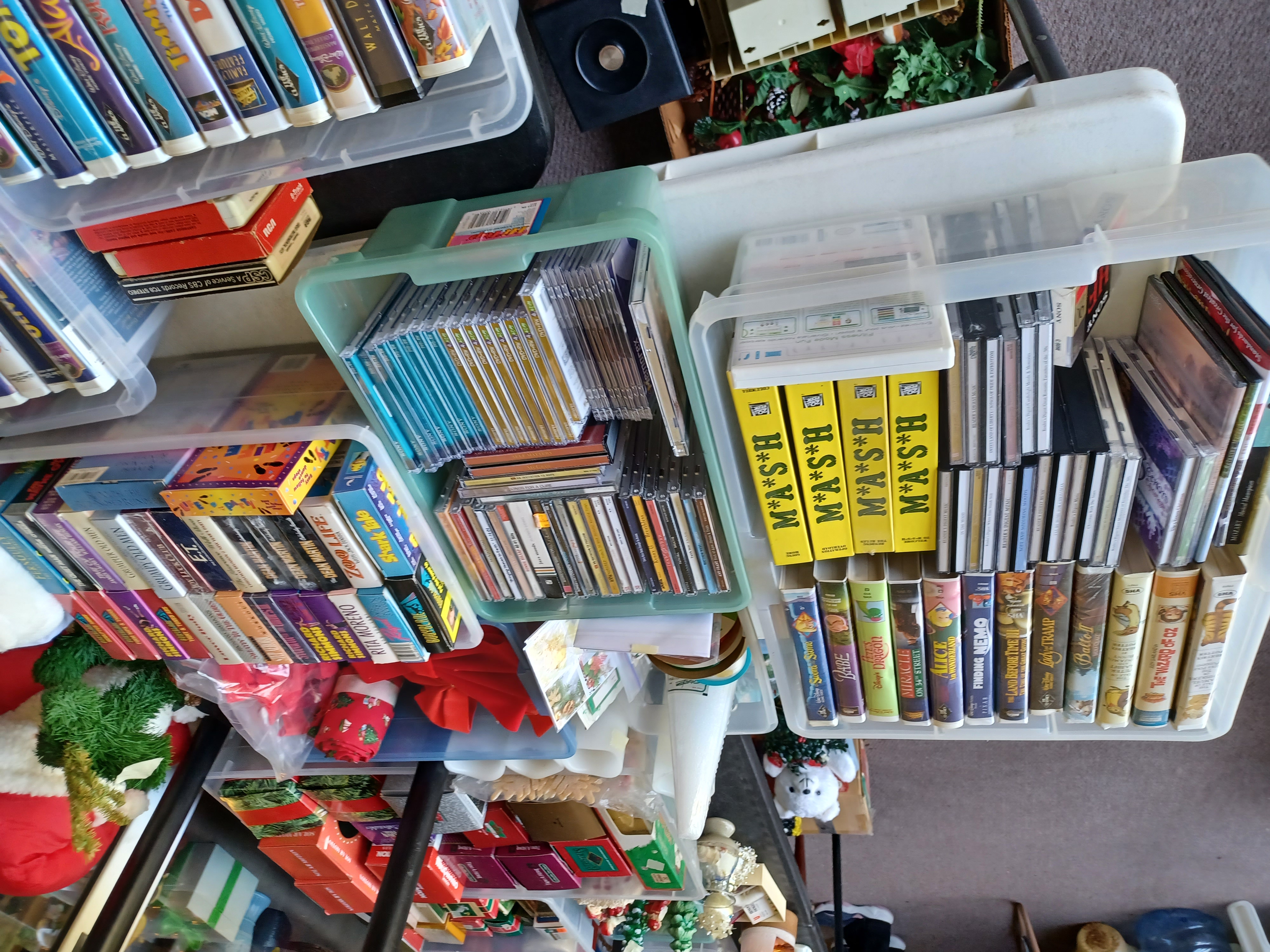 Overflow items including additional kitchenware, Christmas decorations, DVDs, VHS tapes, CDs, and area rugs.