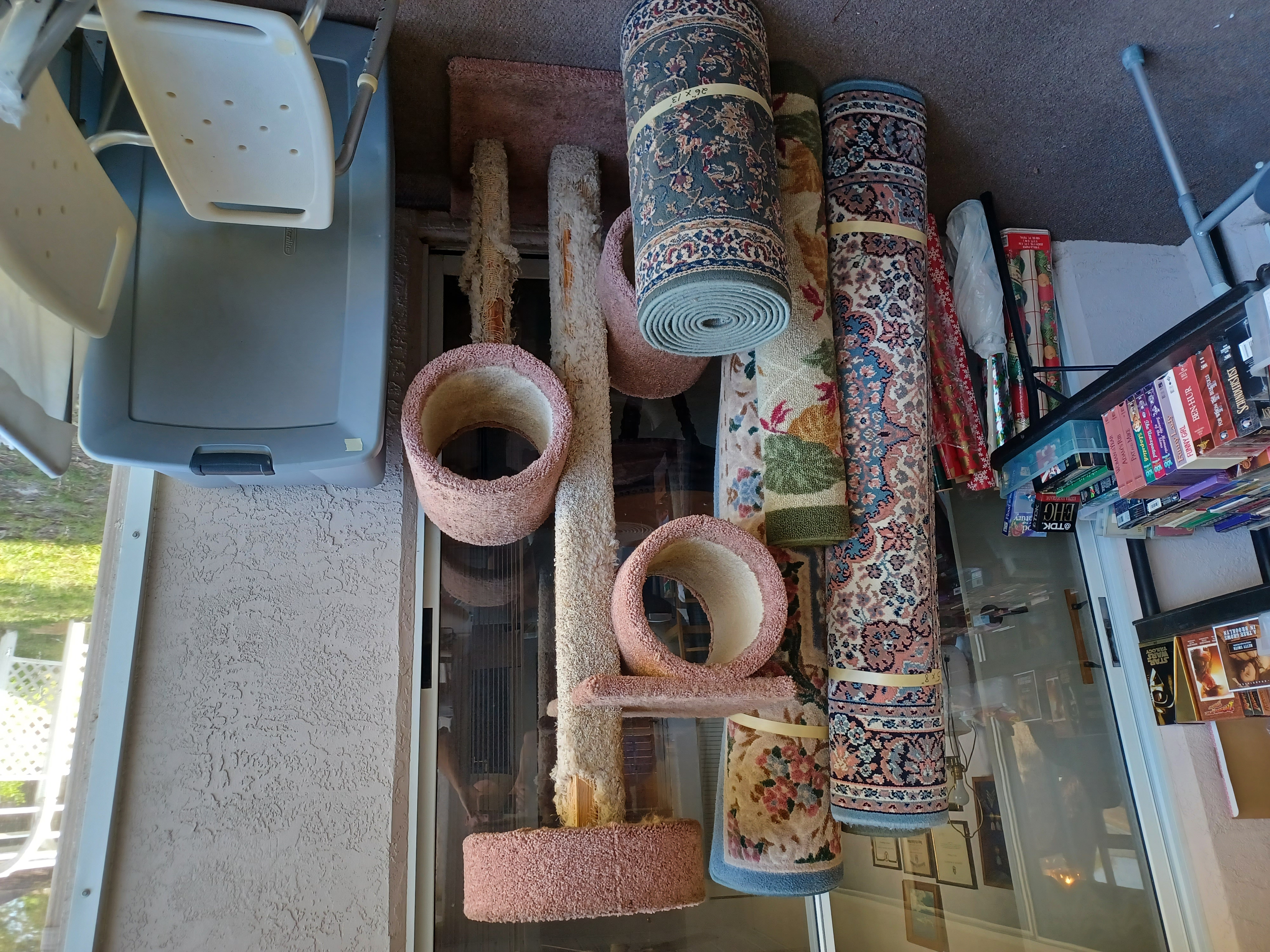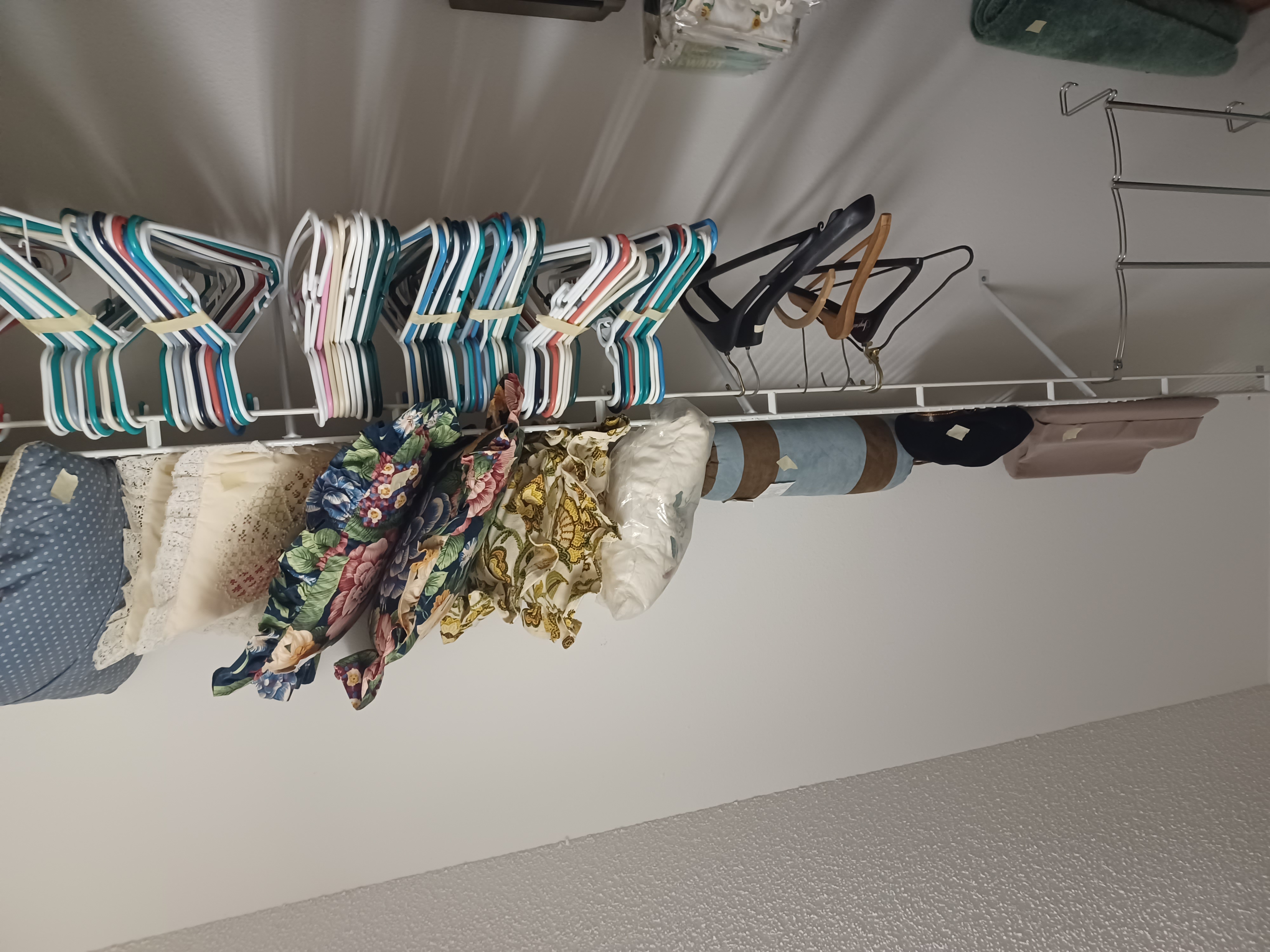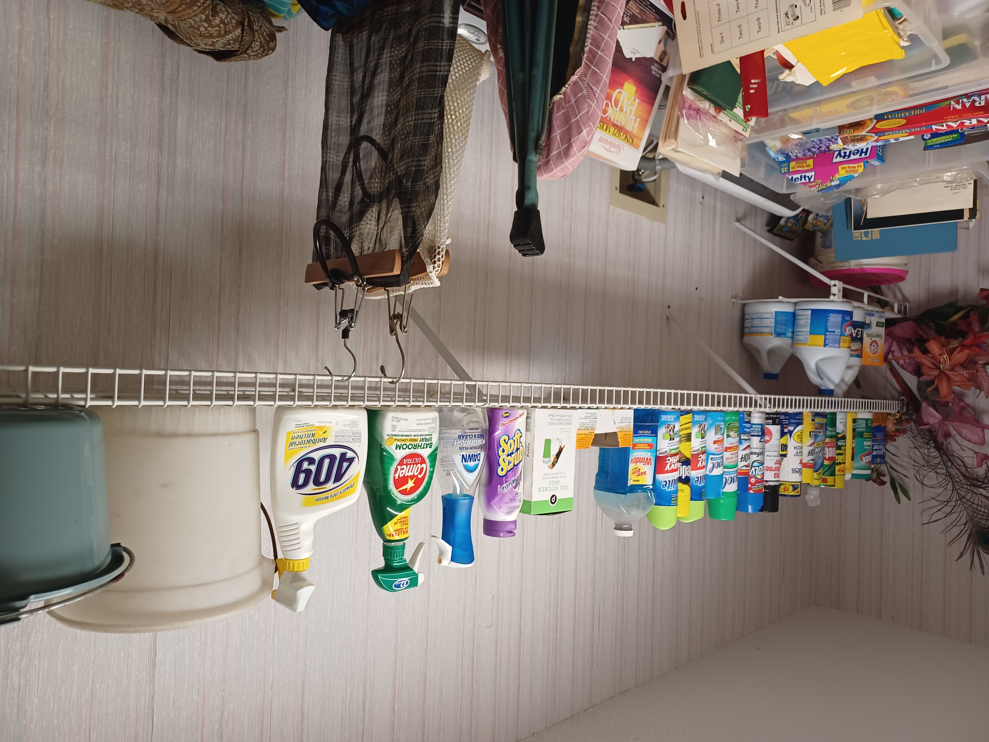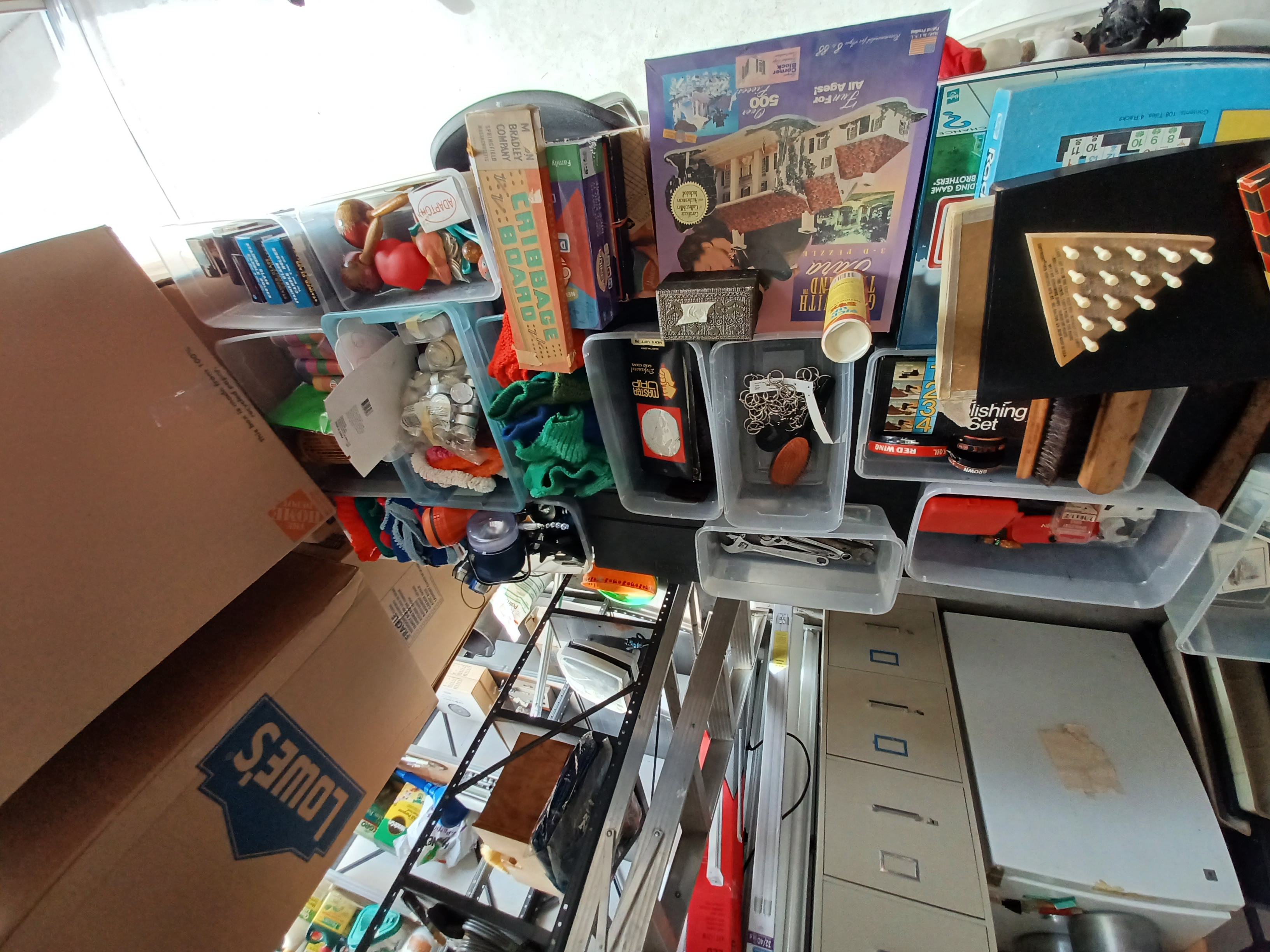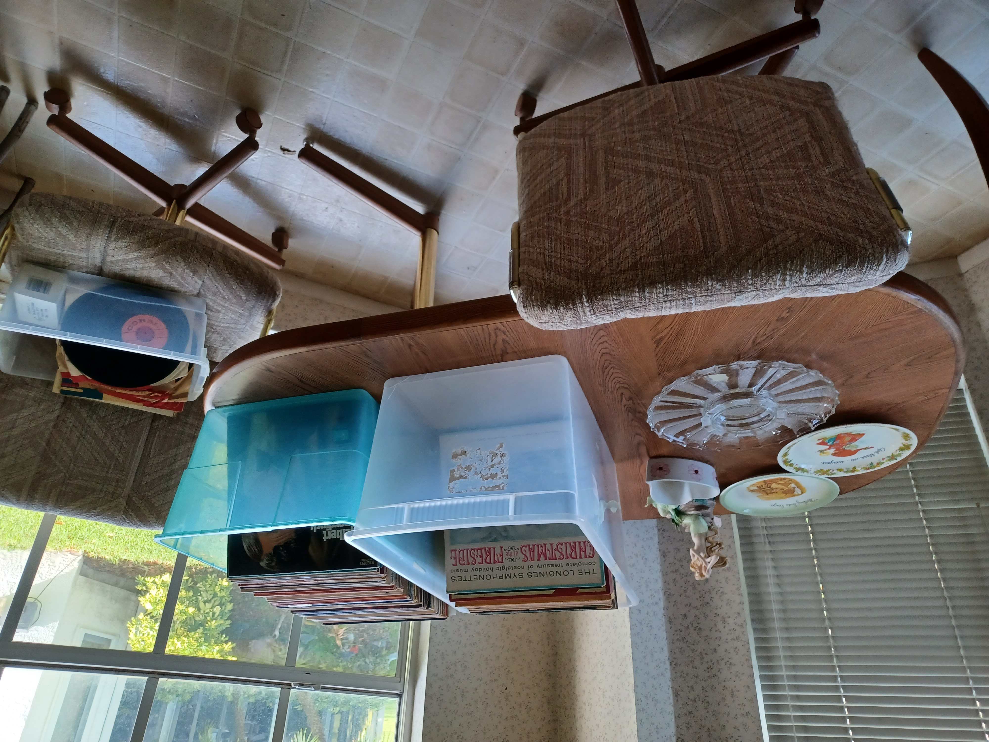 Overflow items including additional kitchenware, Christmas decorations, DVDs, VHS tapes, CDs, and area rugs.