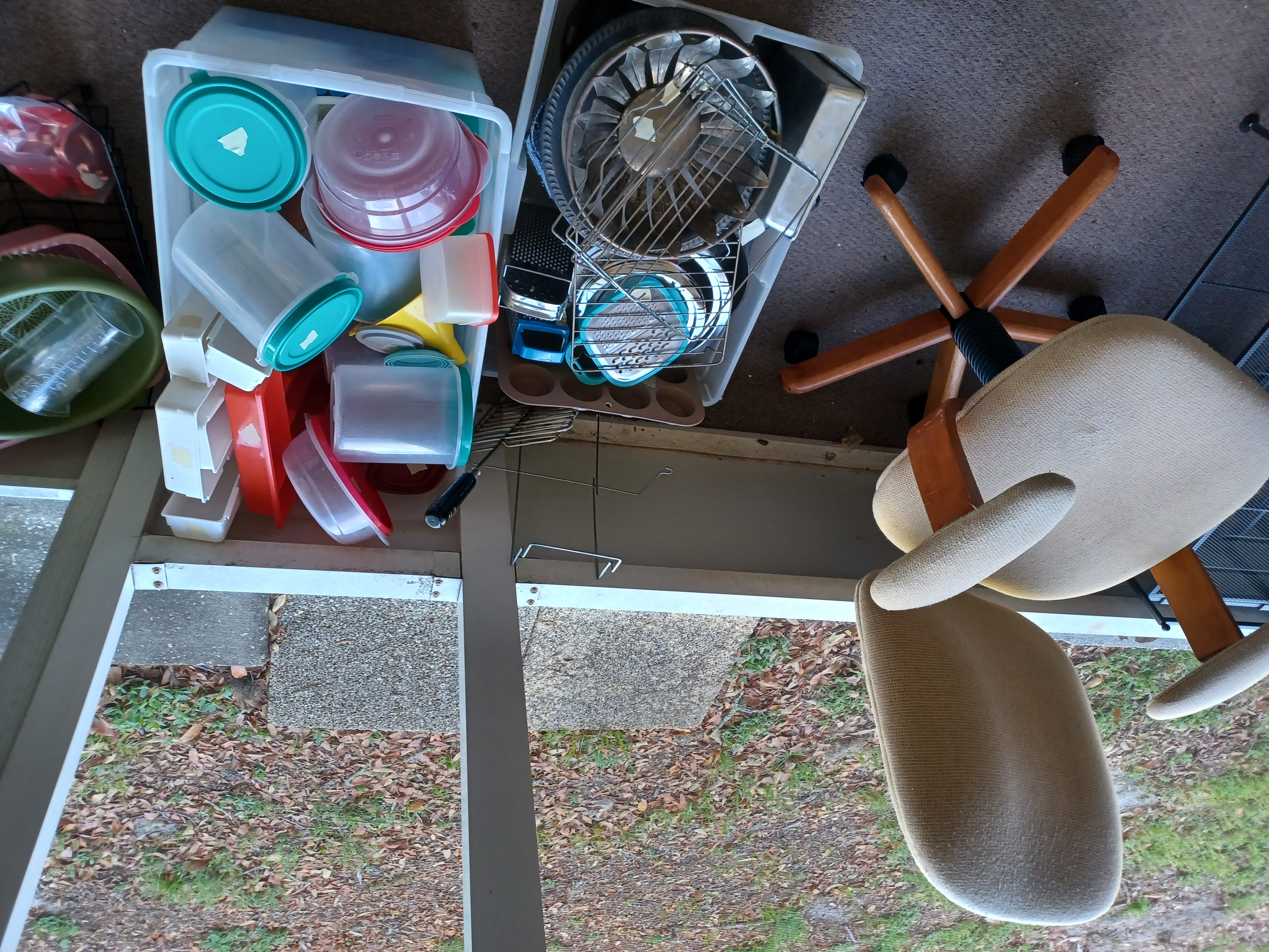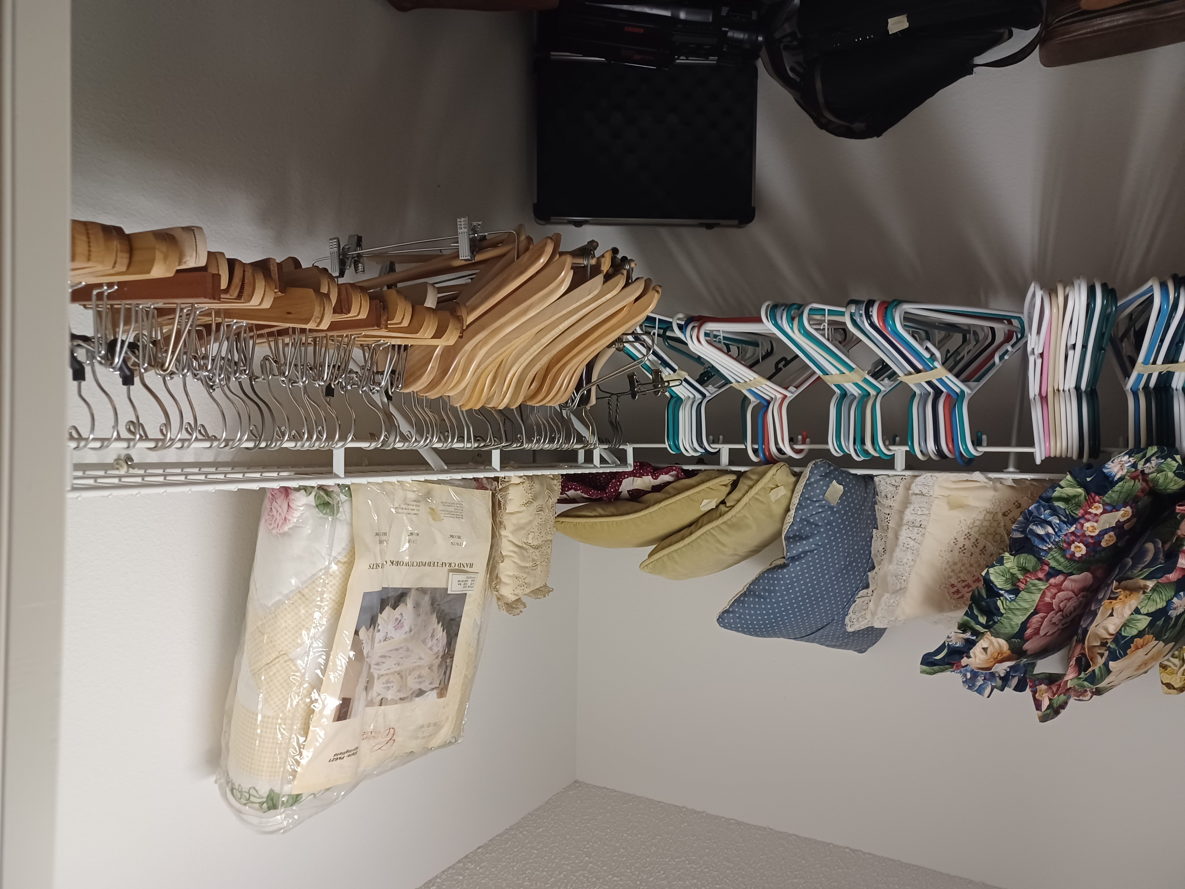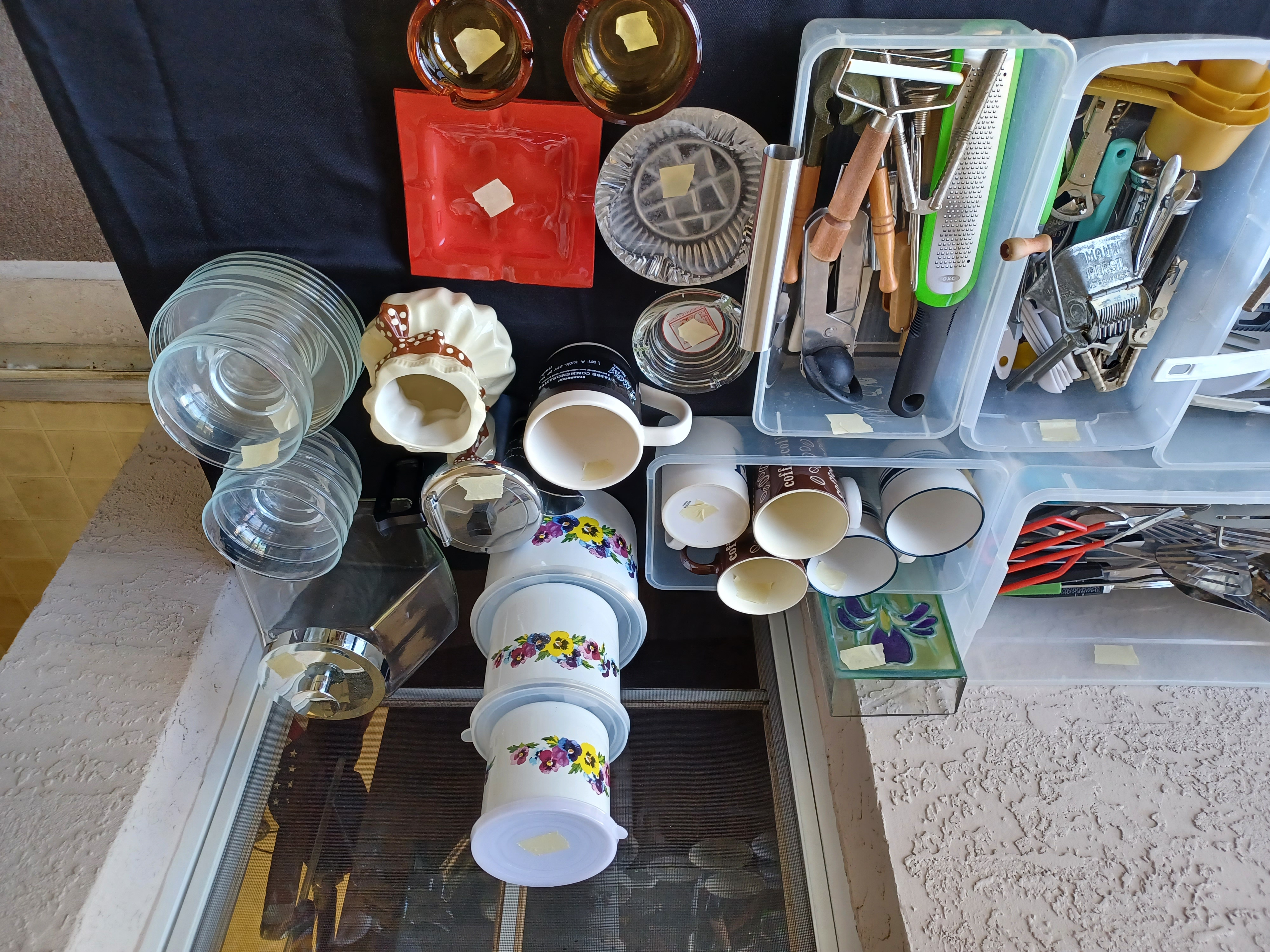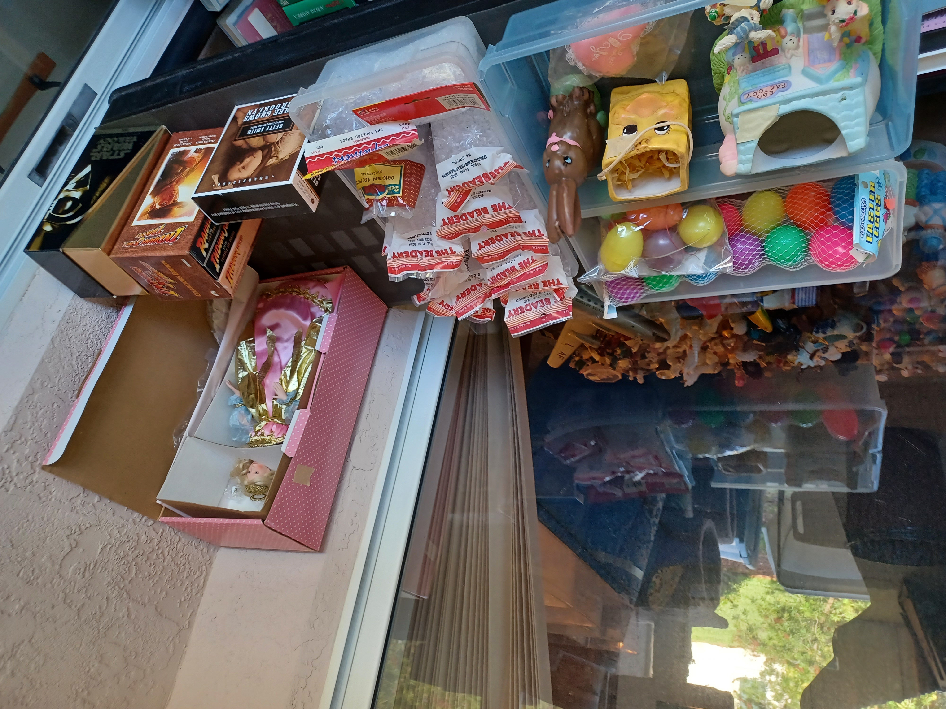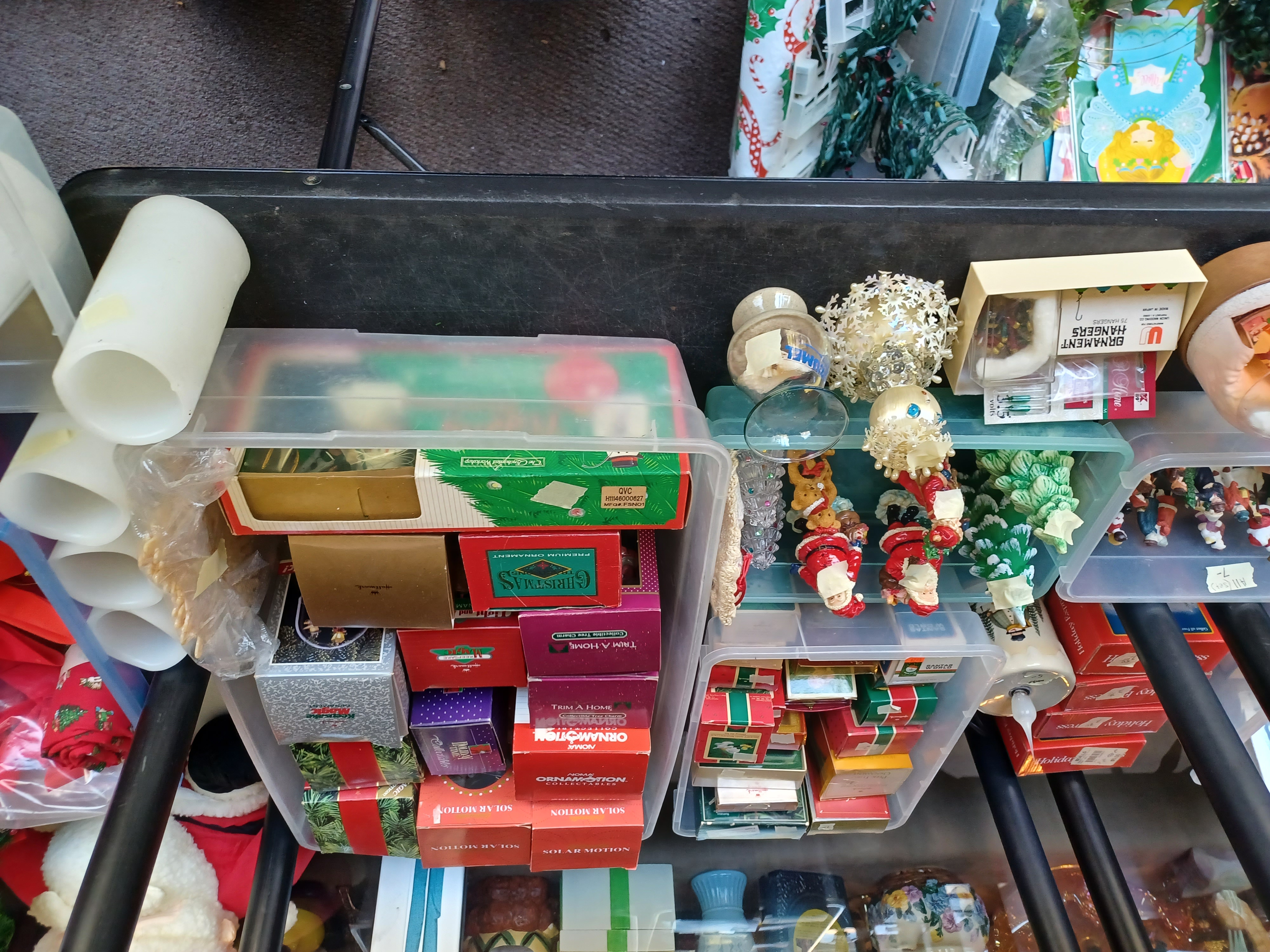 Overflow items including additional kitchenware, Christmas decorations, DVDs, VHS tapes, CDs, and area rugs.
