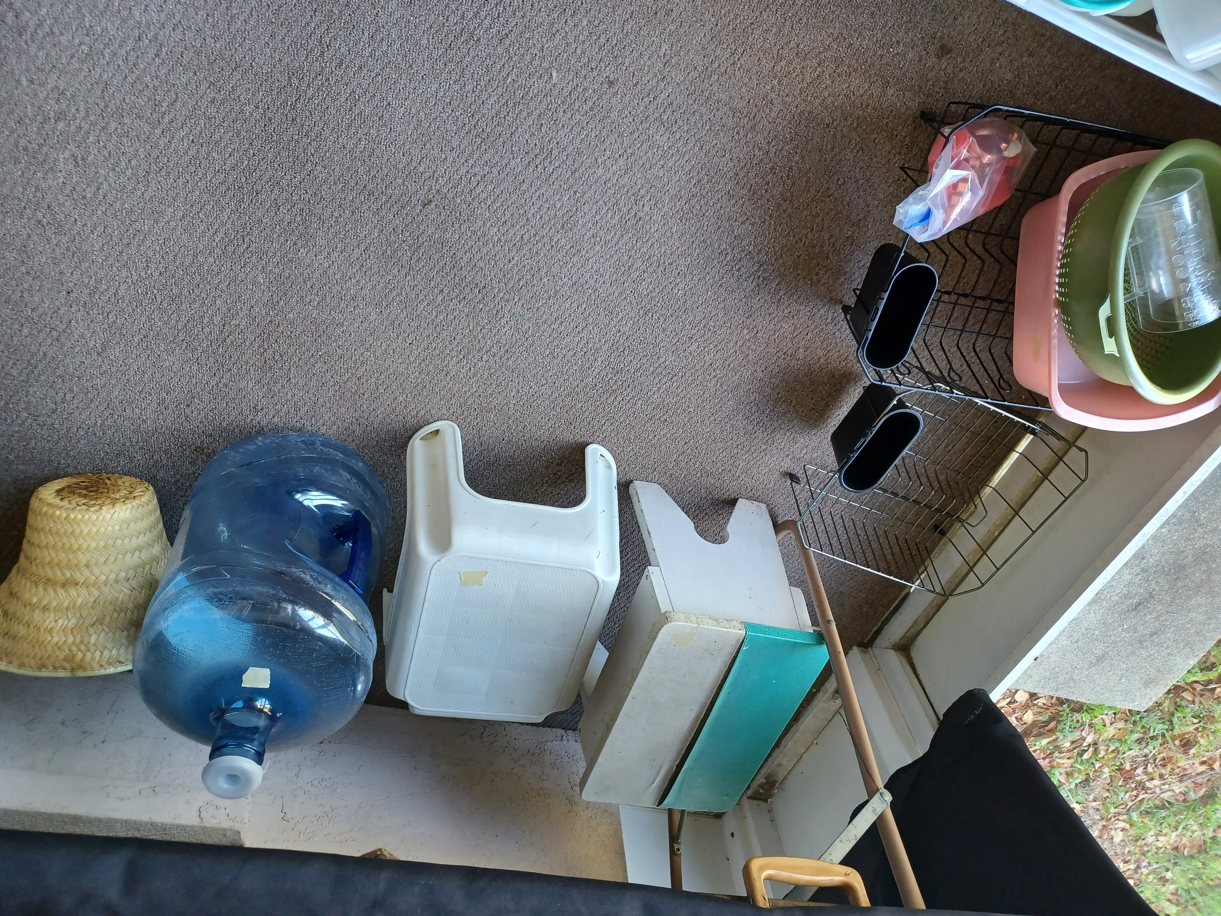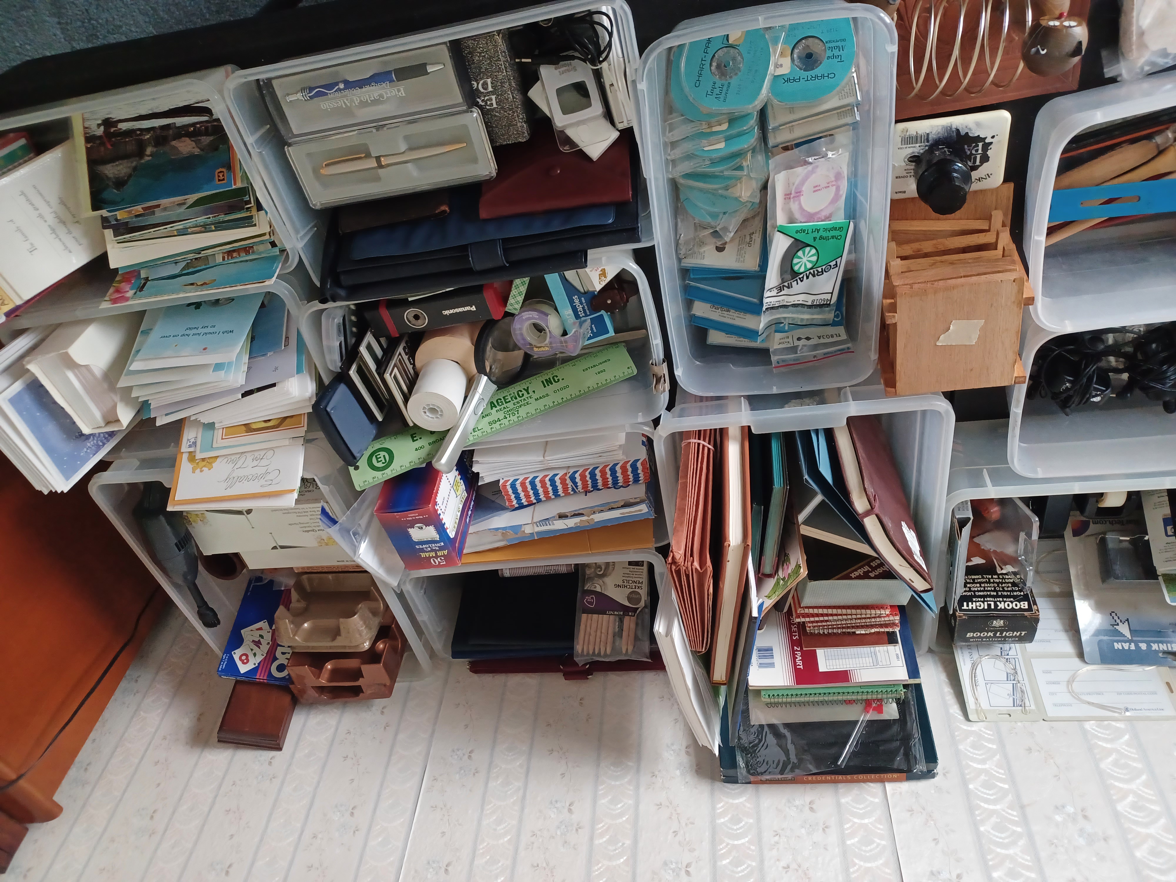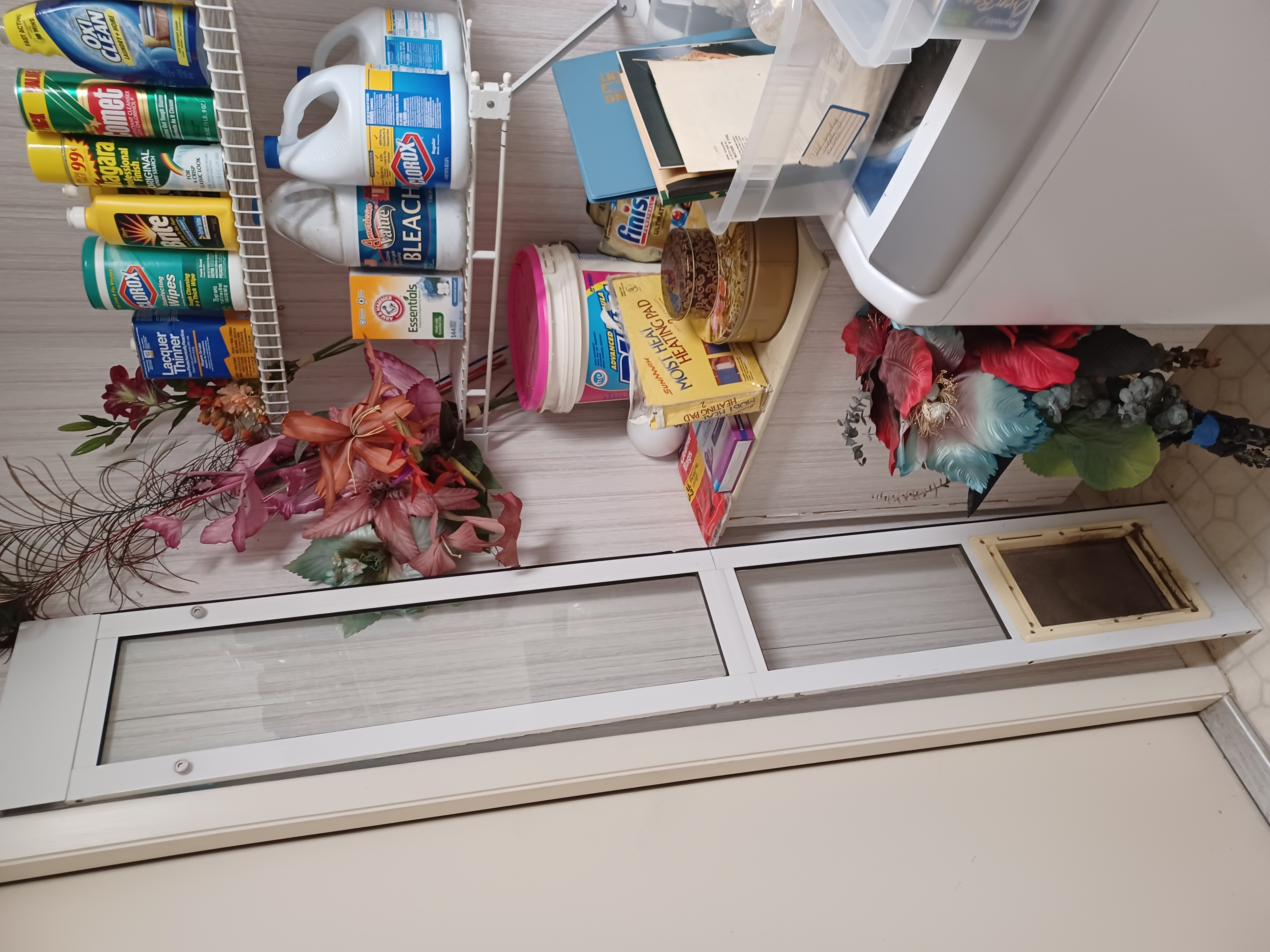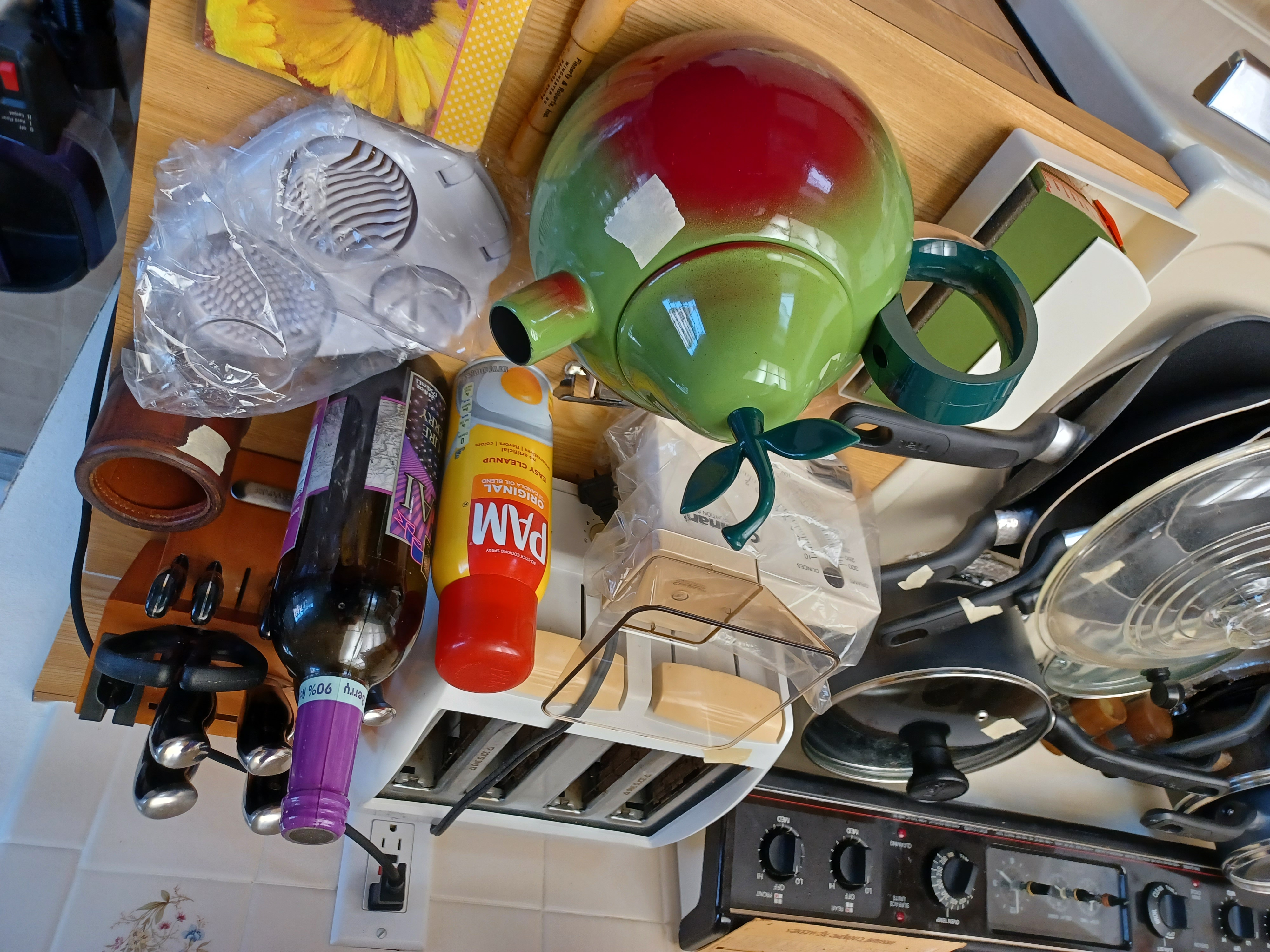 Overflow items including additional kitchenware, Christmas decorations, DVDs, VHS tapes, CDs, and area rugs.