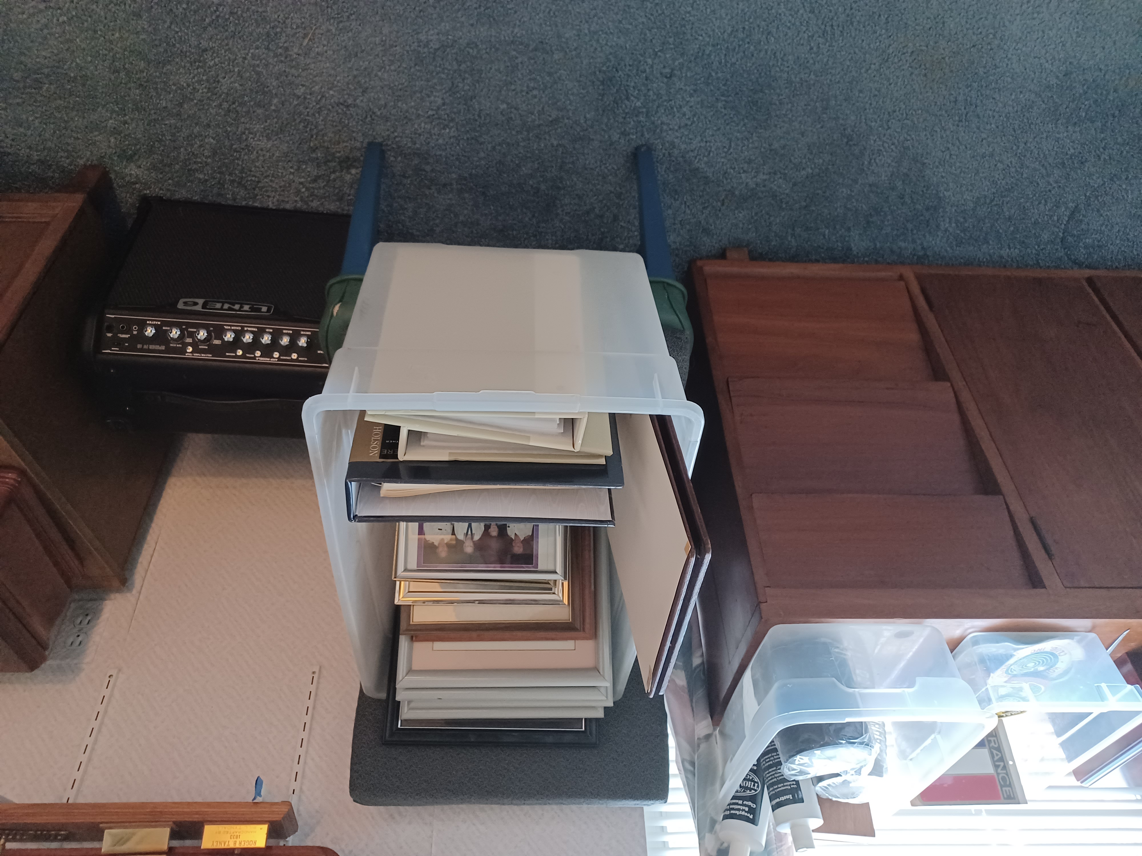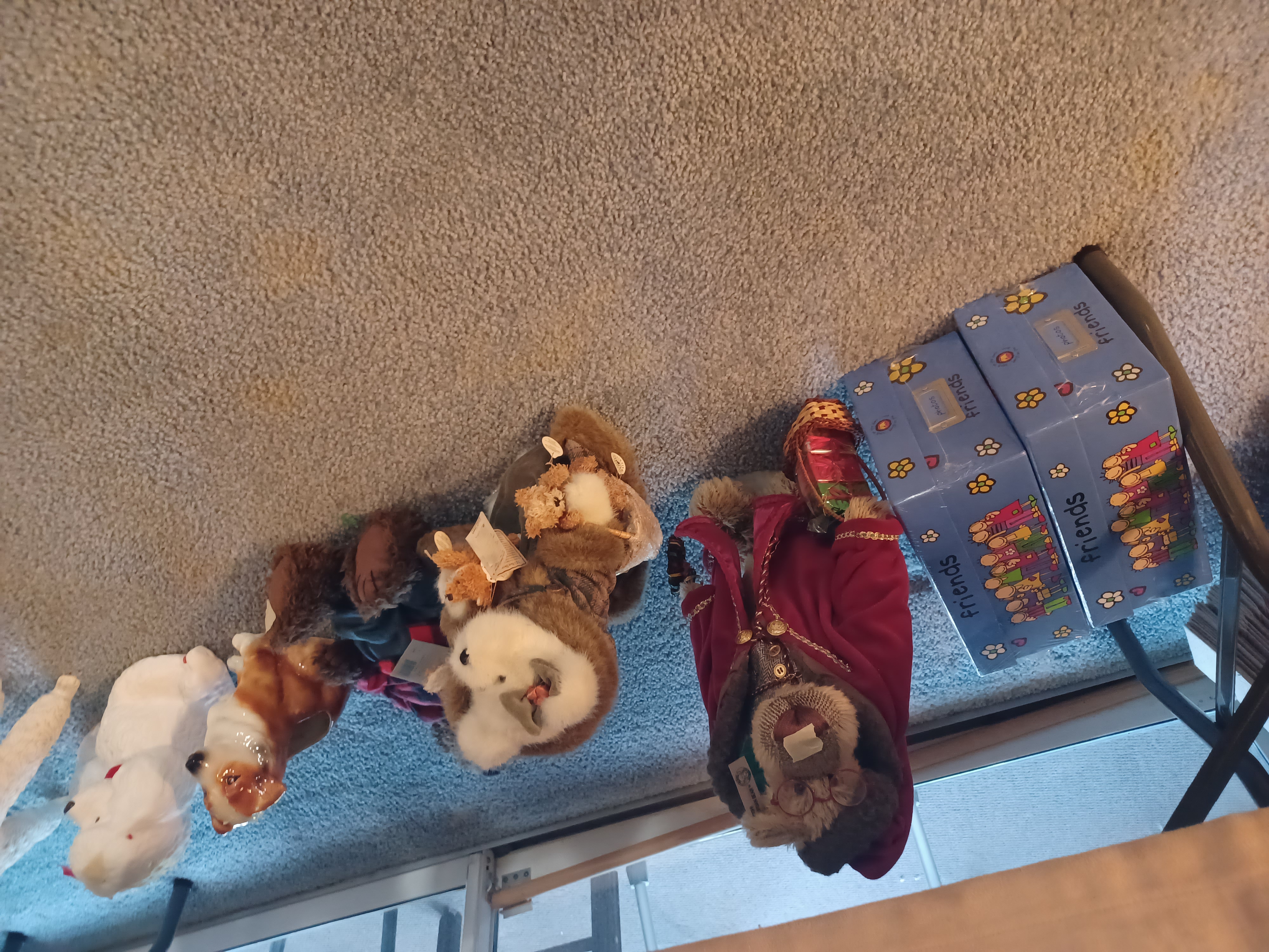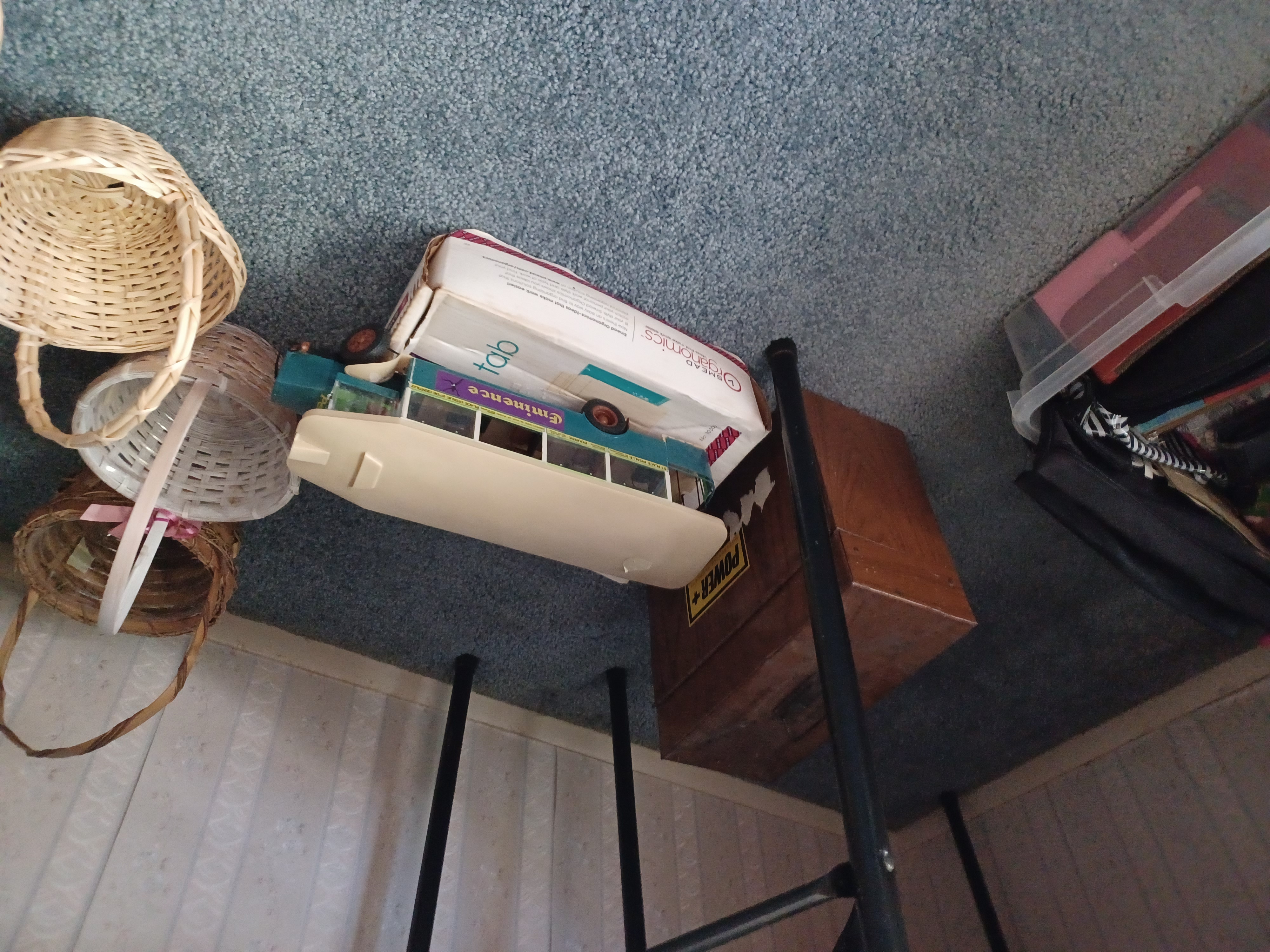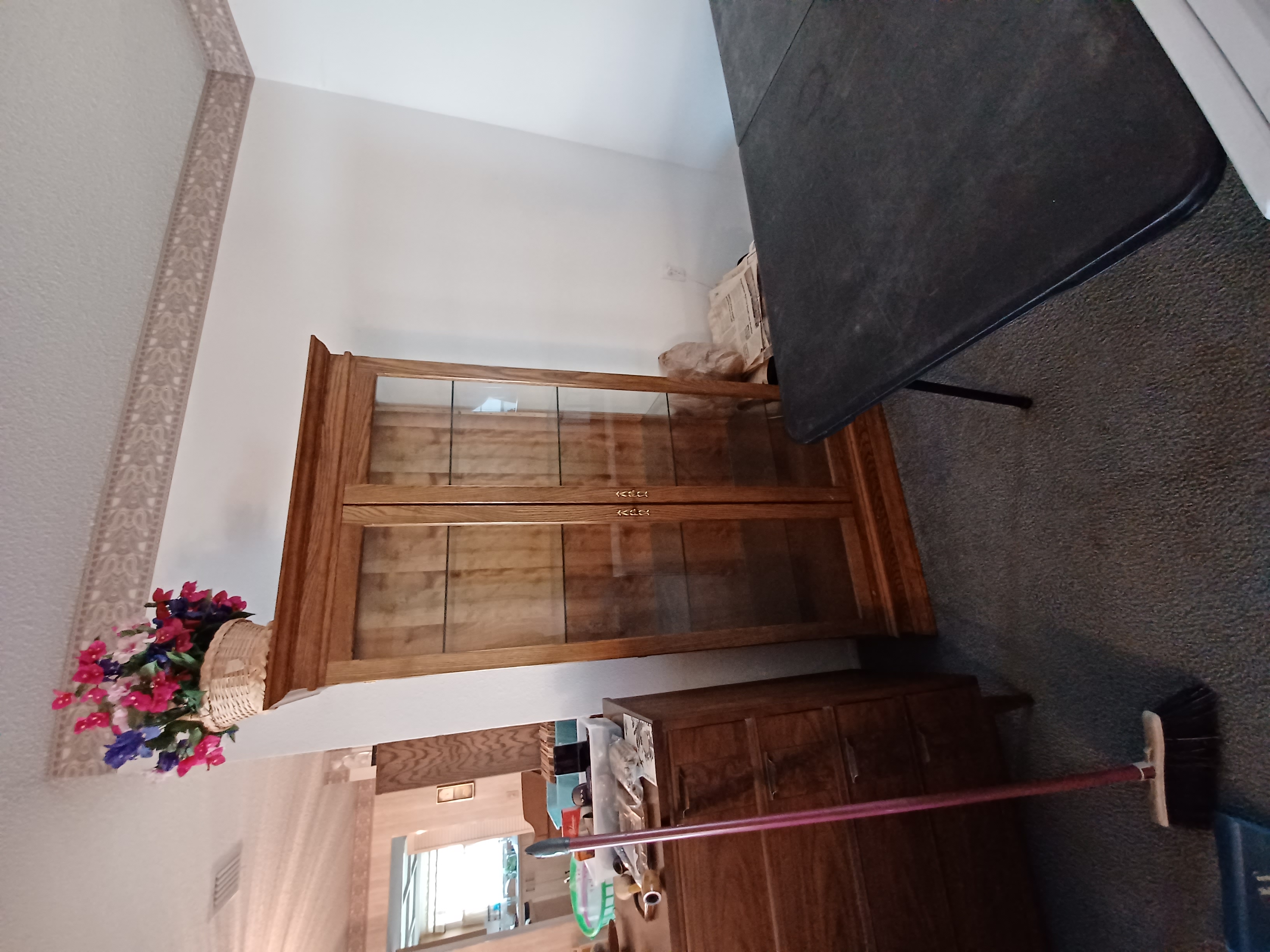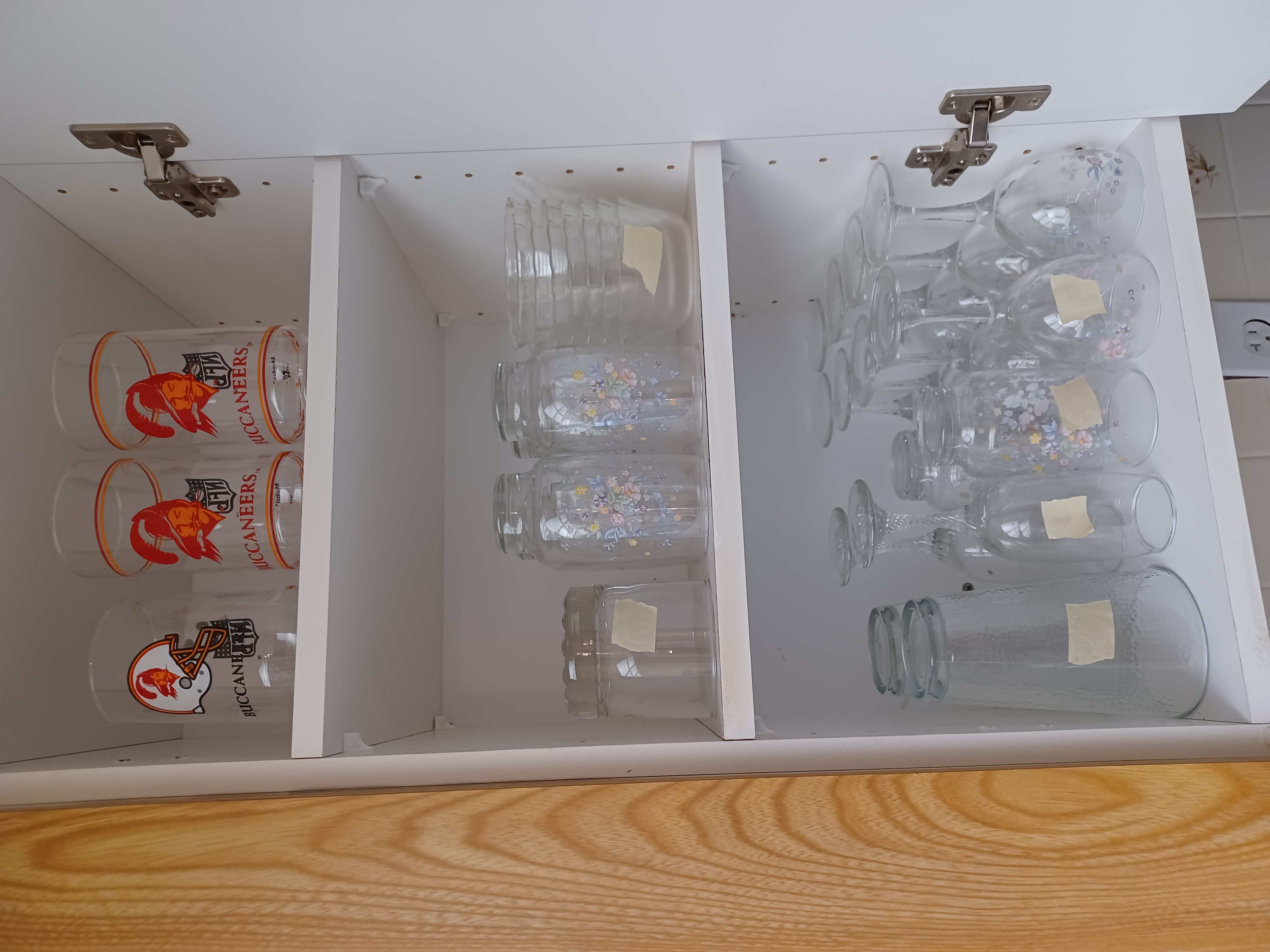 Overflow items including additional kitchenware, Christmas decorations, DVDs, VHS tapes, CDs, and area rugs.