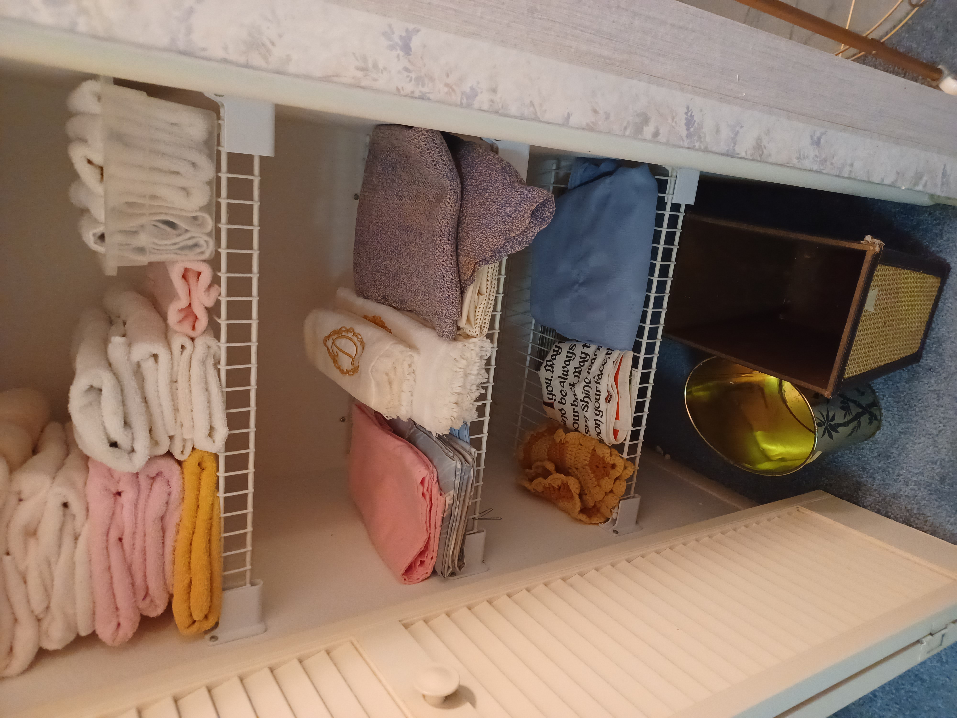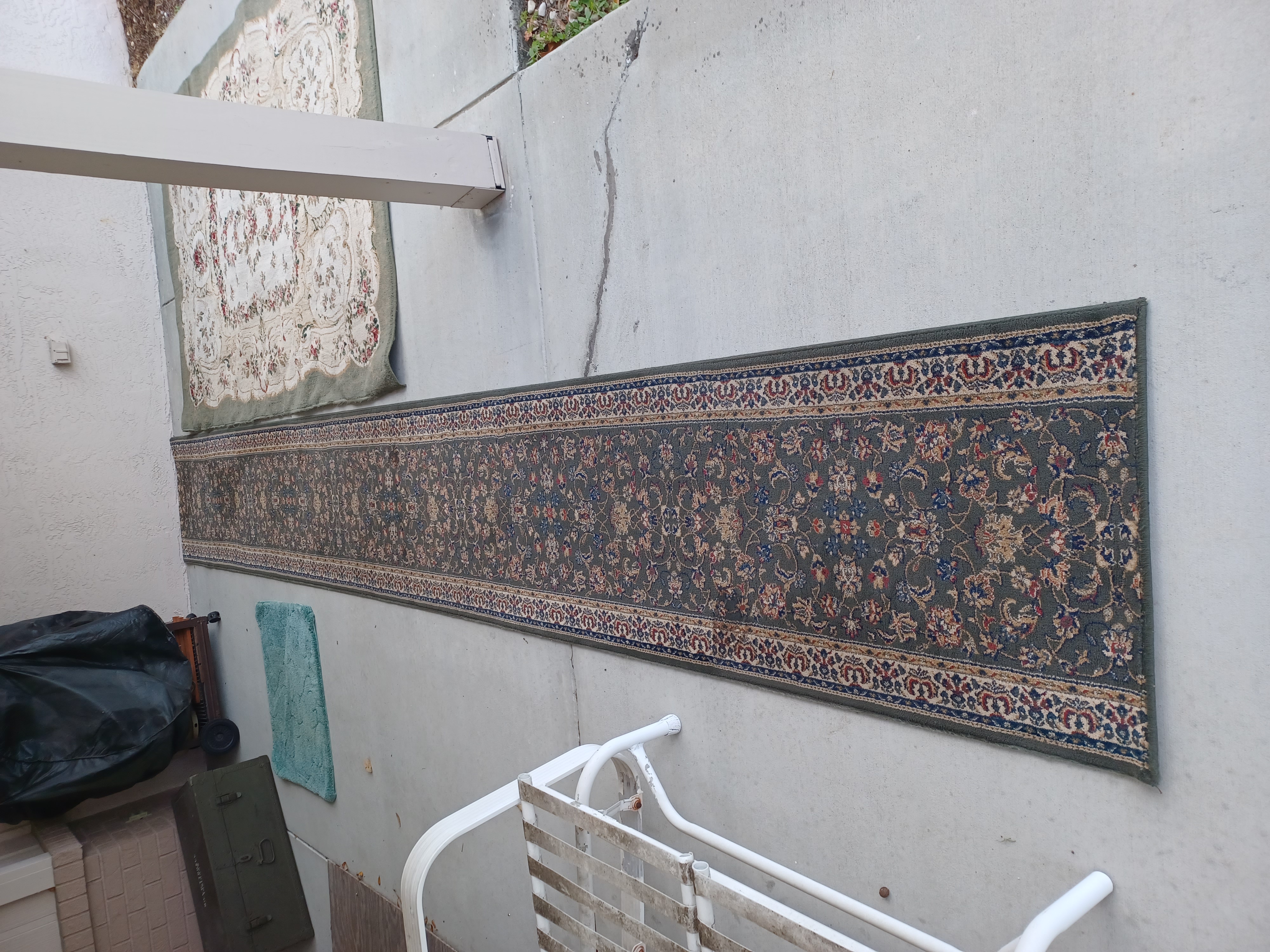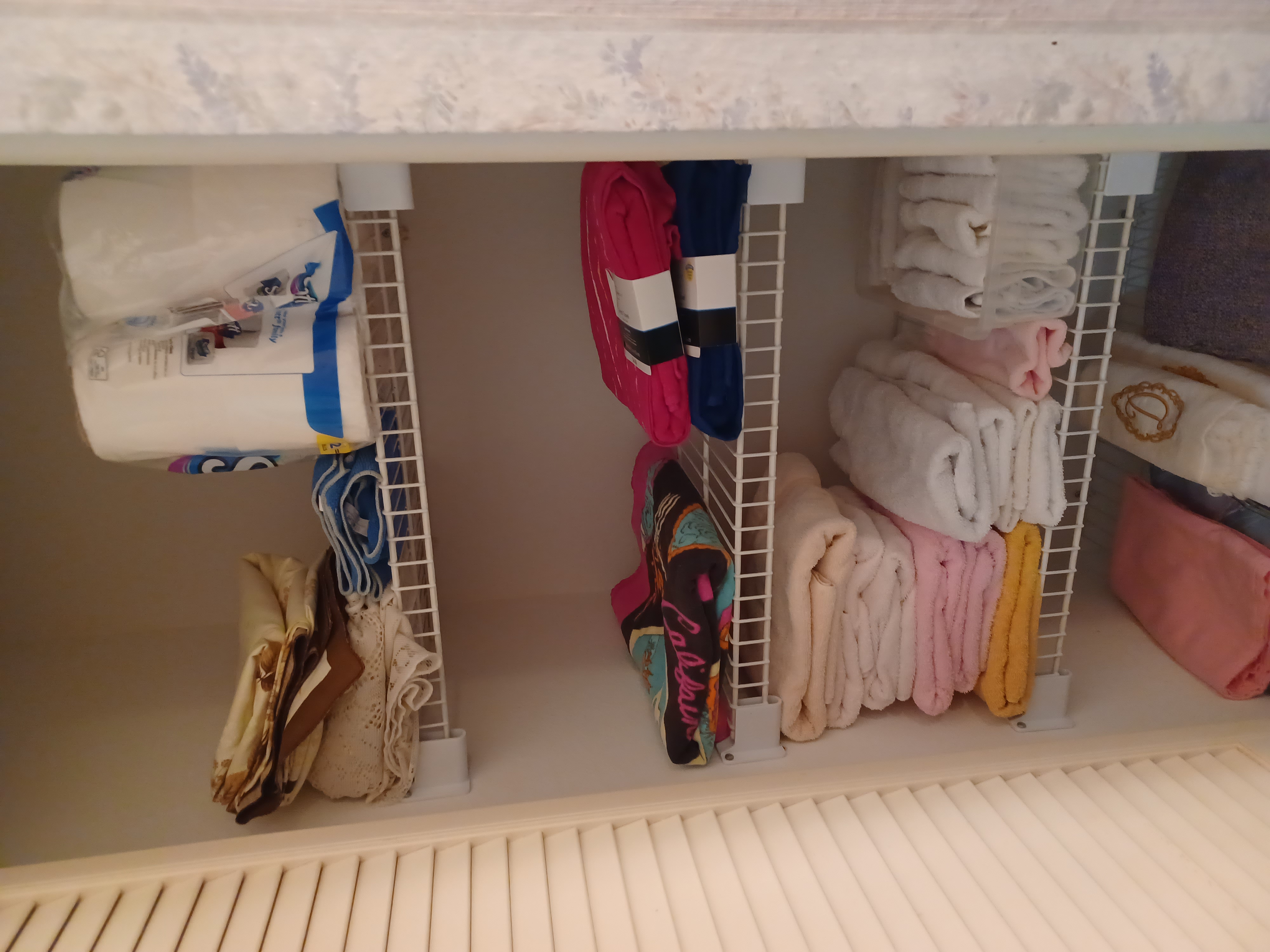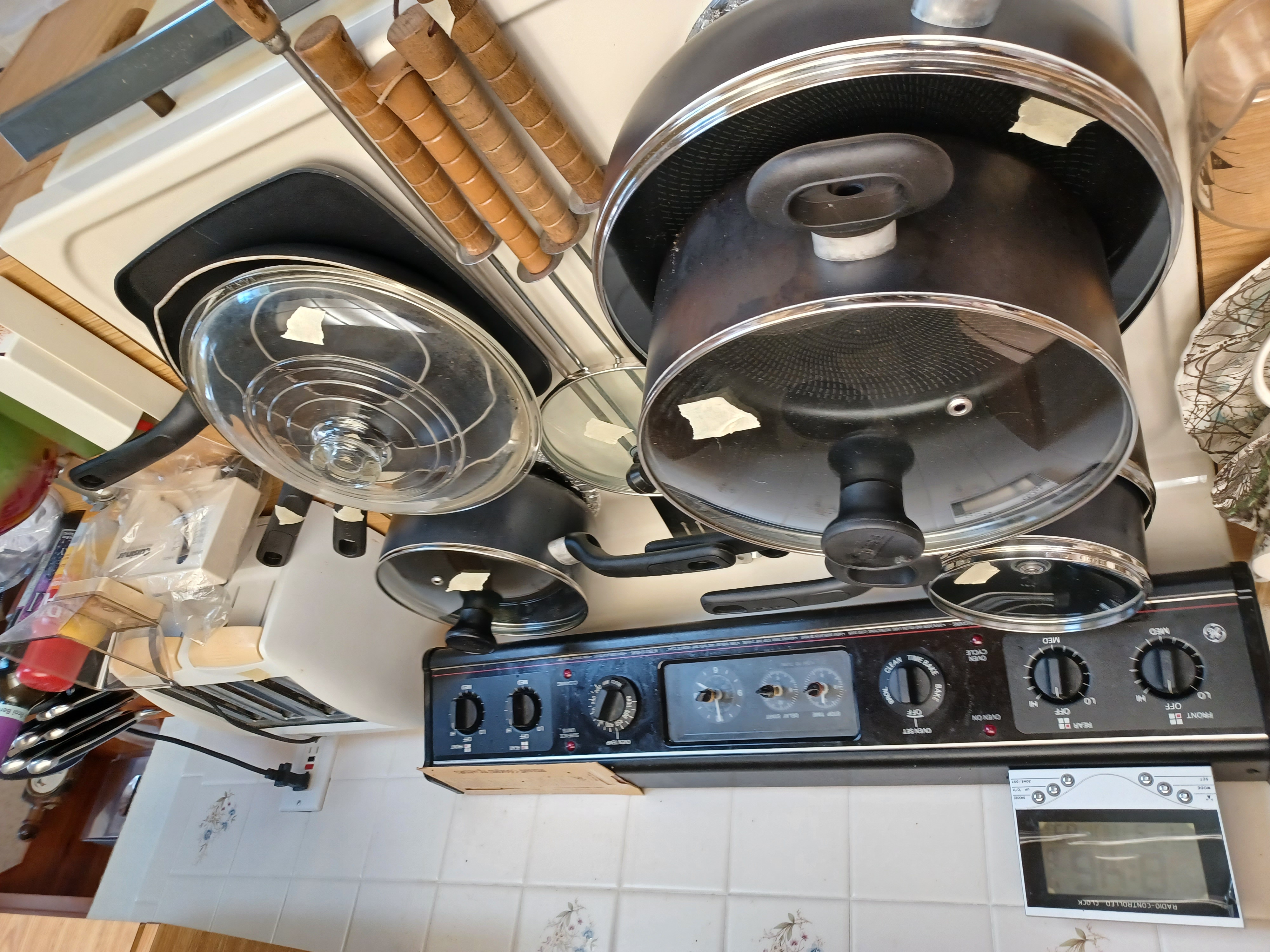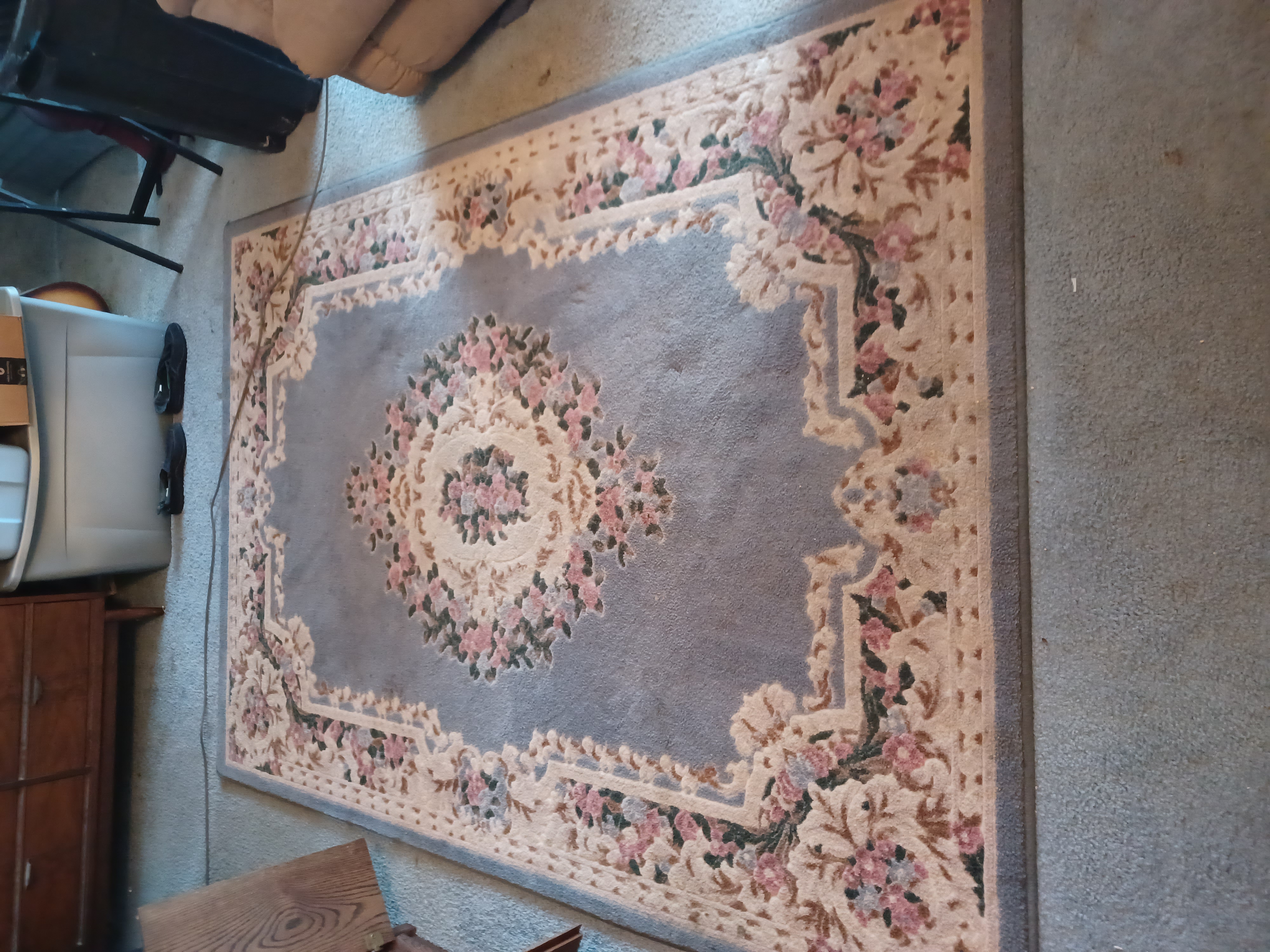 Overflow items including additional kitchenware, Christmas decorations, DVDs, VHS tapes, CDs, and area rugs.
