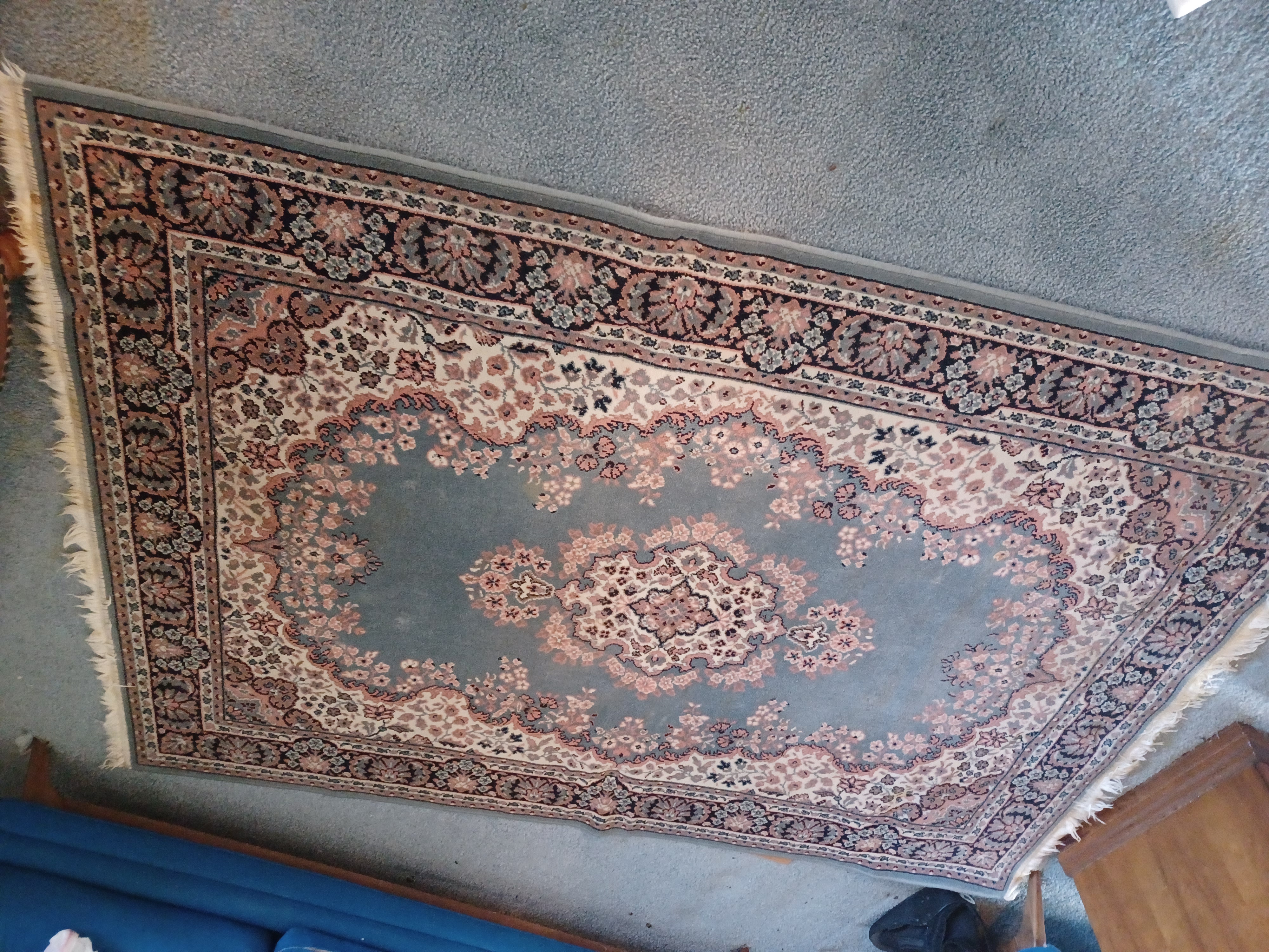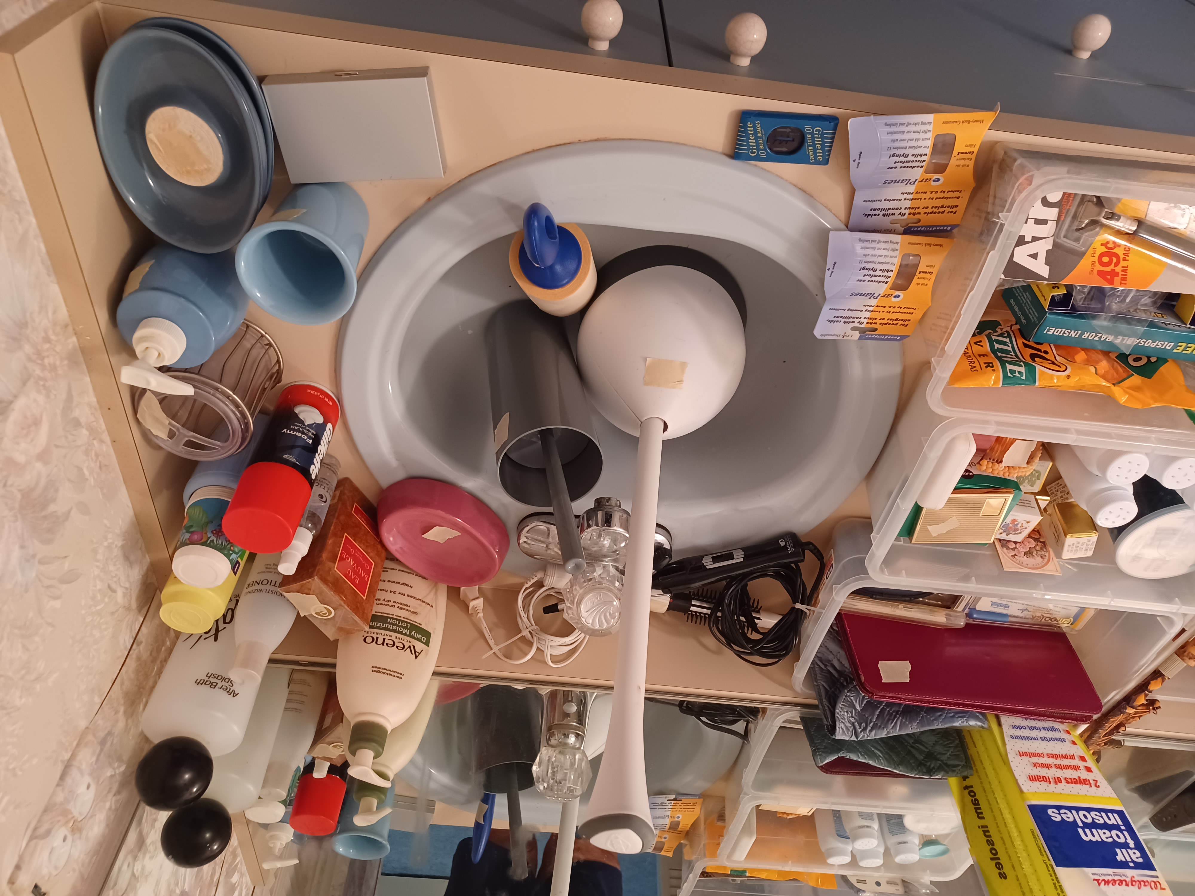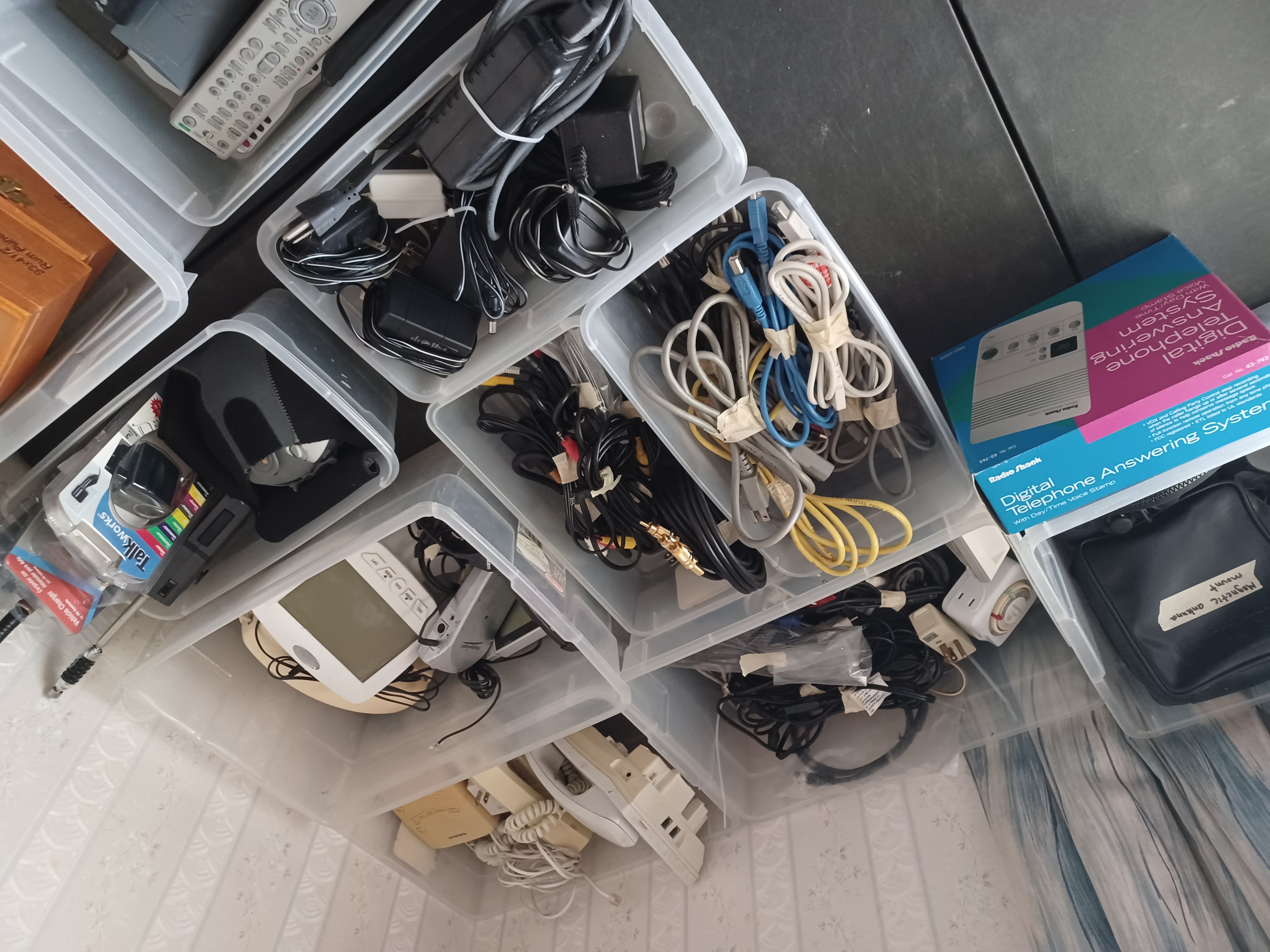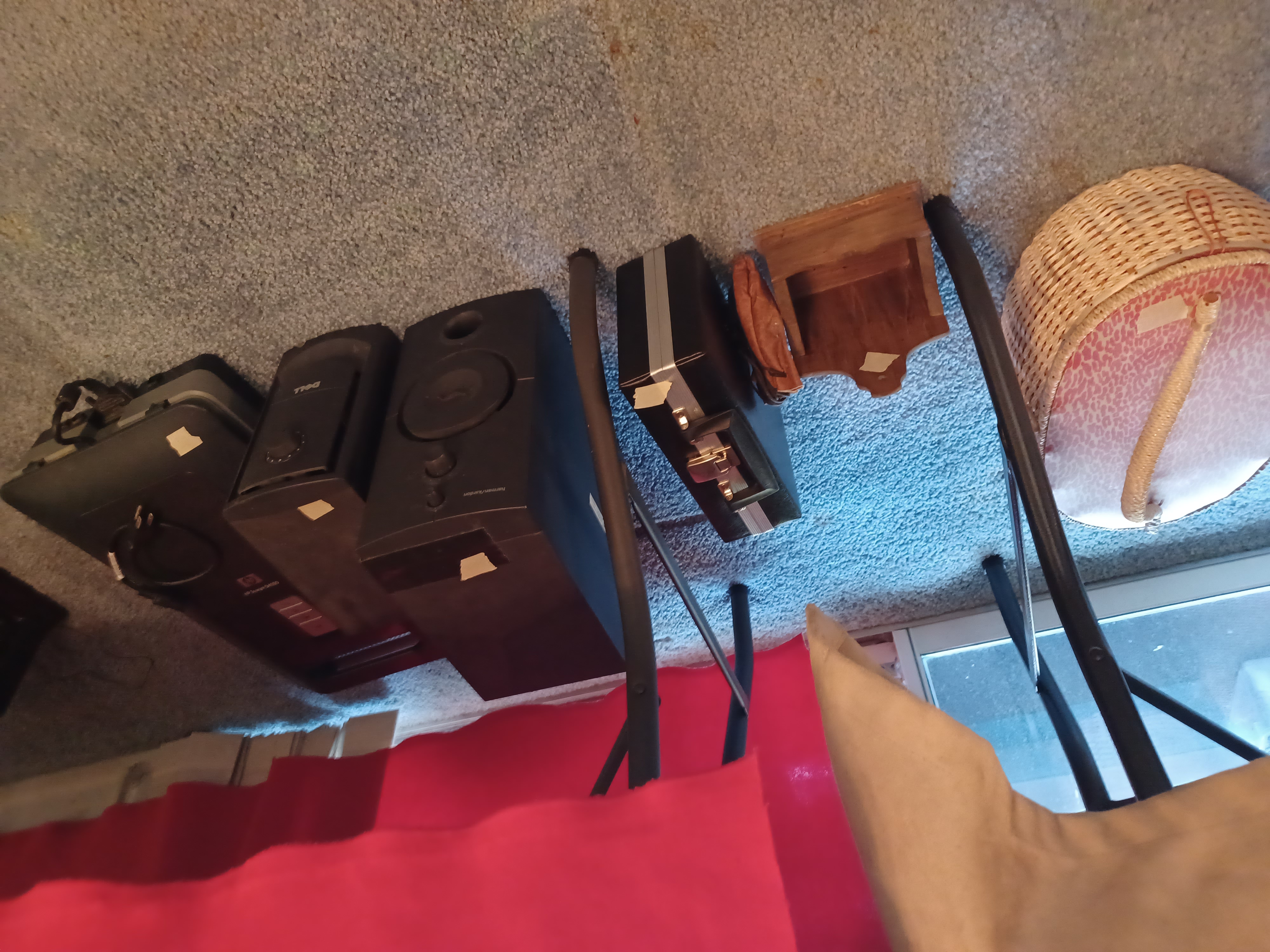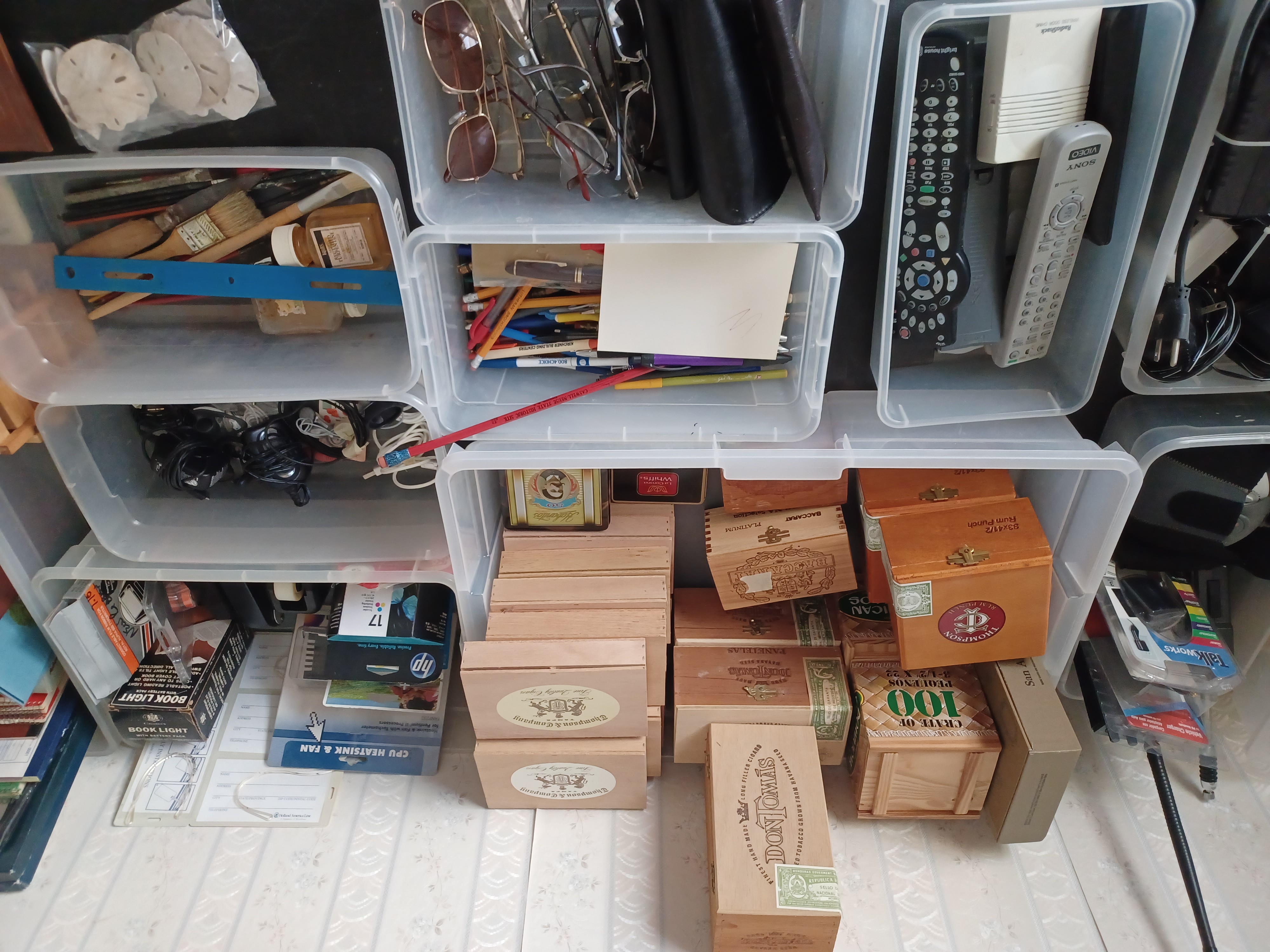 Overflow items including additional kitchenware, Christmas decorations, DVDs, VHS tapes, CDs, and area rugs.