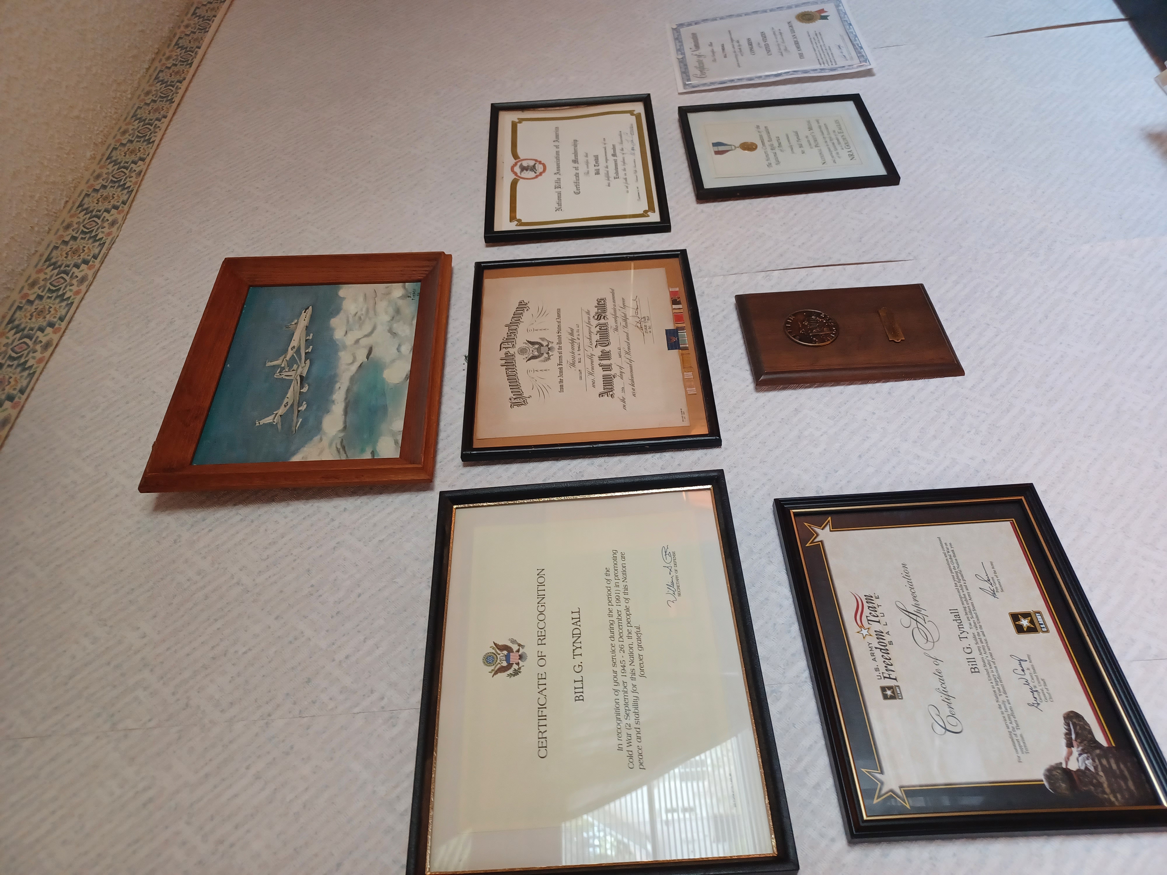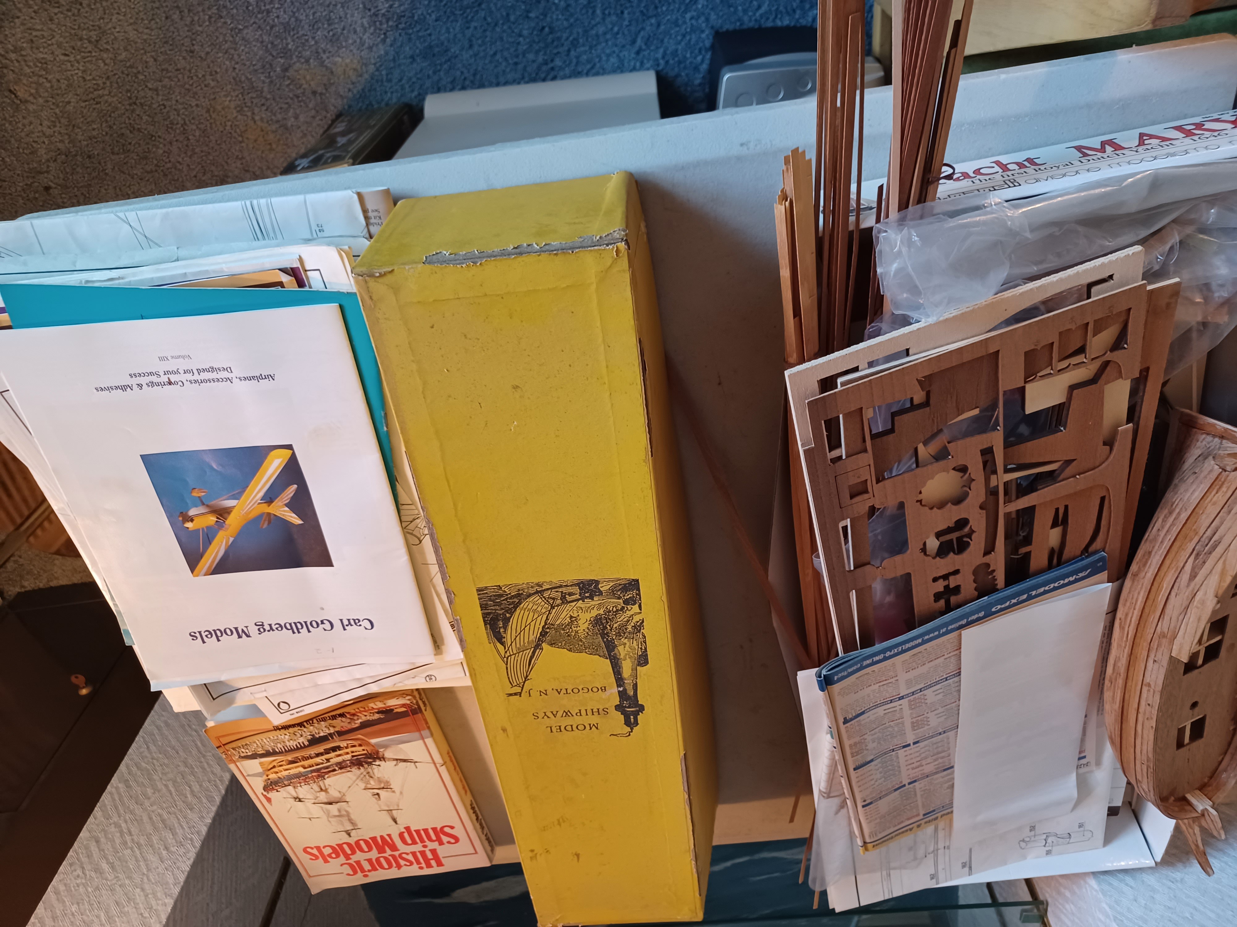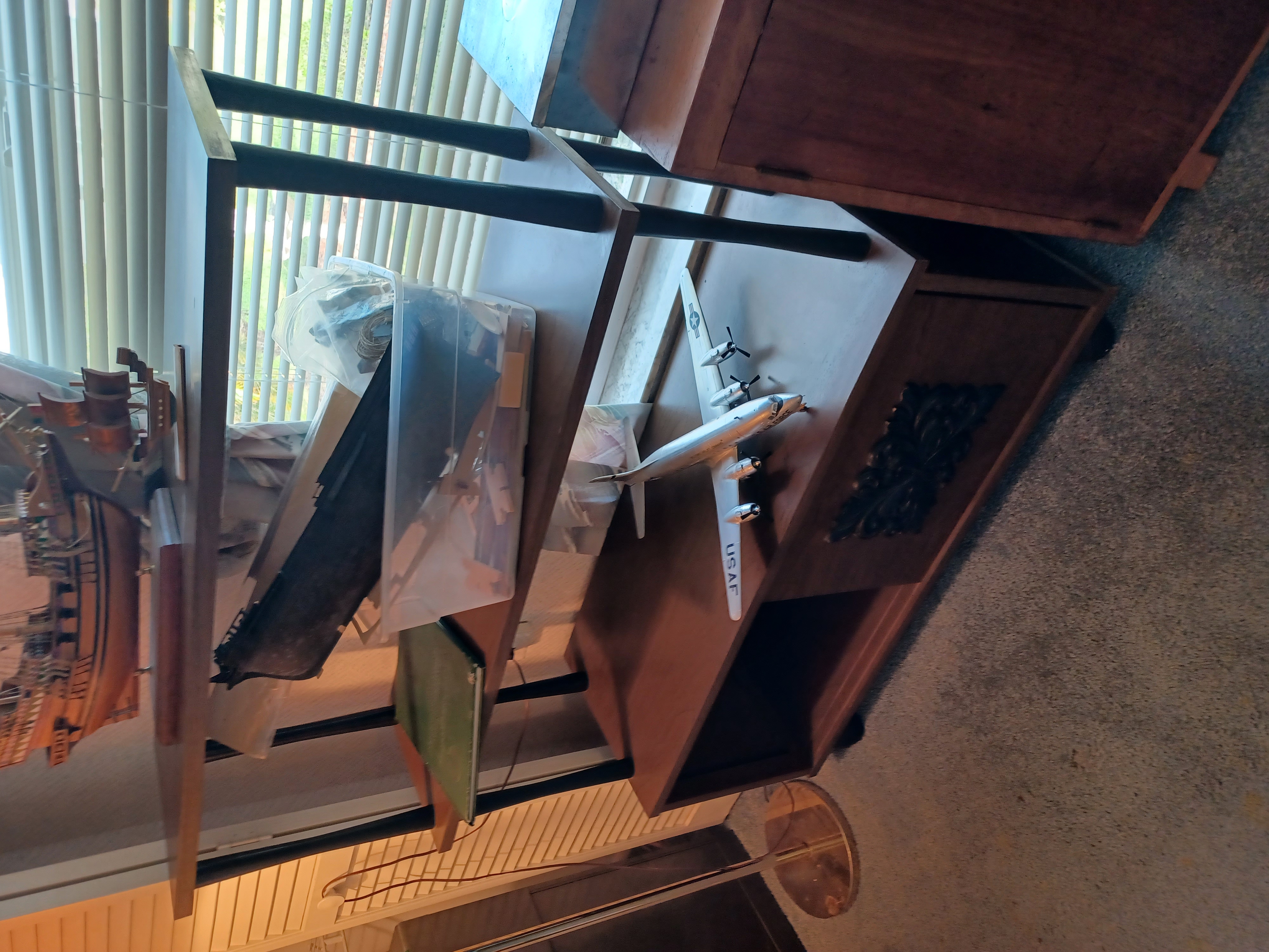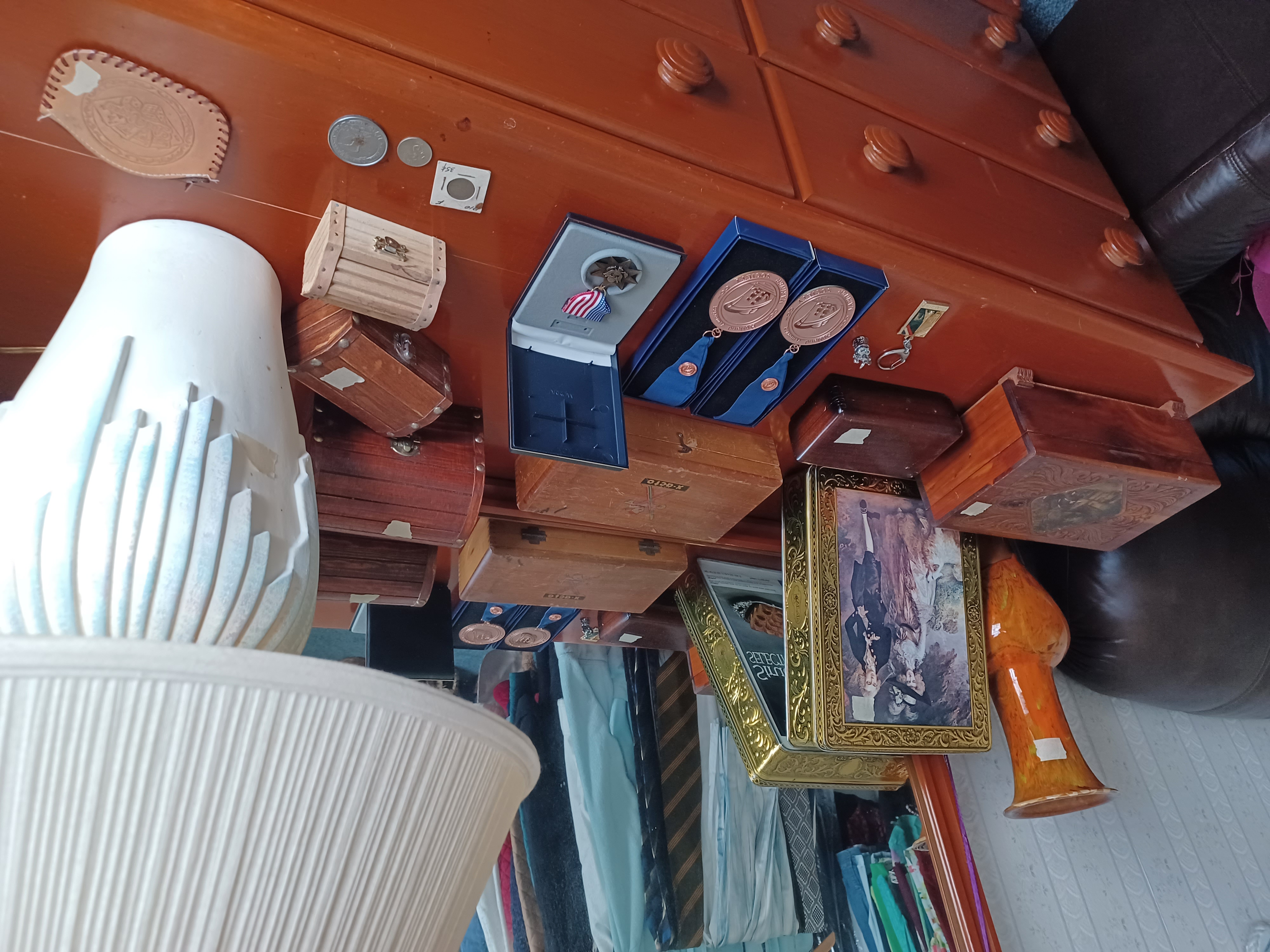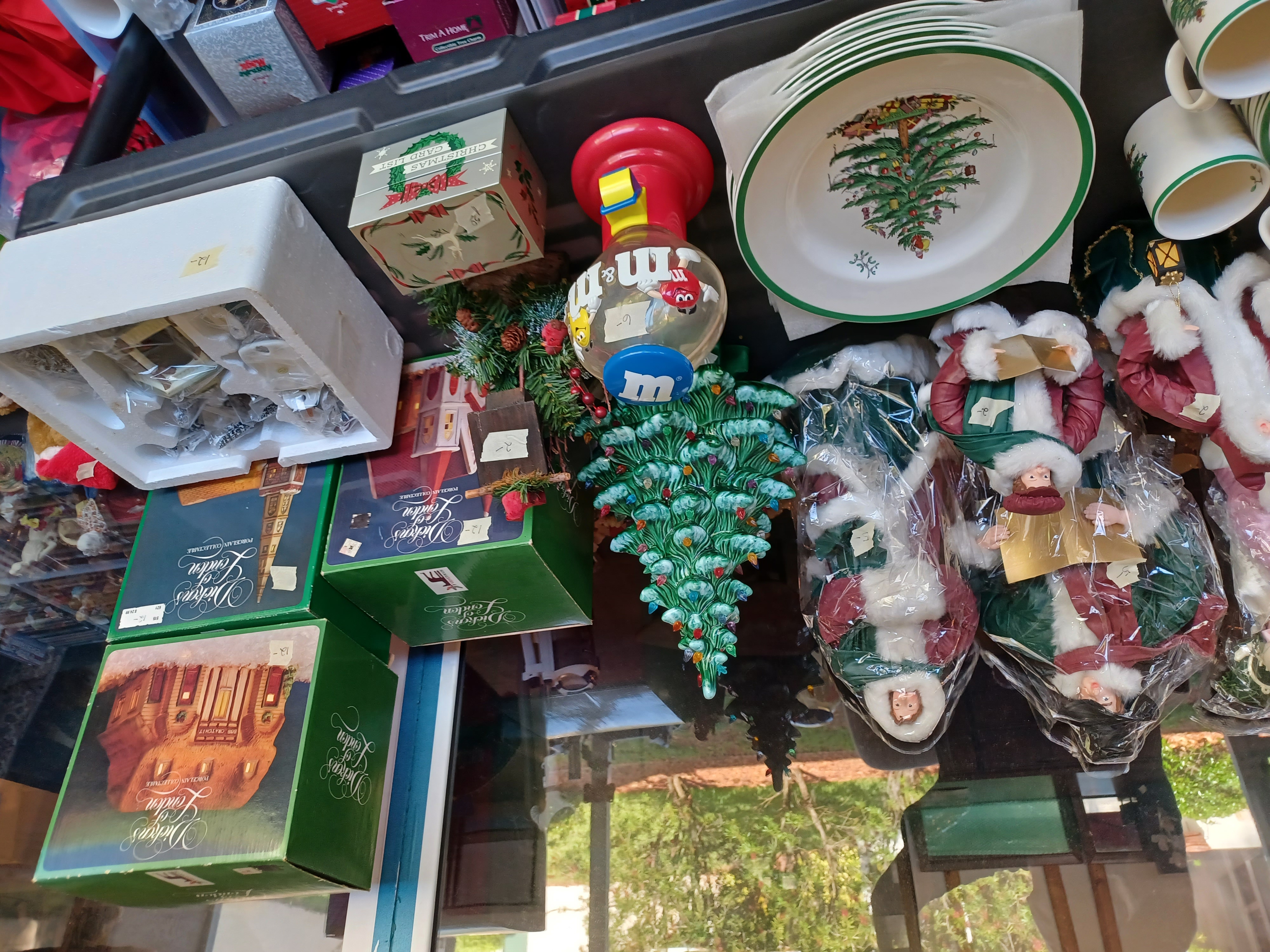 Items from France, WWII memorabilia (including medals, a footlocker, and military uniform), large wooden model ships from the 1700s–1800s, ship kits, and a wide range of collectibles. These include clowns, teacups, crystal, Lenox, Hummel, Depression glass, Courrier & Ives, French books and albums, and other military memorabilia.