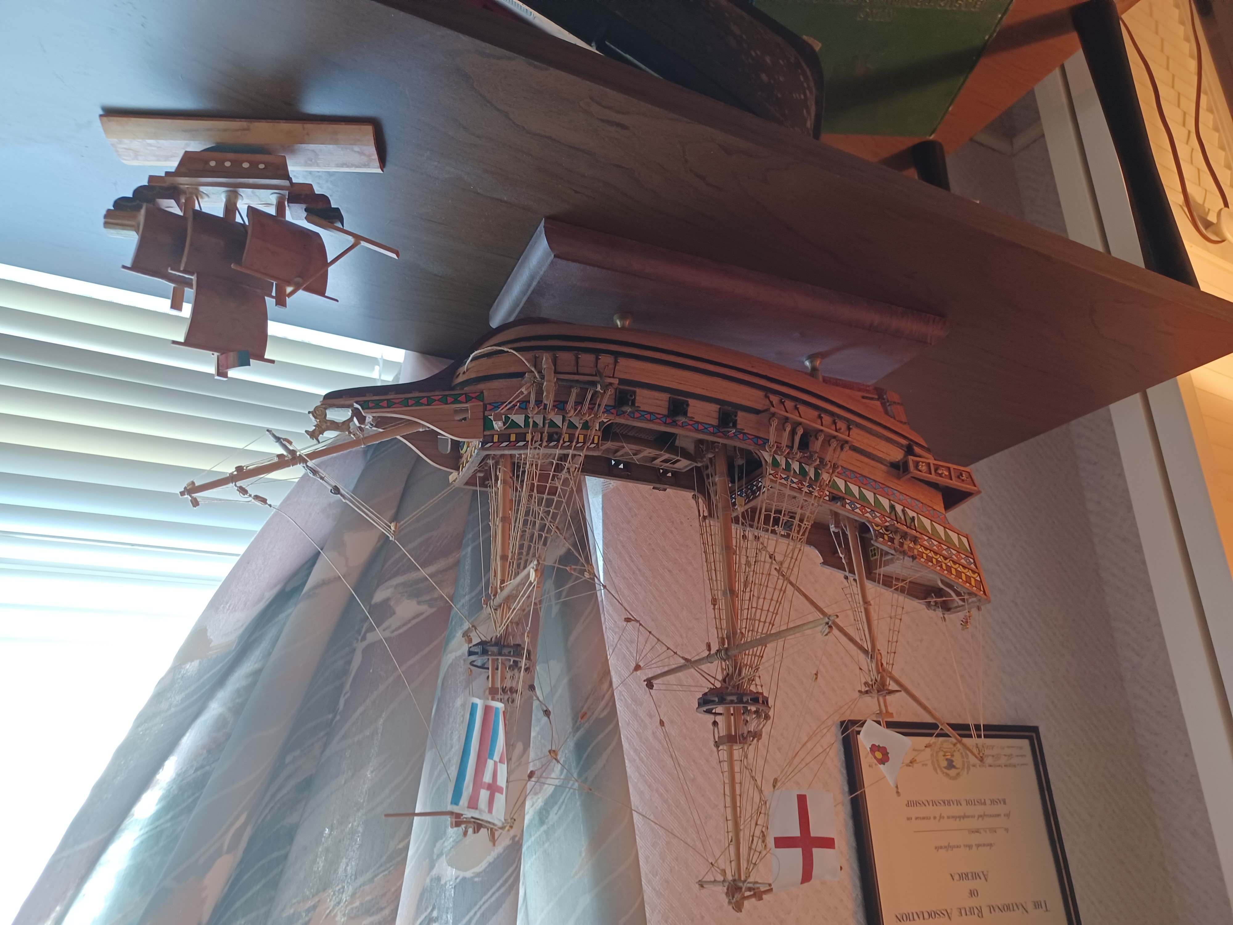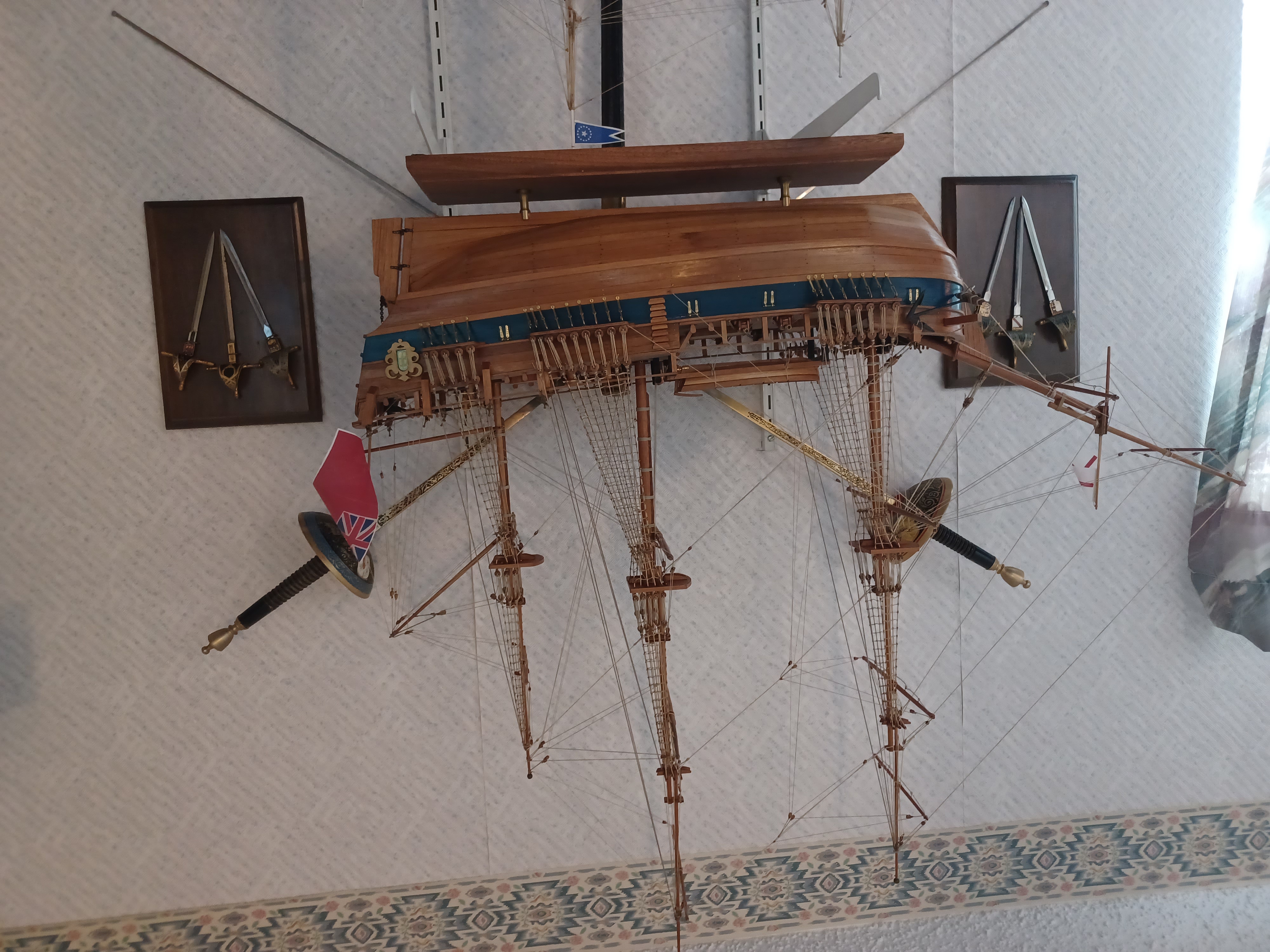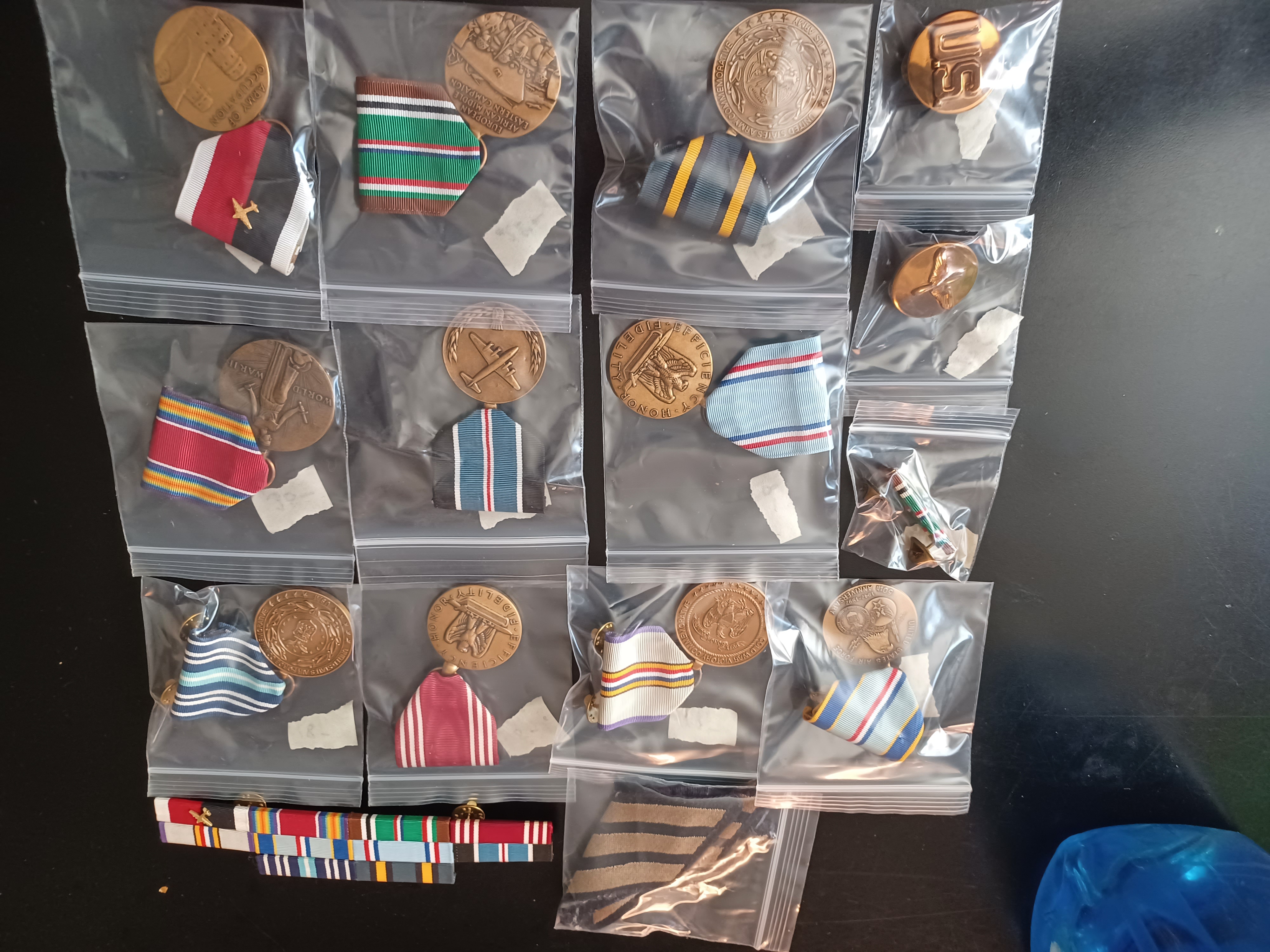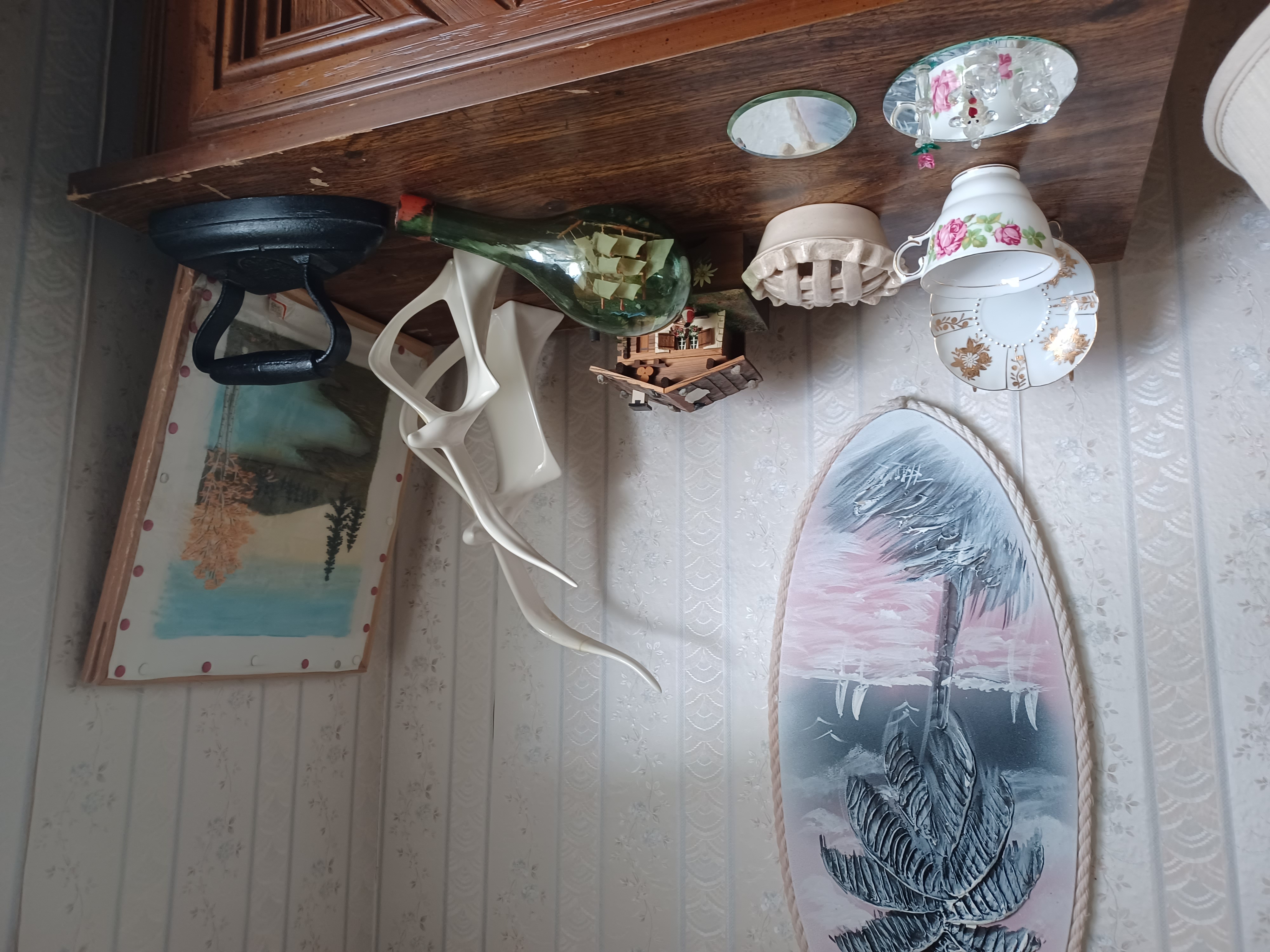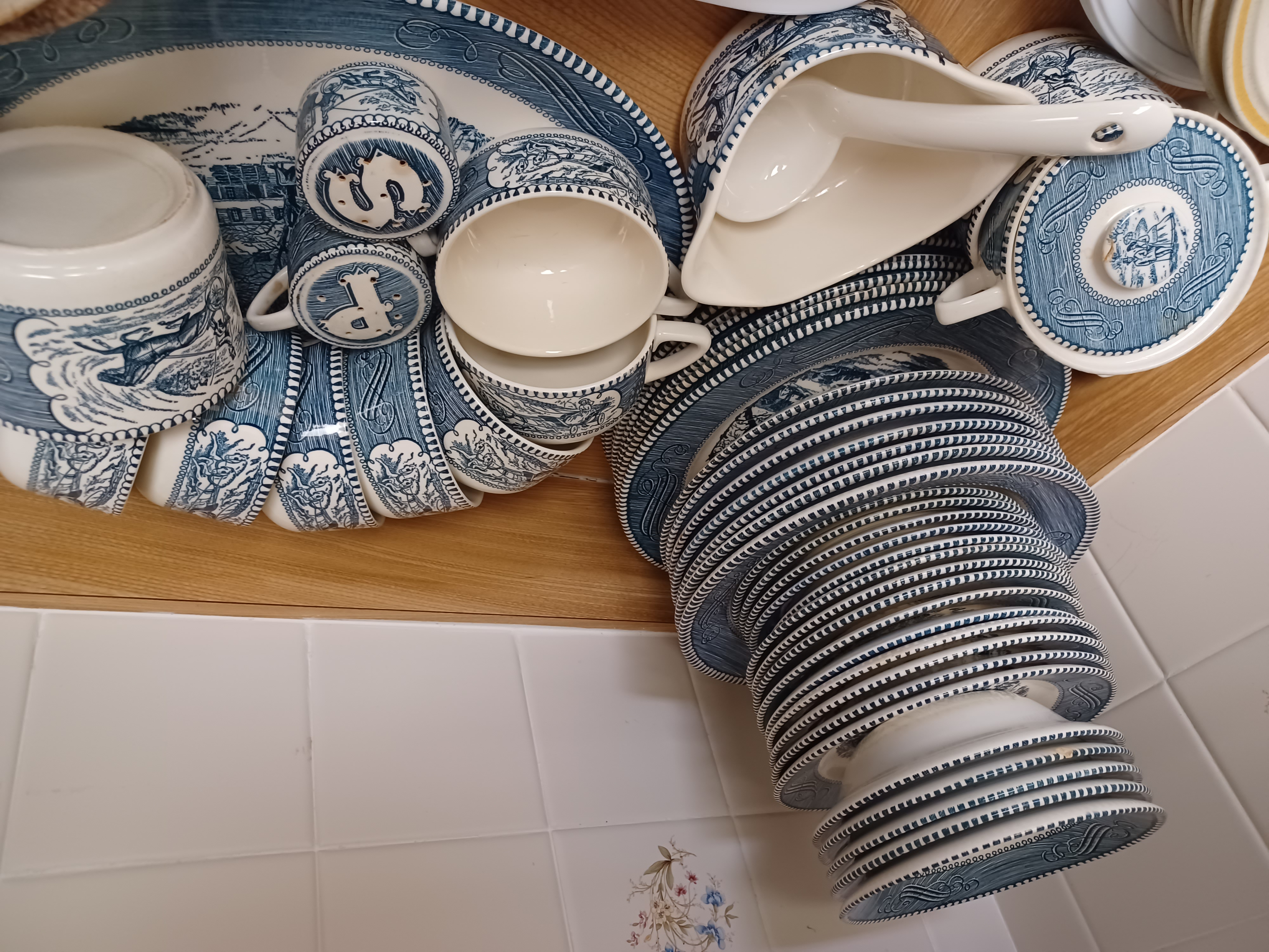 Items from France, WWII memorabilia (including medals, a footlocker, and military uniform), large wooden model ships from the 1700s–1800s, ship kits, and a wide range of collectibles. These include clowns, teacups, crystal, Lenox, Hummel, Depression glass, Courrier & Ives, French books and albums, and other military memorabilia.