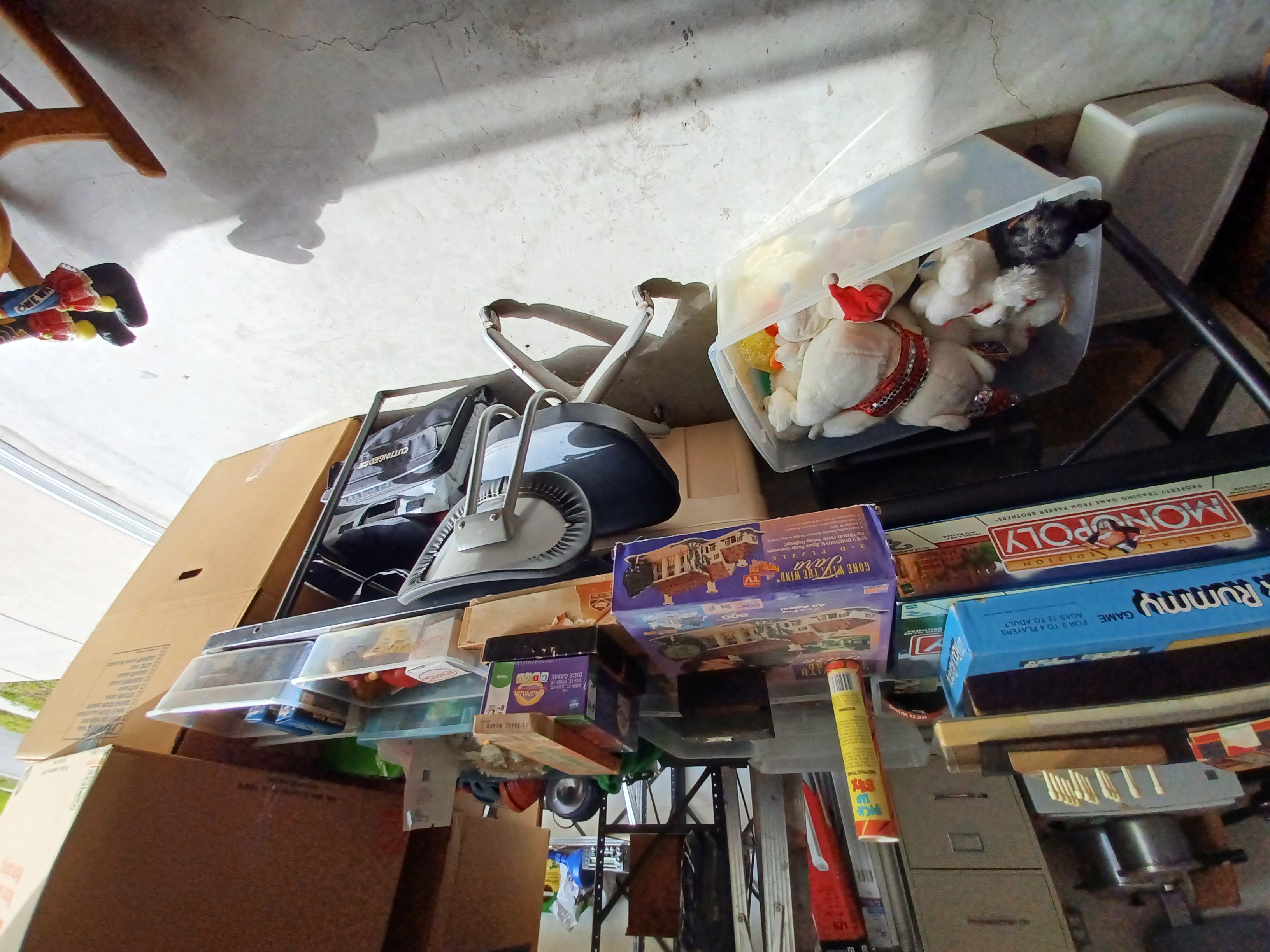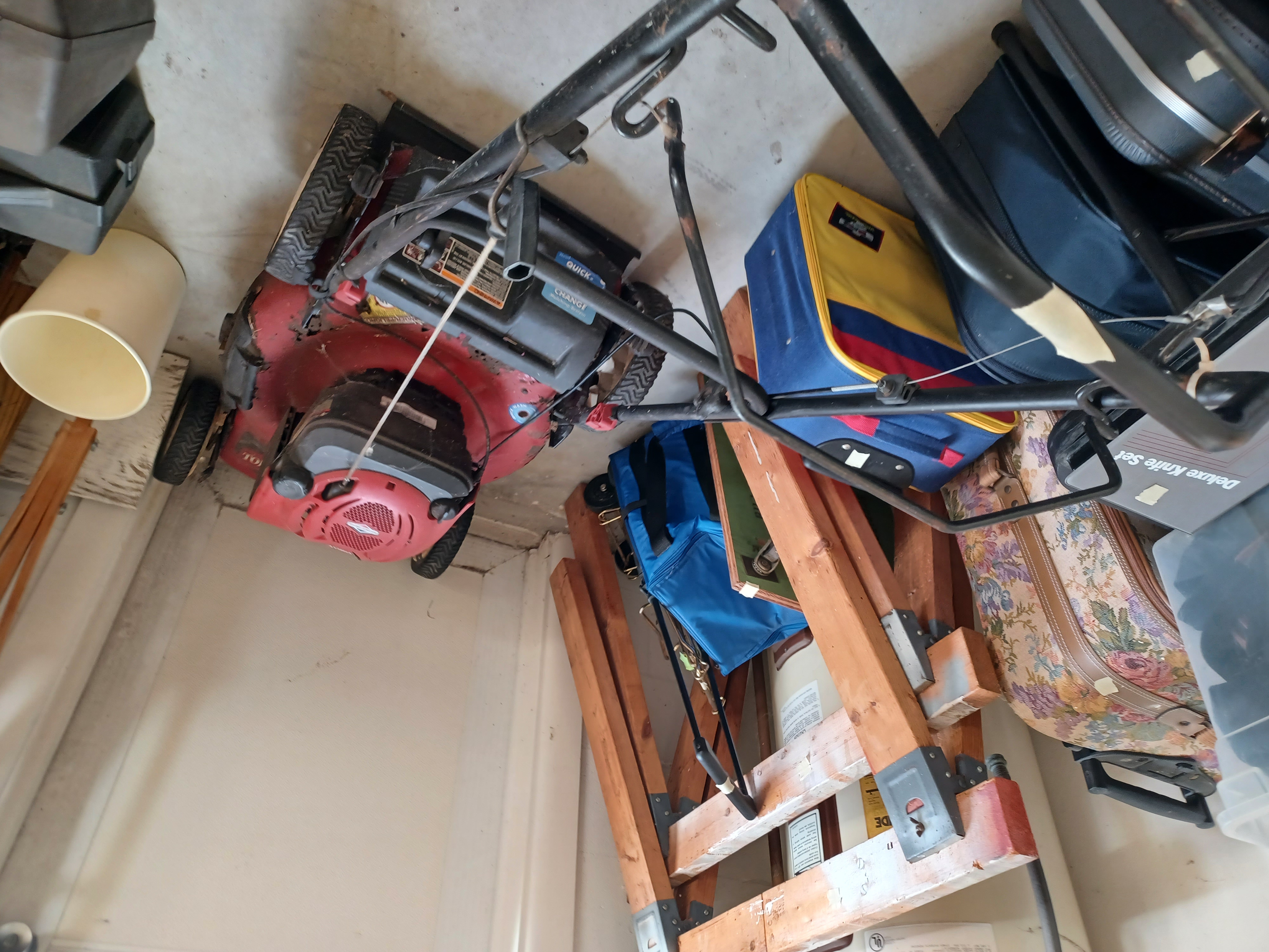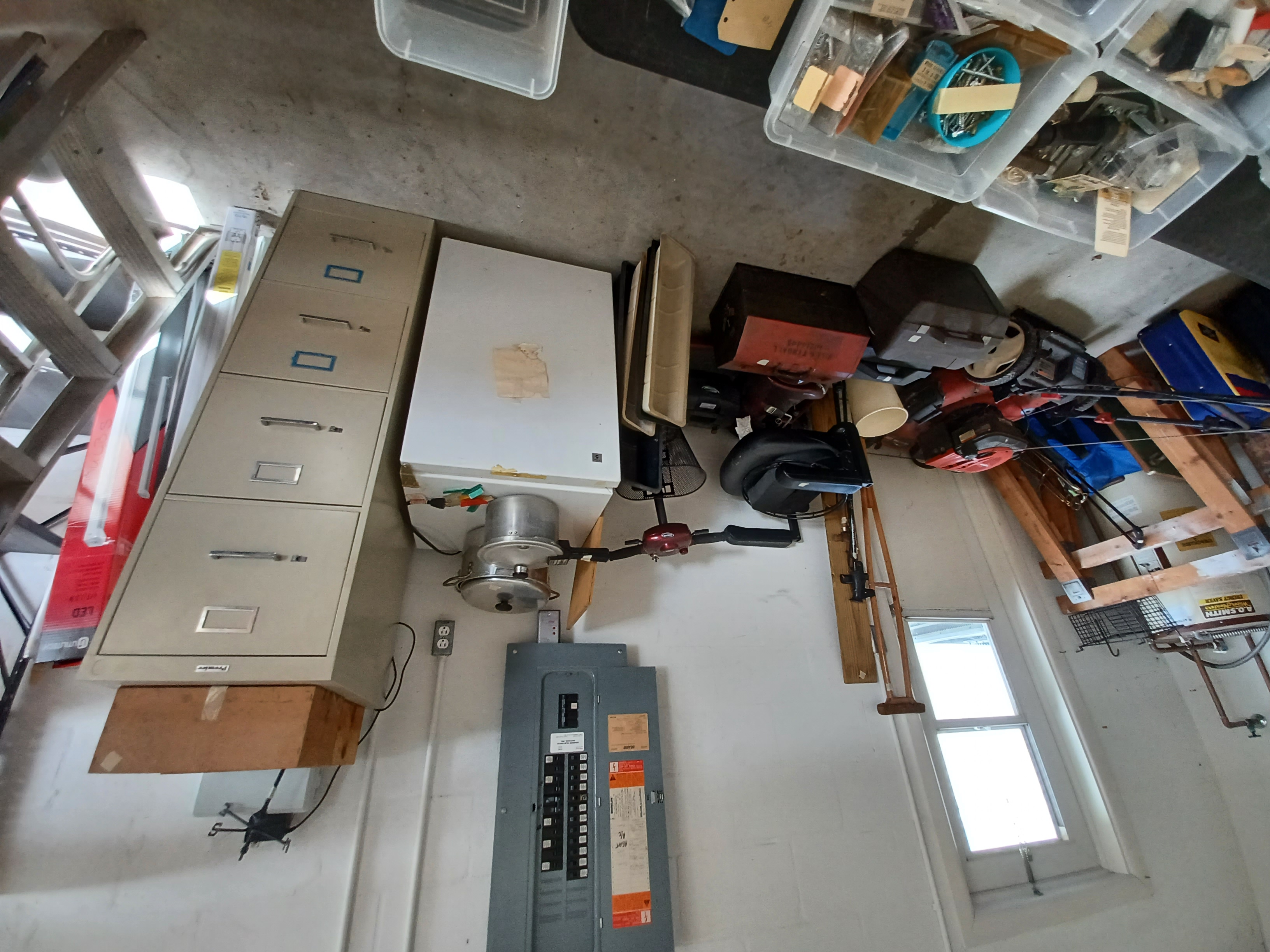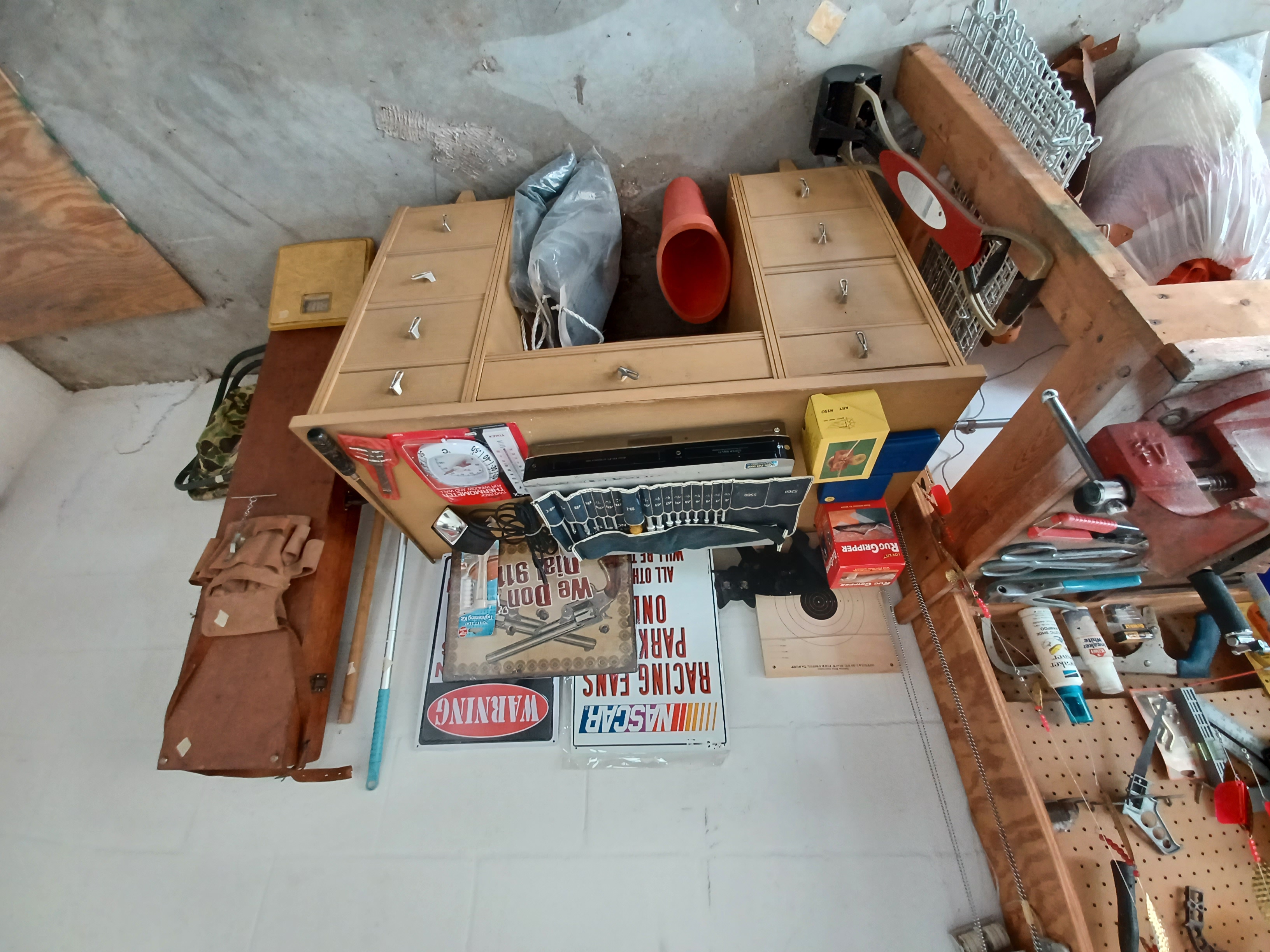 A variety of tools and equipment including a drill press, power tools, yard tools, lawn mower, file cabinet, metal shelving, workbench, spray paints, chemicals, cleaning supplies, sewing materials, fabric, lighting fixtures, moving boxes, luggage, and more.