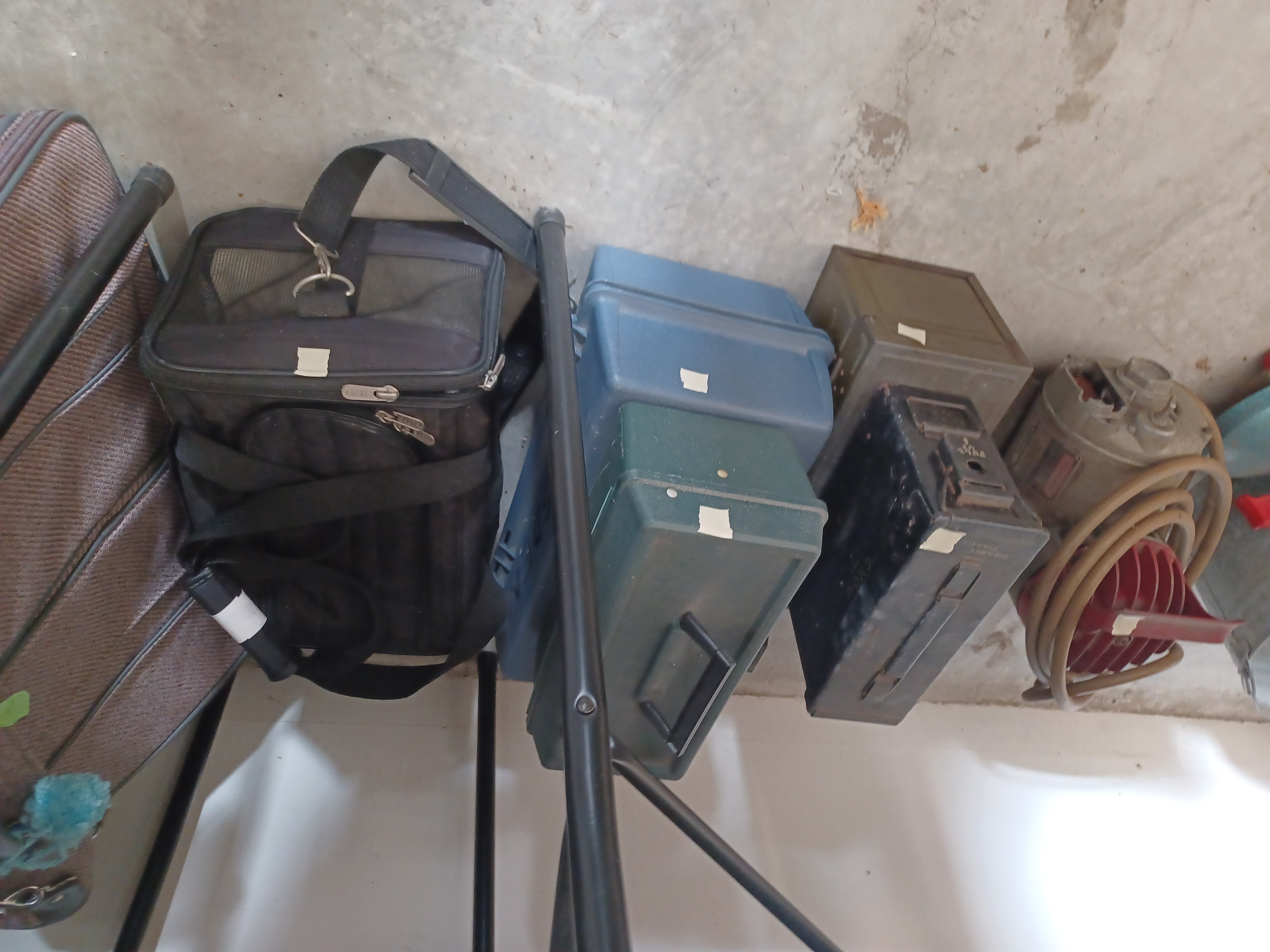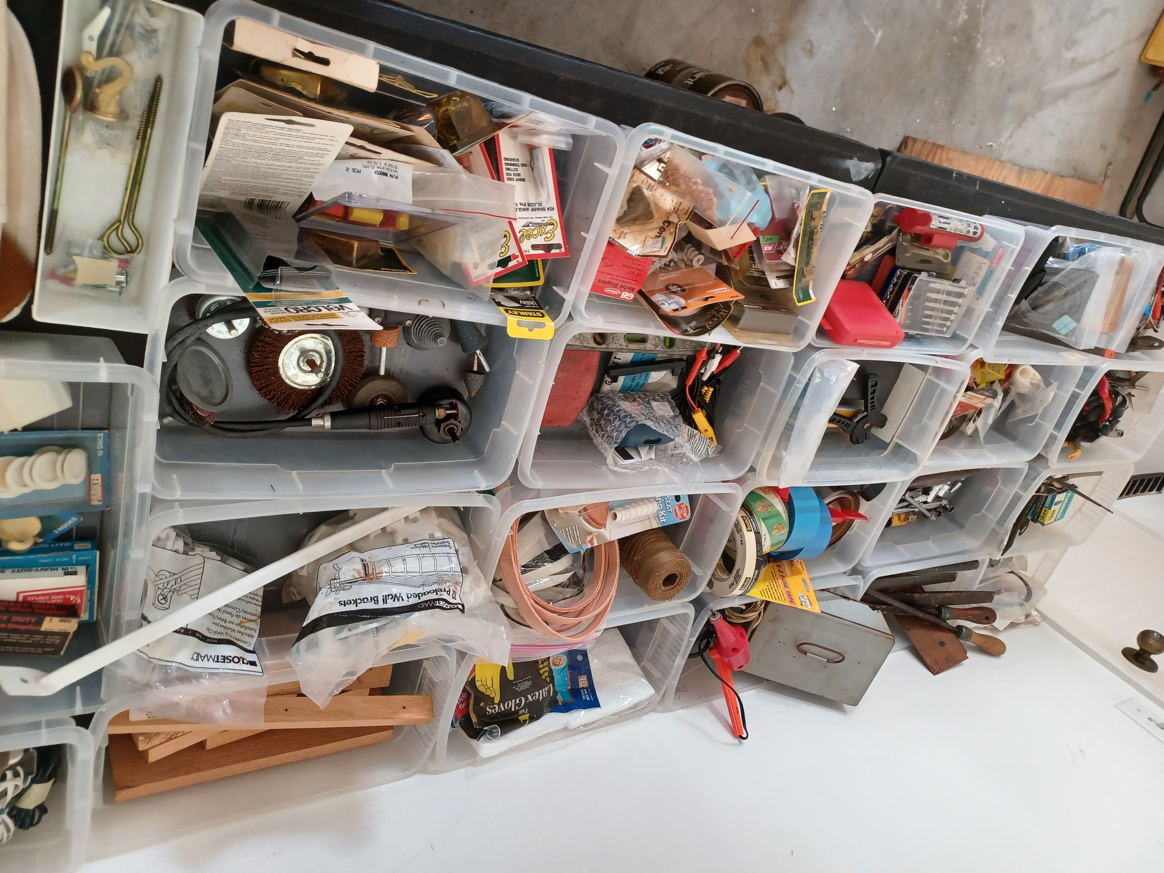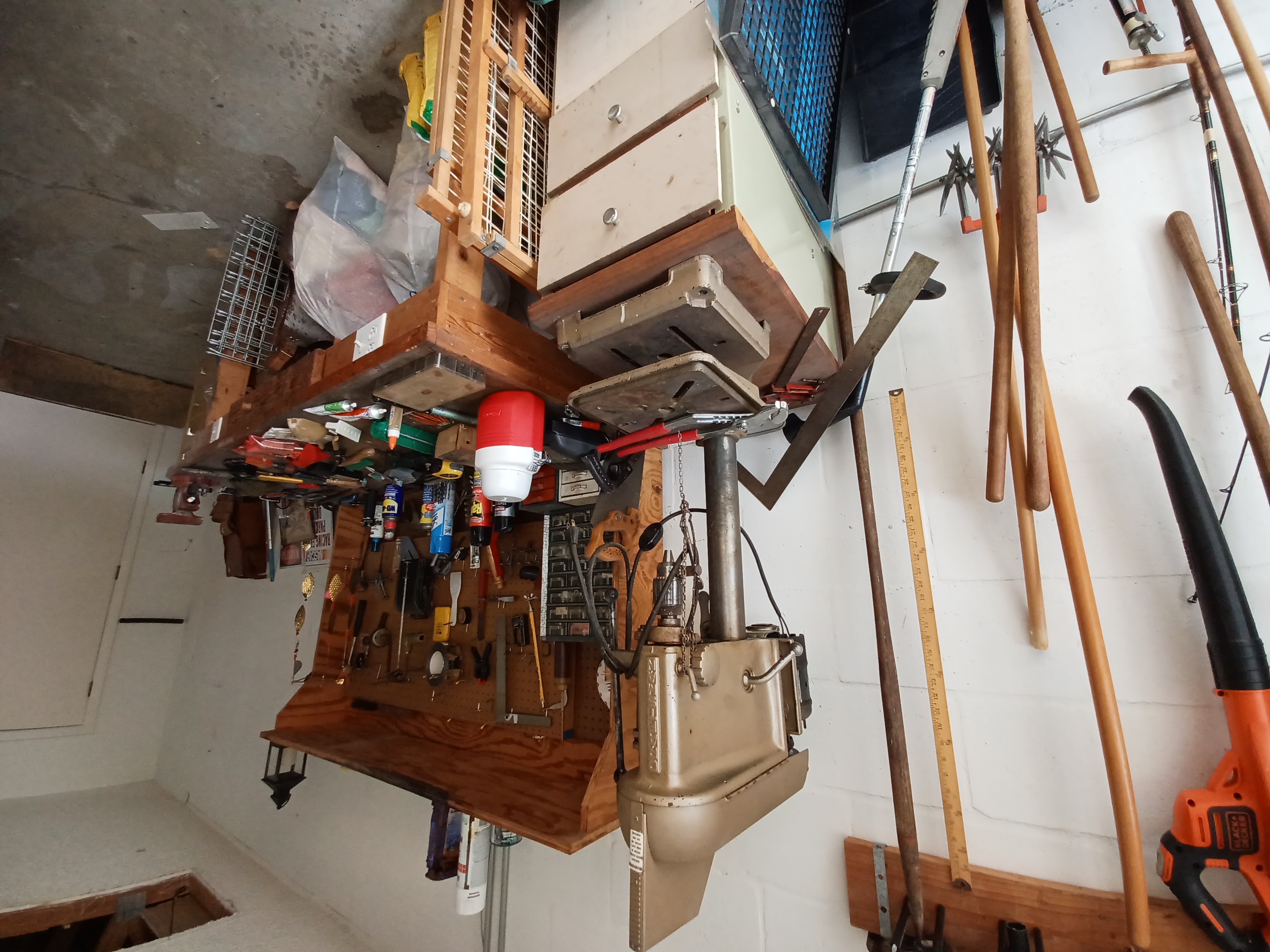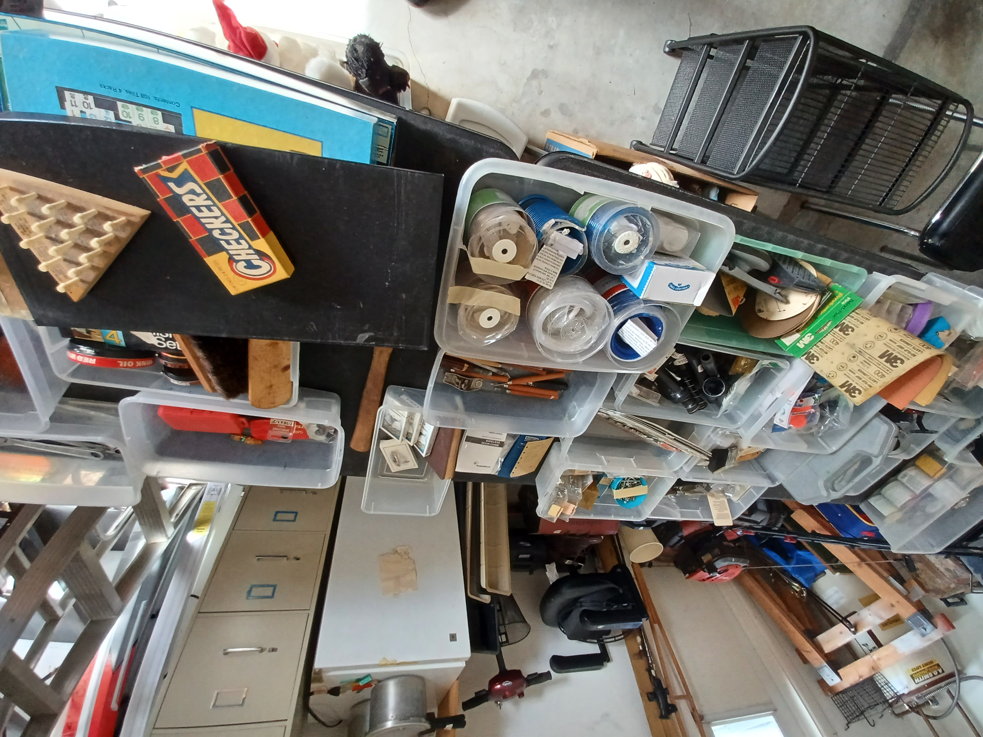 A variety of tools and equipment including a drill press, power tools, yard tools, lawn mower, file cabinet, metal shelving, workbench, spray paints, chemicals, cleaning supplies, sewing materials, fabric, lighting fixtures, moving boxes, luggage, and more.