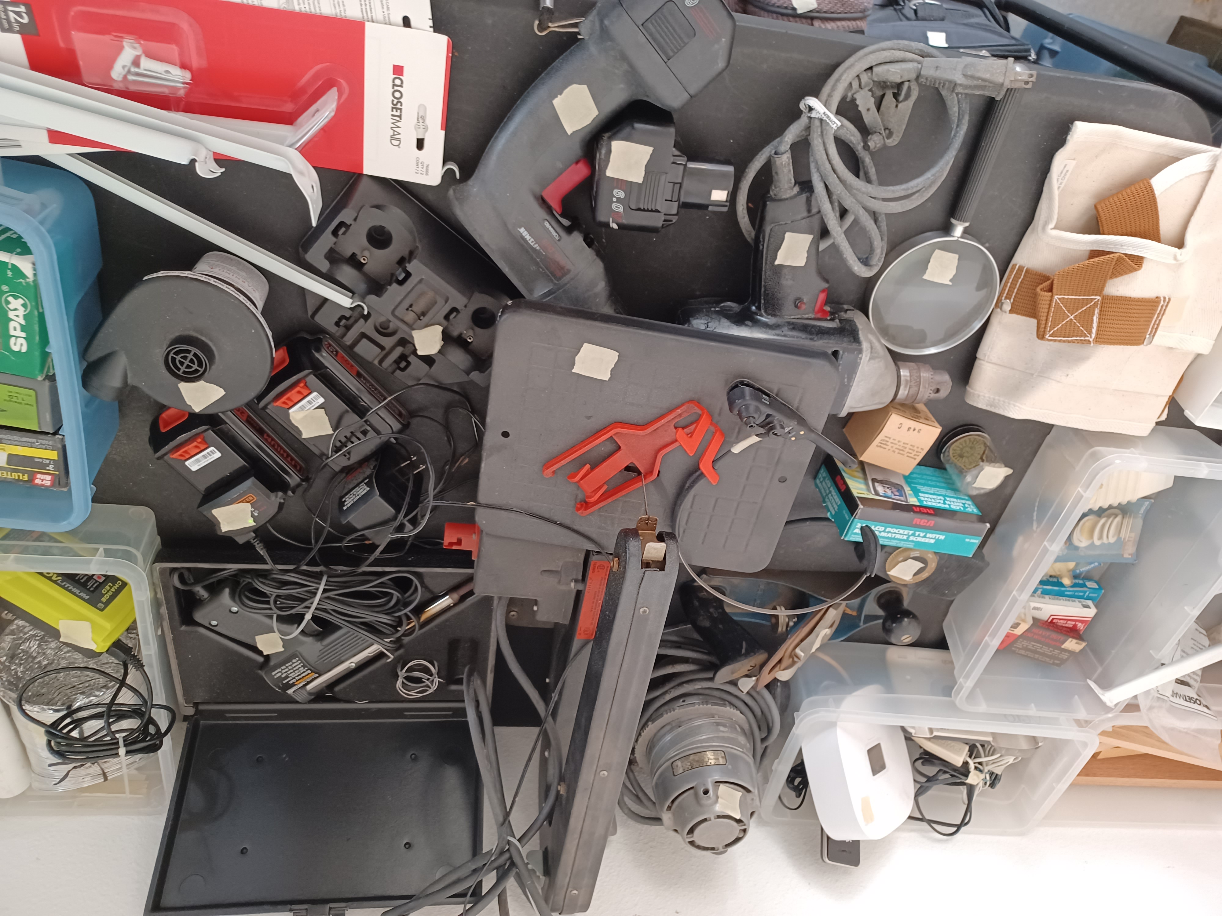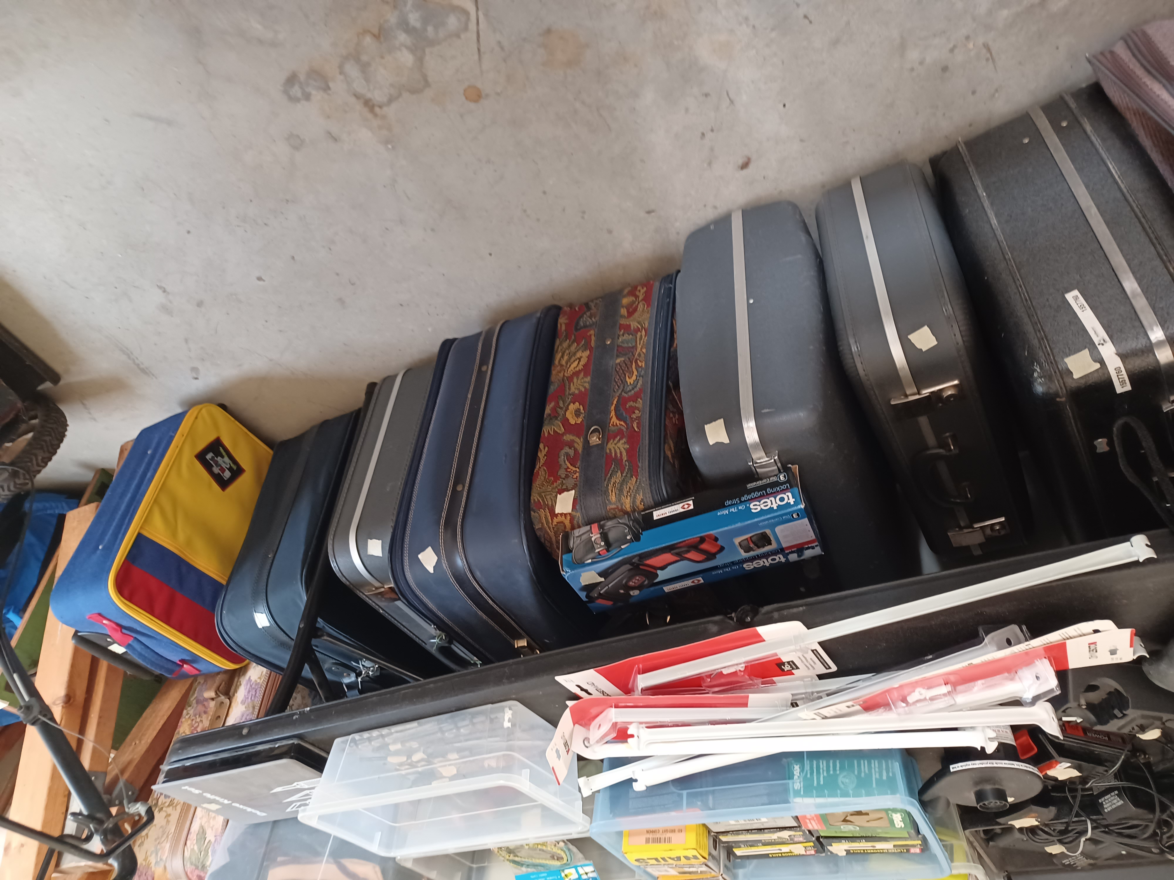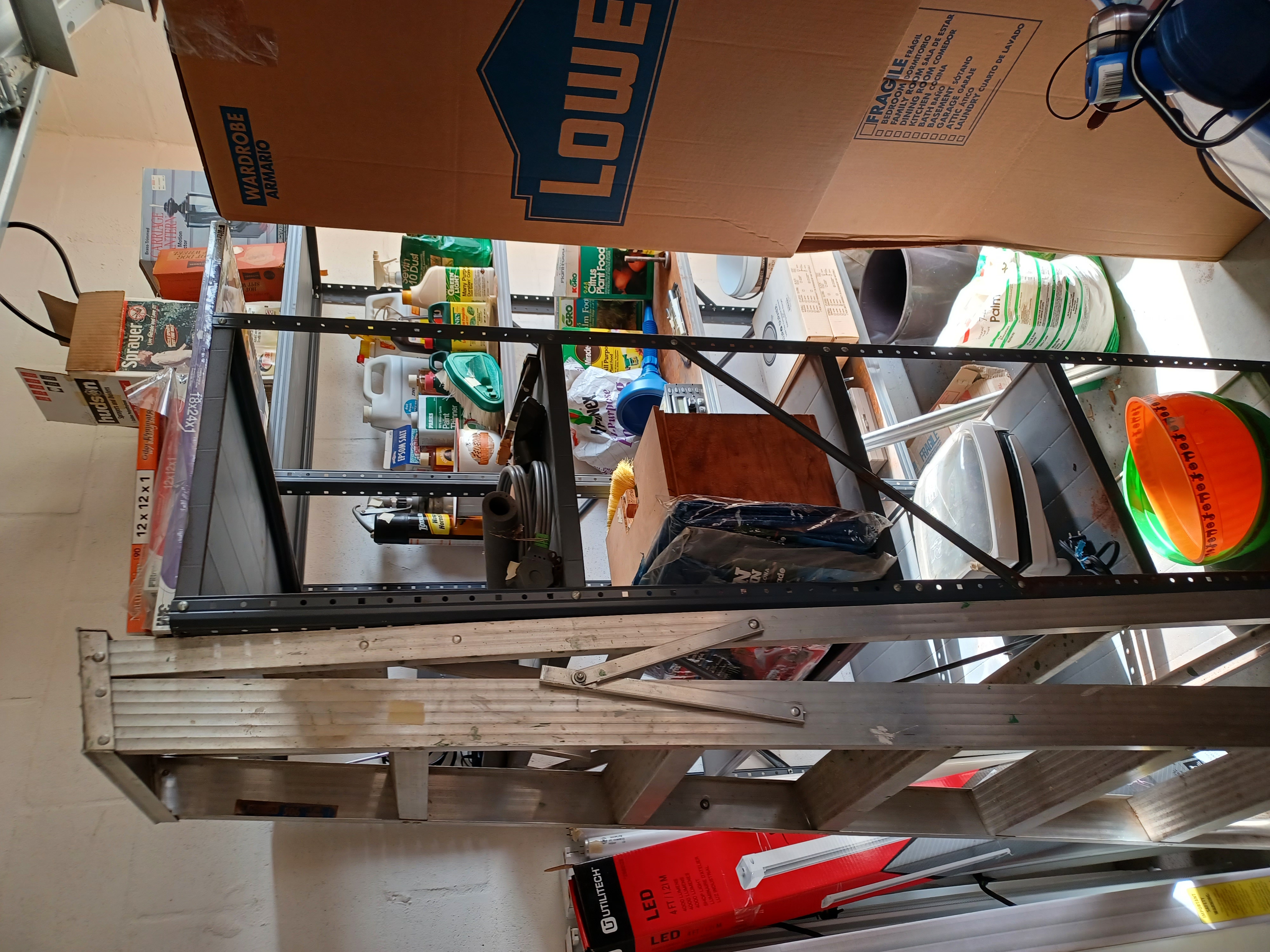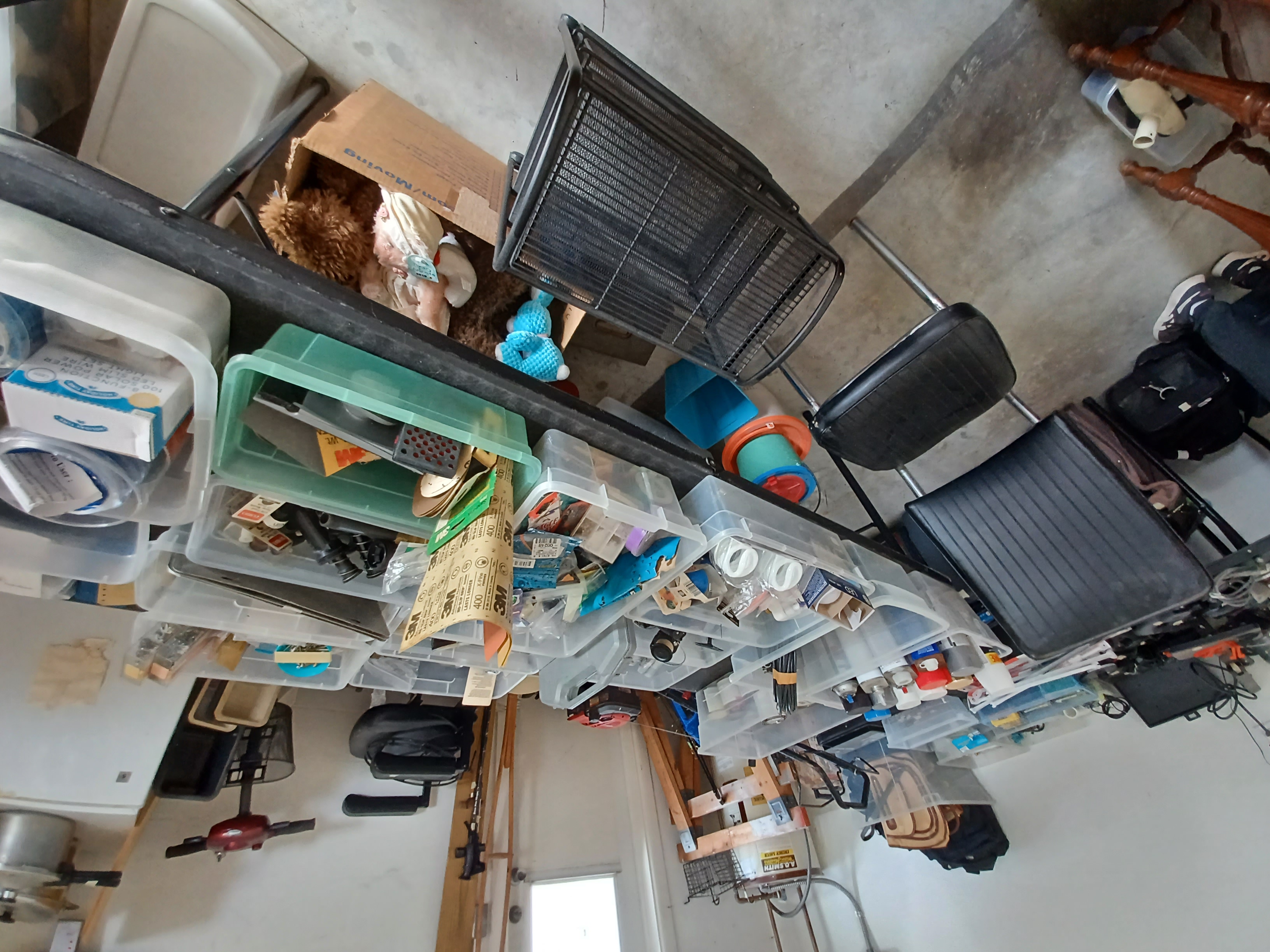 A variety of tools and equipment including a drill press, power tools, yard tools, lawn mower, file cabinet, metal shelving, workbench, spray paints, chemicals, cleaning supplies, sewing materials, fabric, lighting fixtures, moving boxes, luggage, and more.