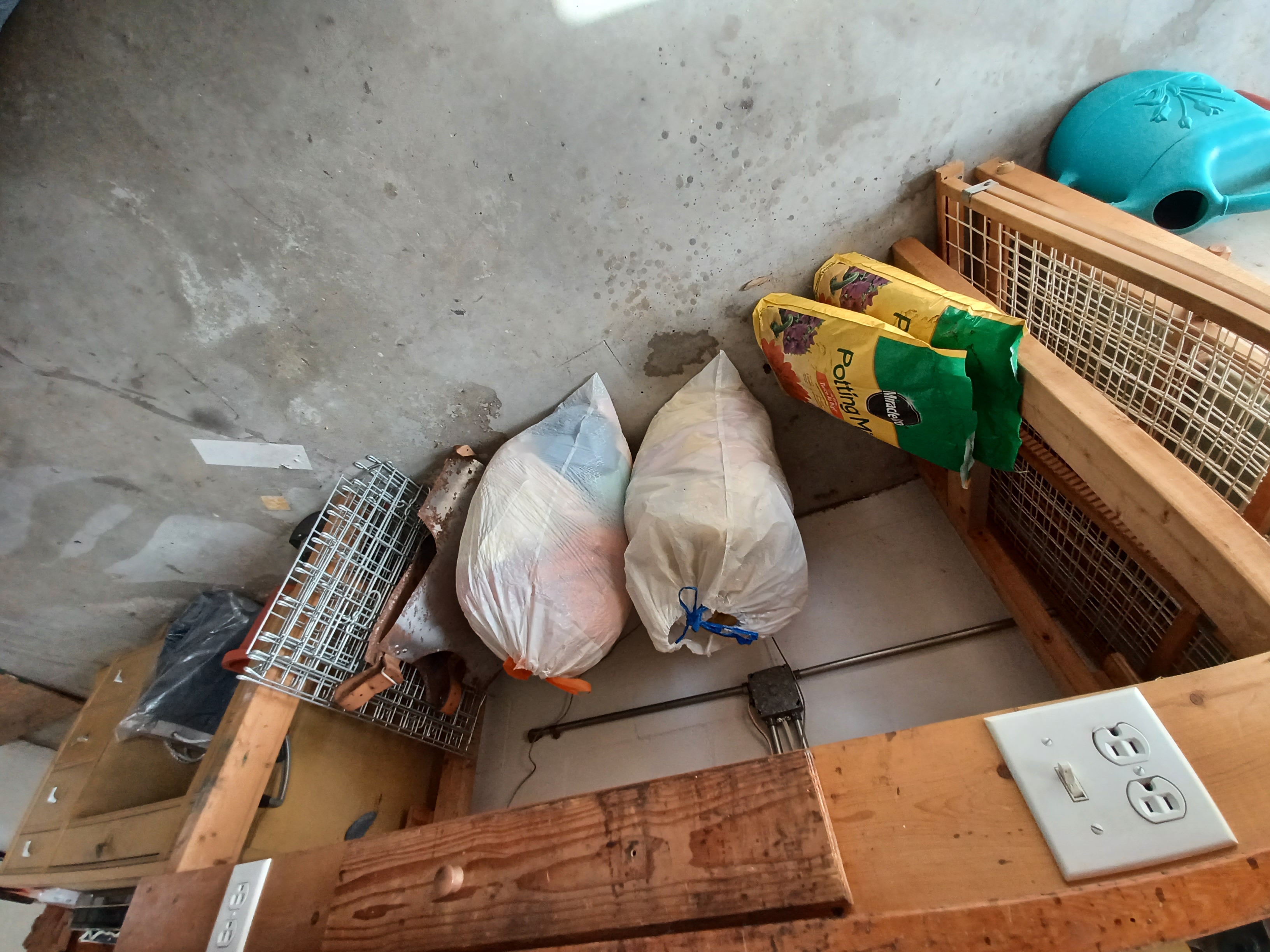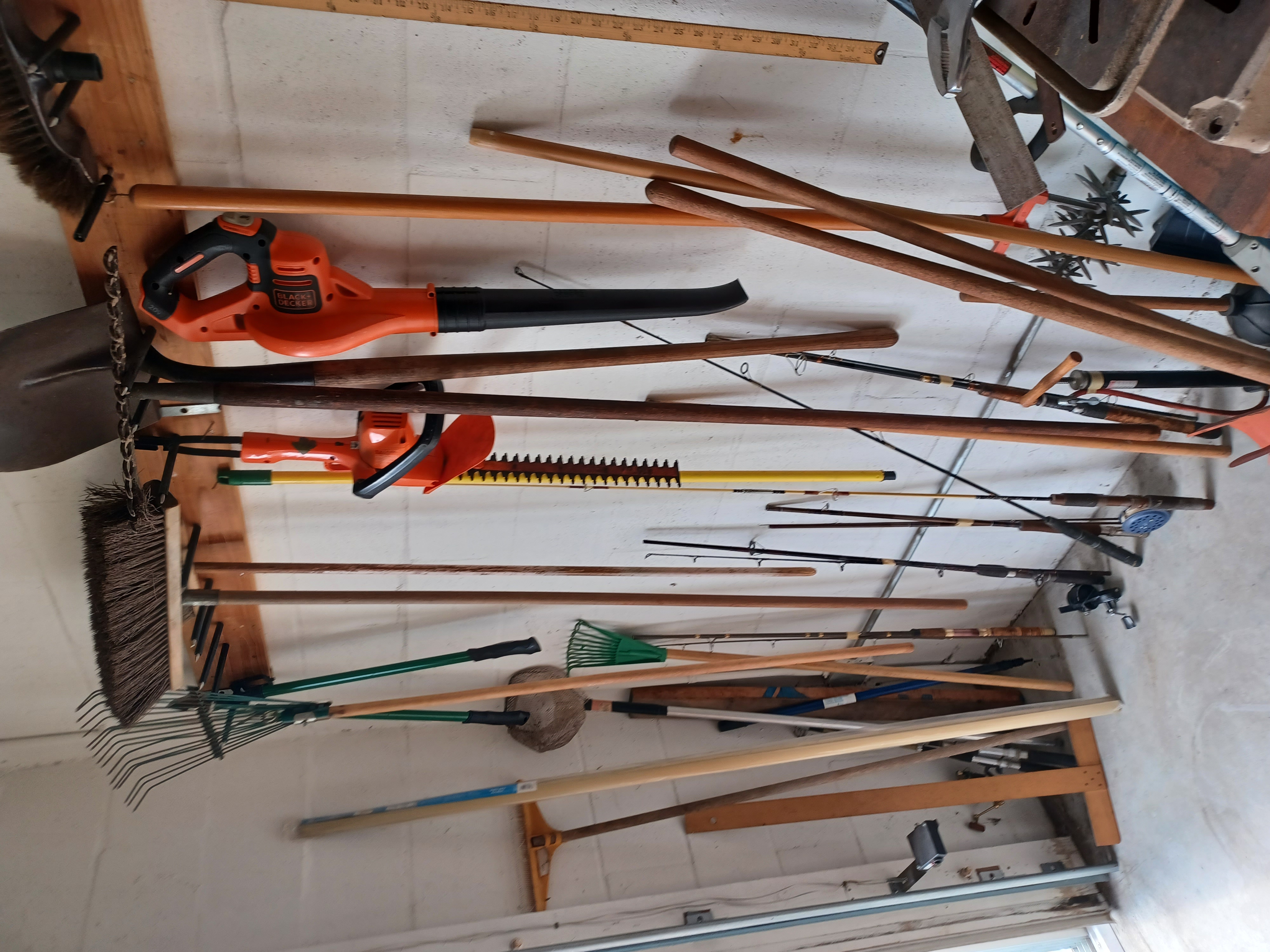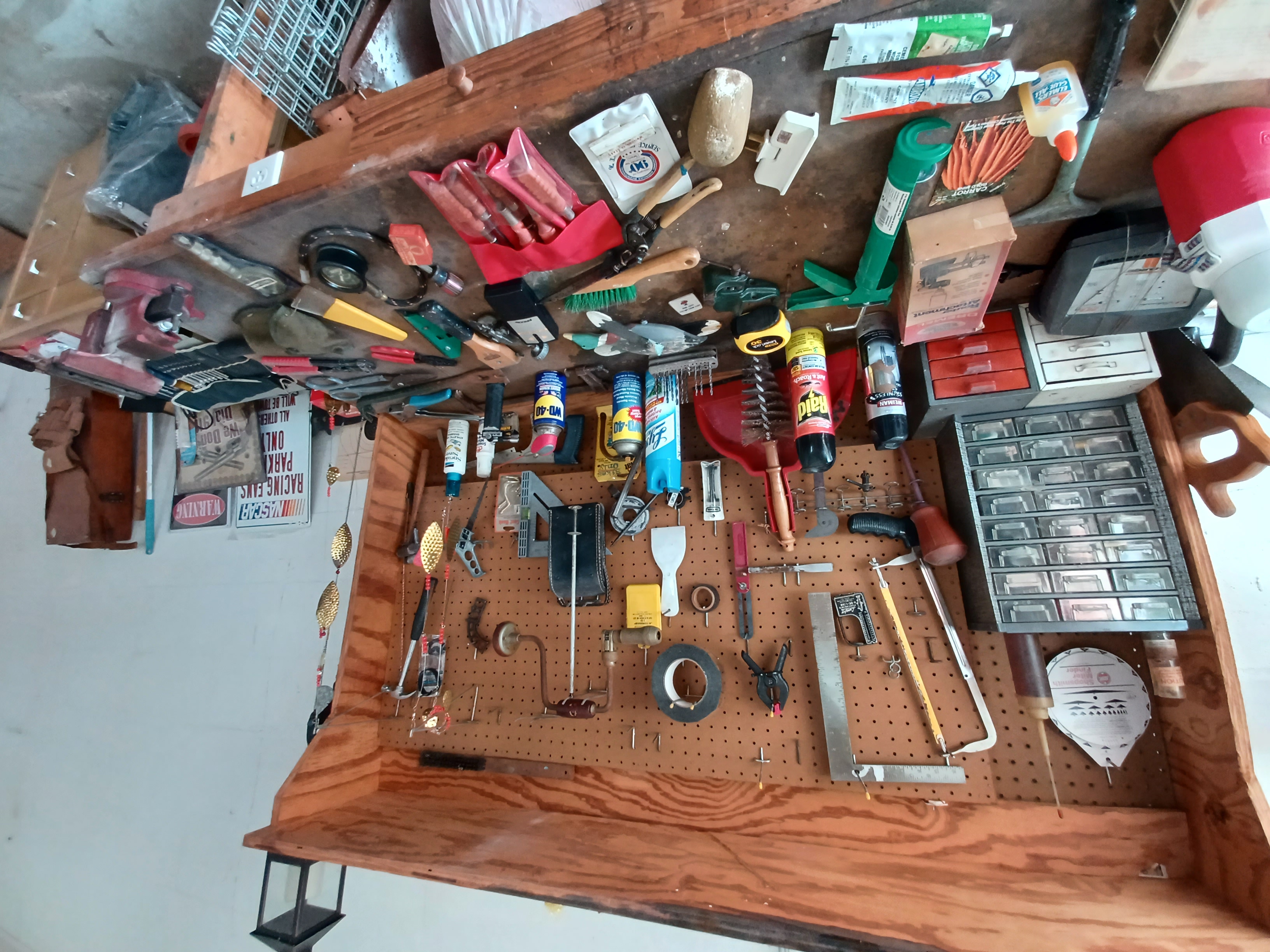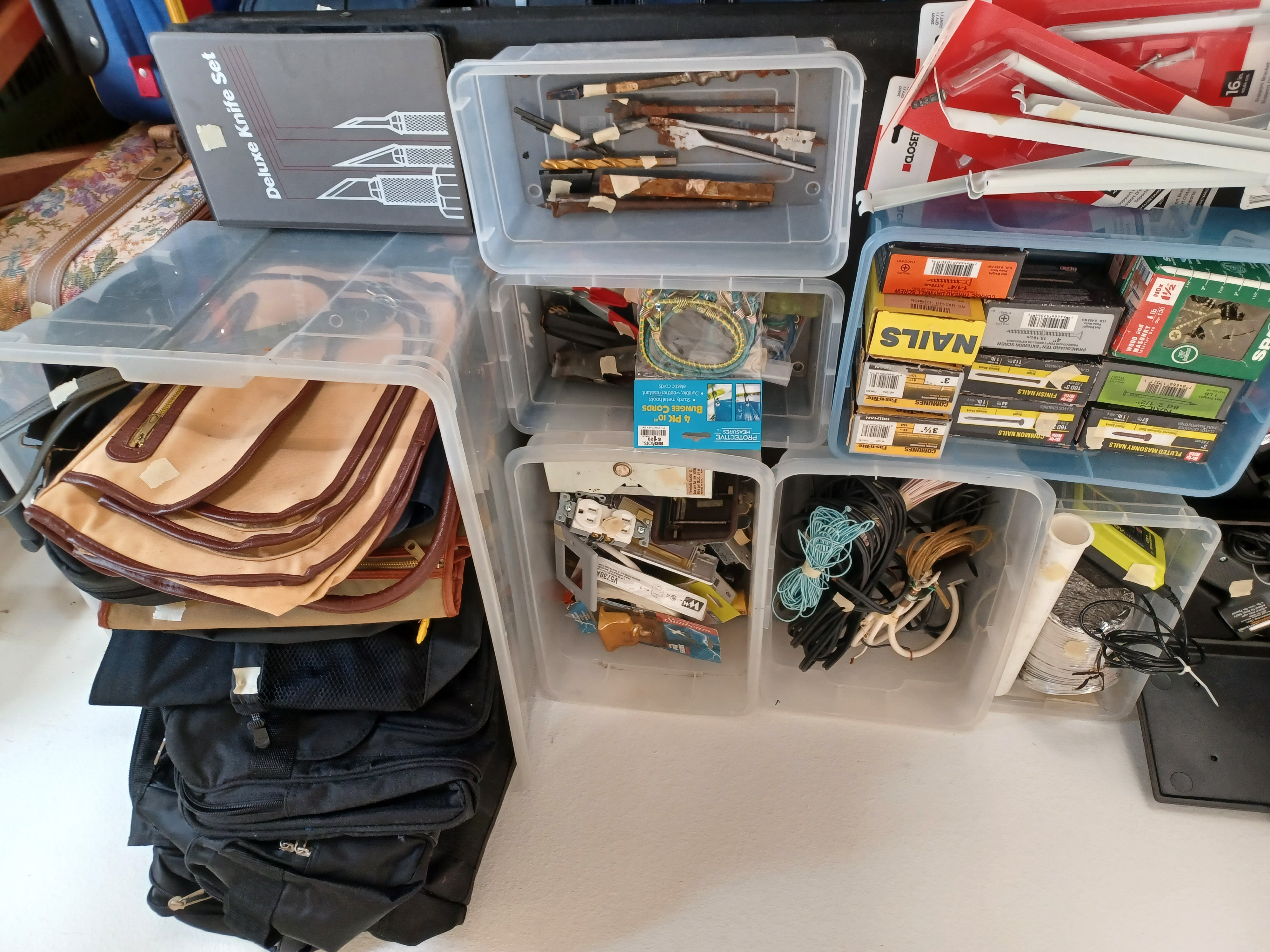 A variety of tools and equipment including a drill press, power tools, yard tools, lawn mower, file cabinet, metal shelving, workbench, spray paints, chemicals, cleaning supplies, sewing materials, fabric, lighting fixtures, moving boxes, luggage, and more.