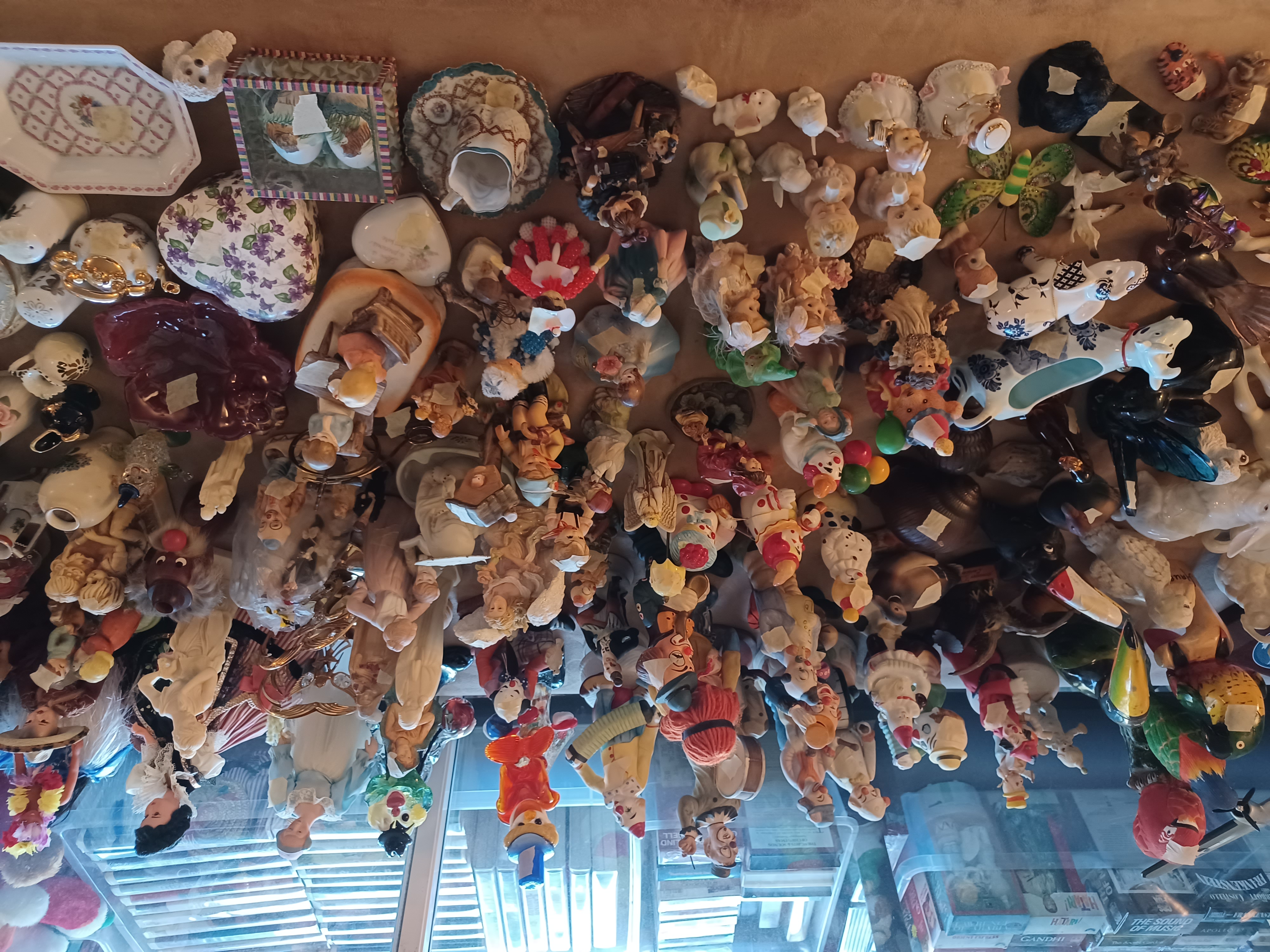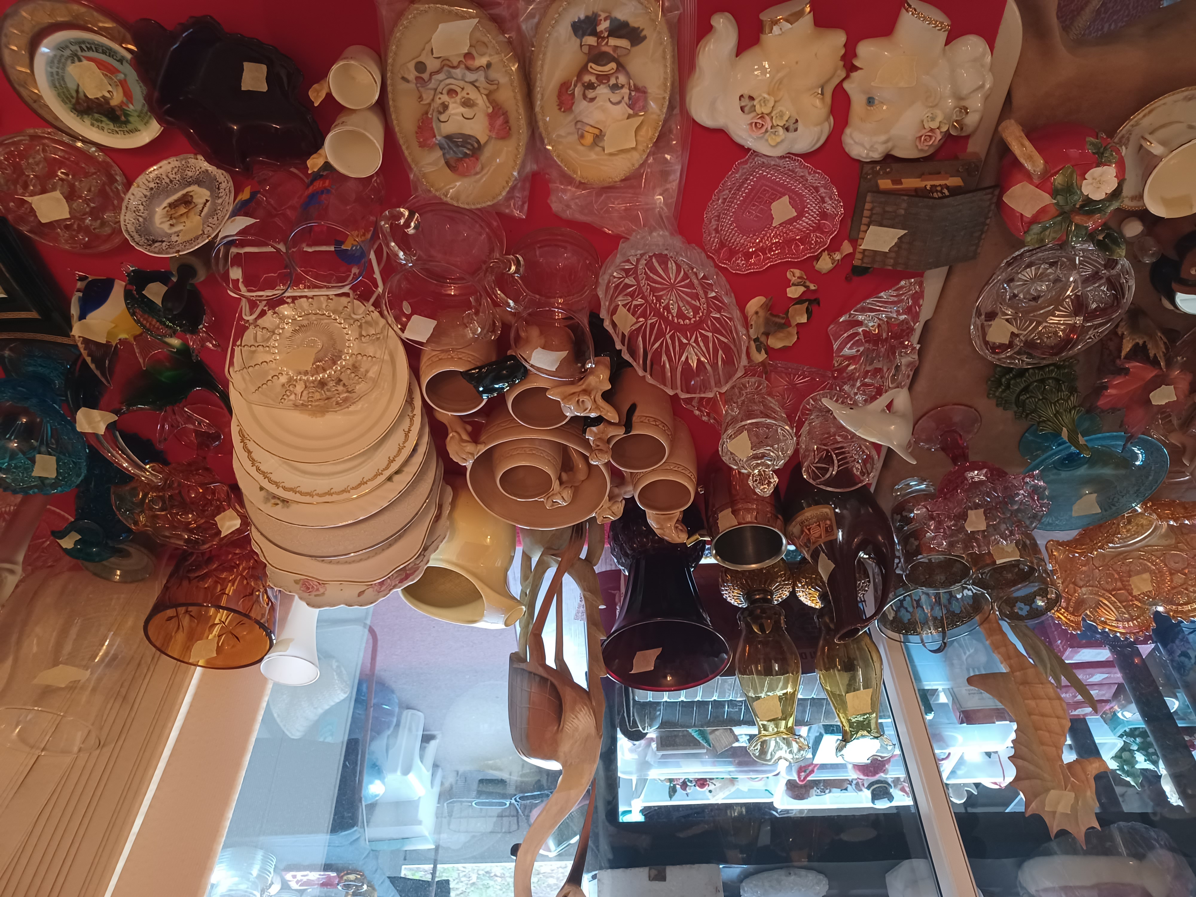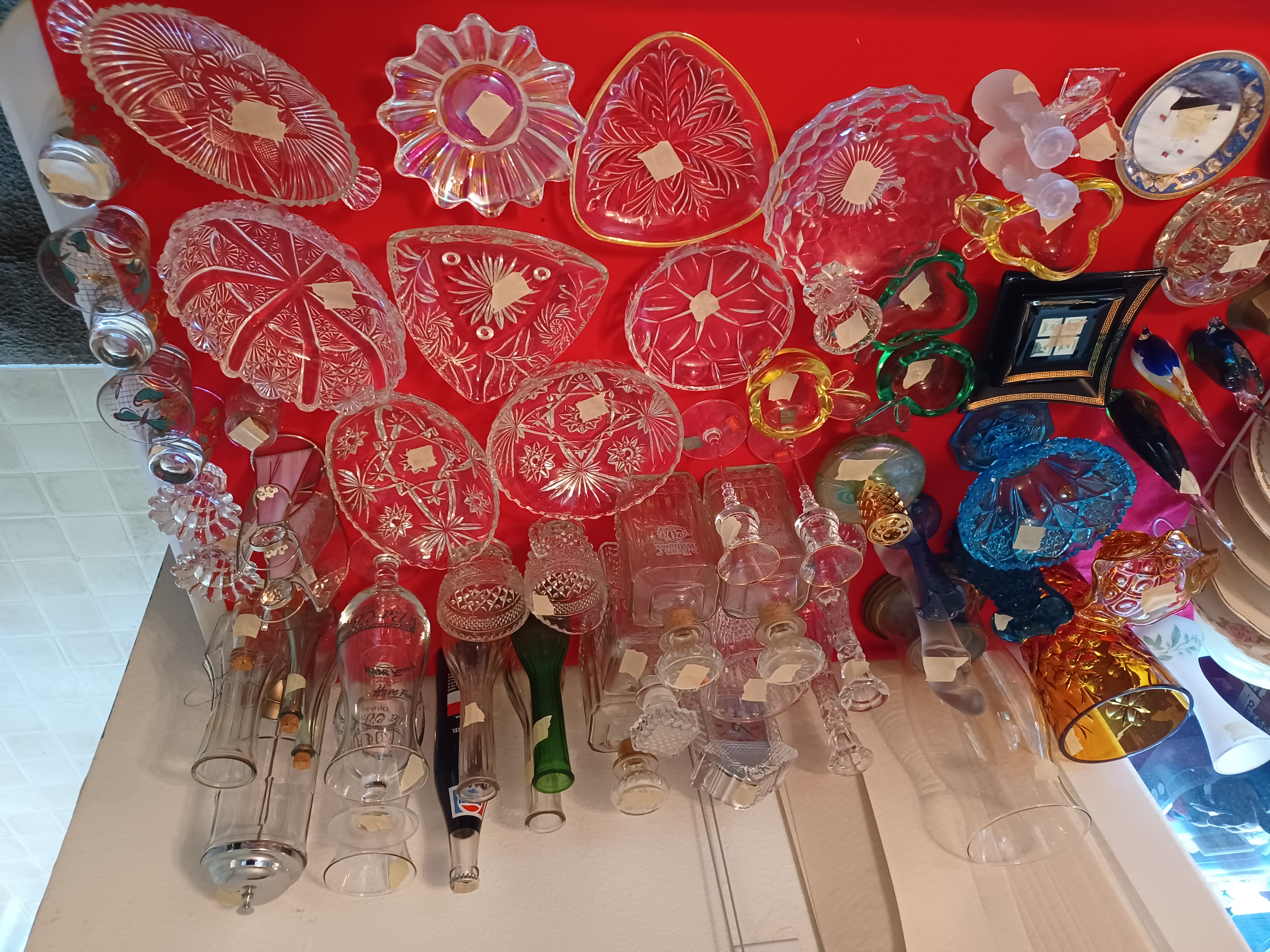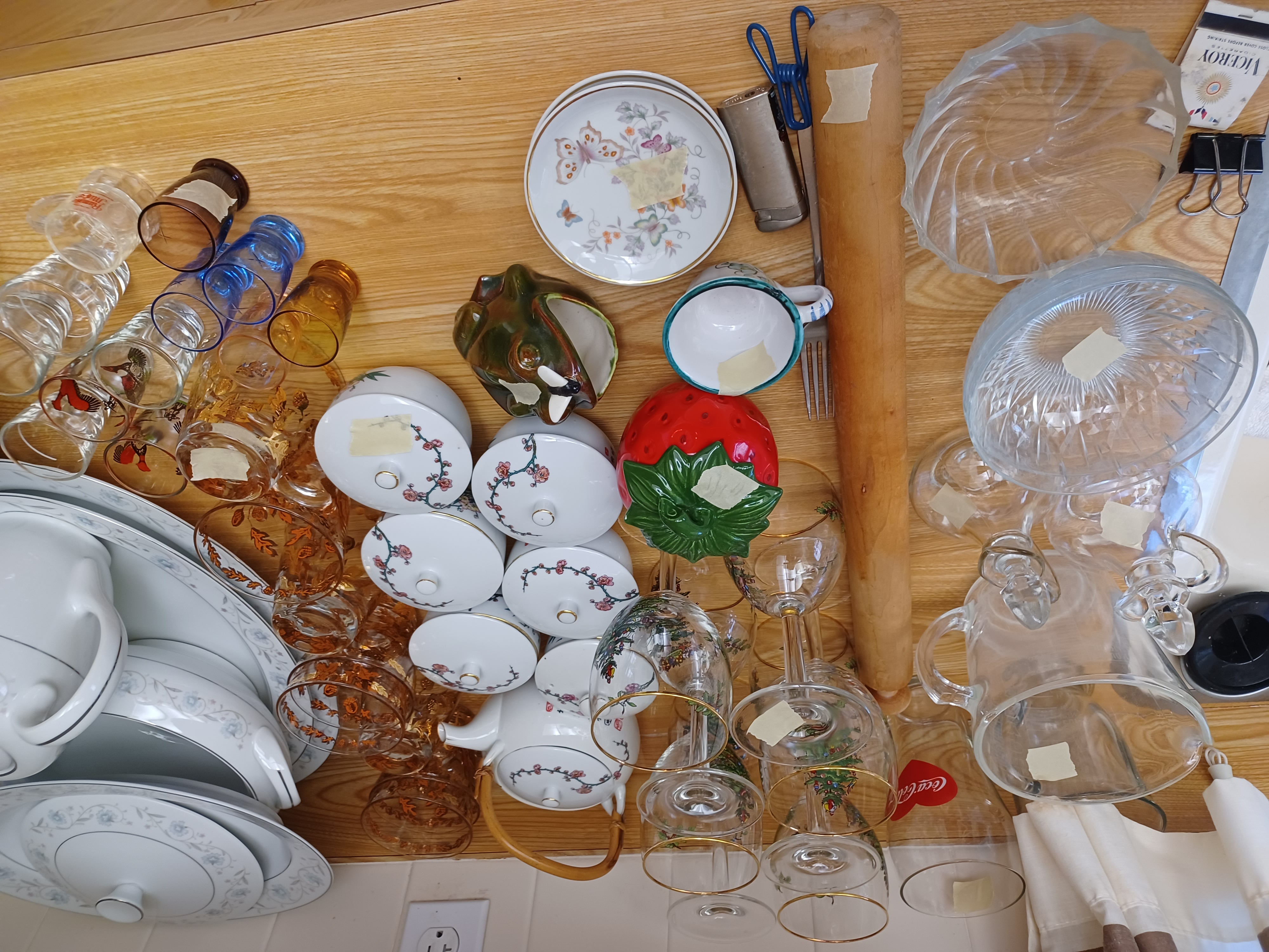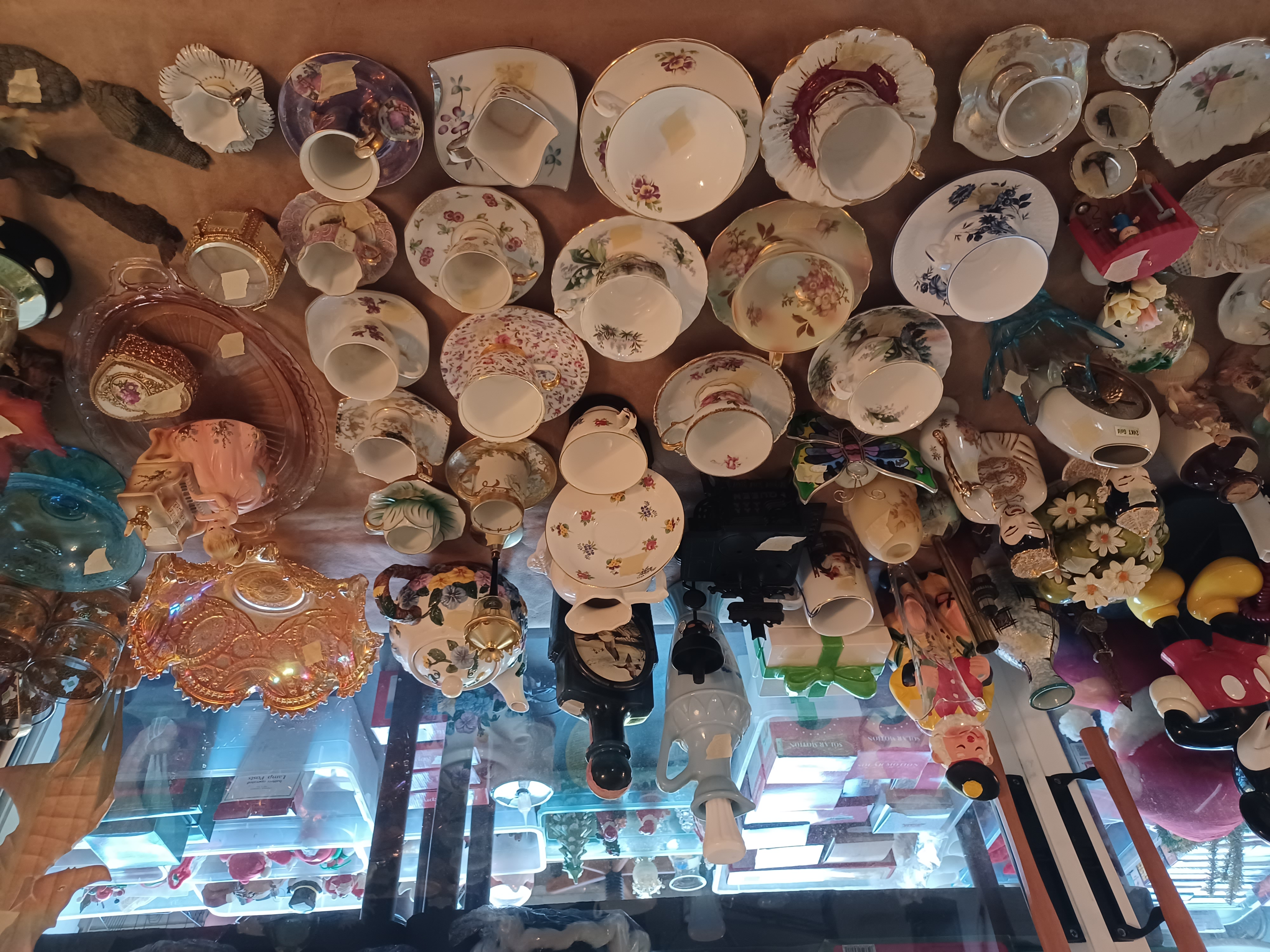Teacups, Hummel figurines, porcelain and glass clowns, a Mickey Mouse phone, crystal pieces, unicorn figurines, Norman Rockwell items, collector plates, blown glass, gold-trimmed glassware, and much more.