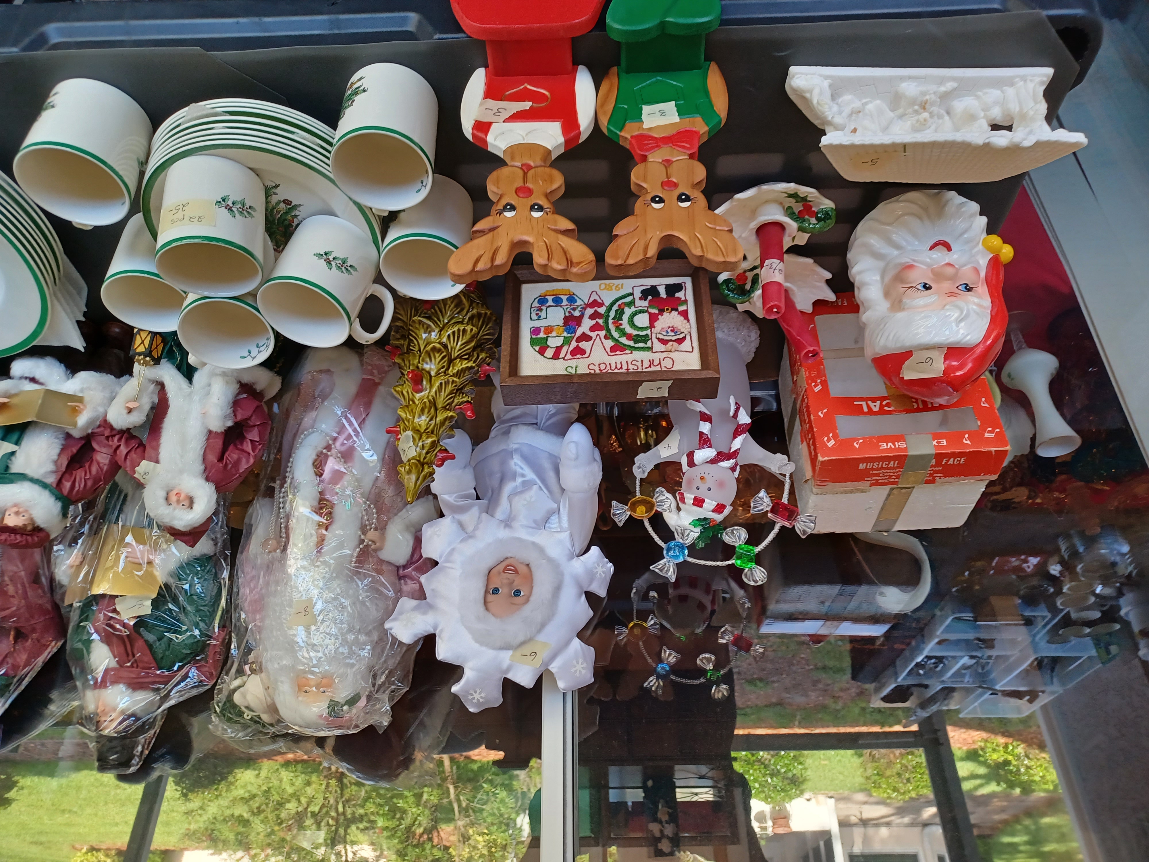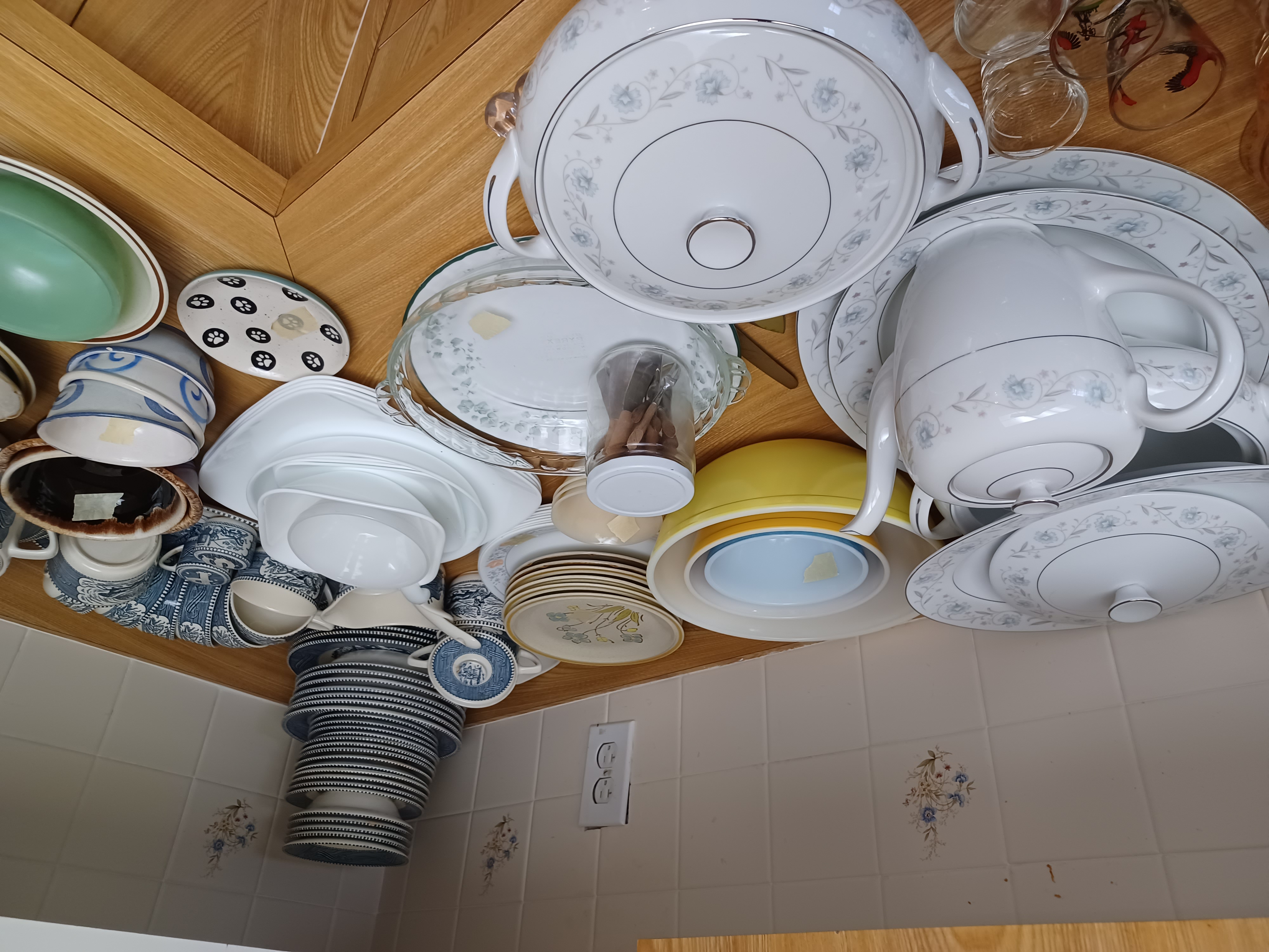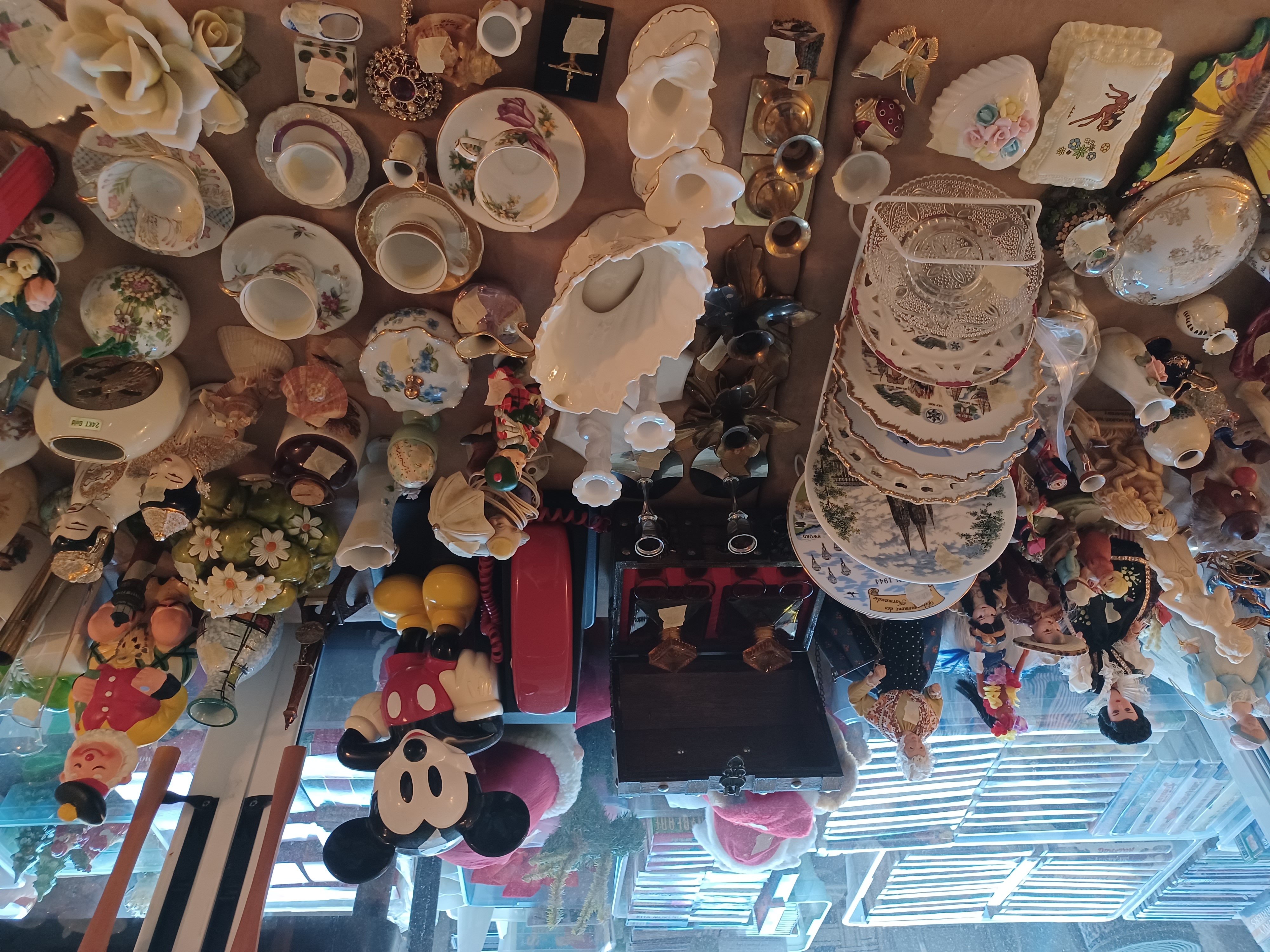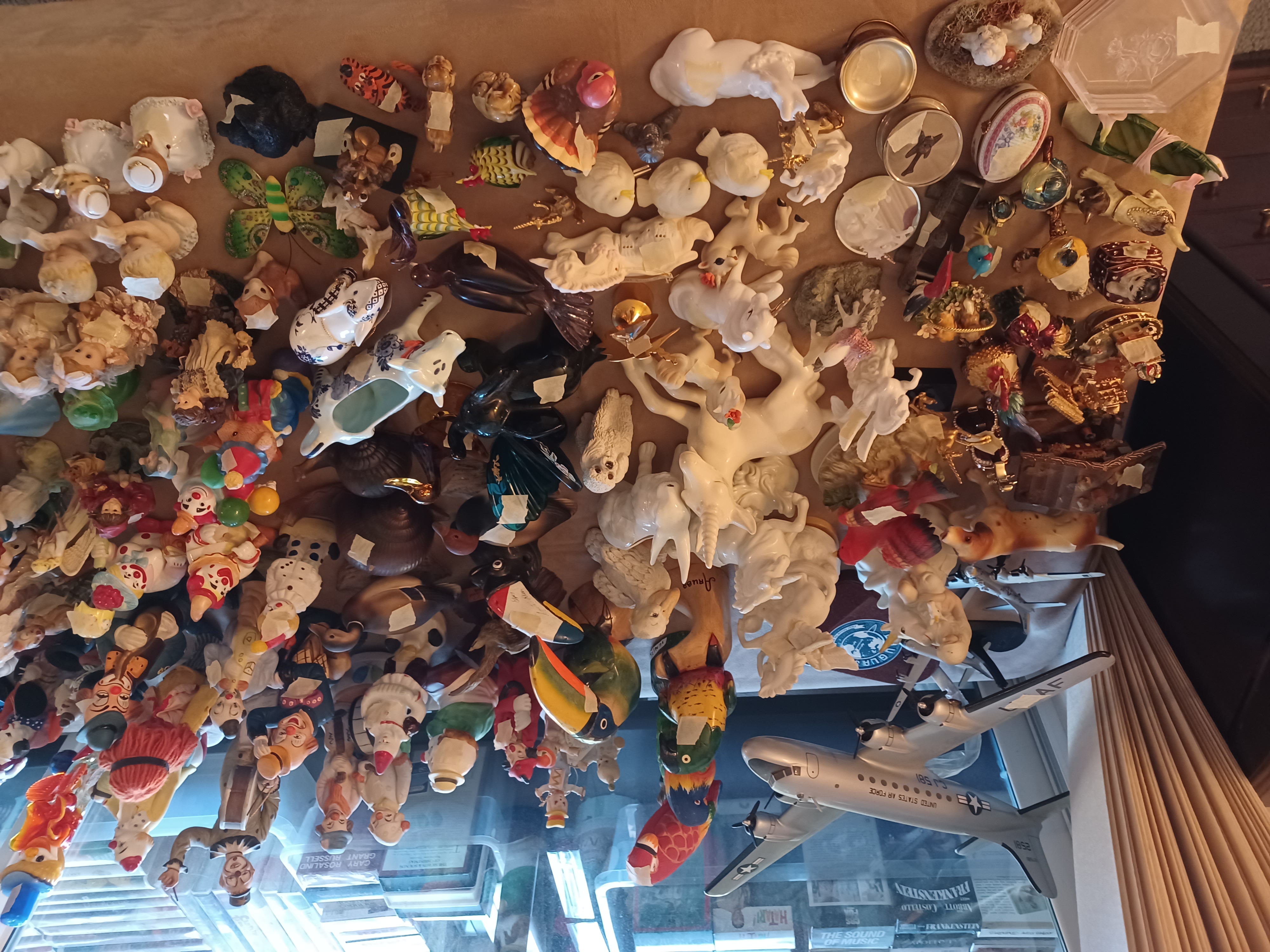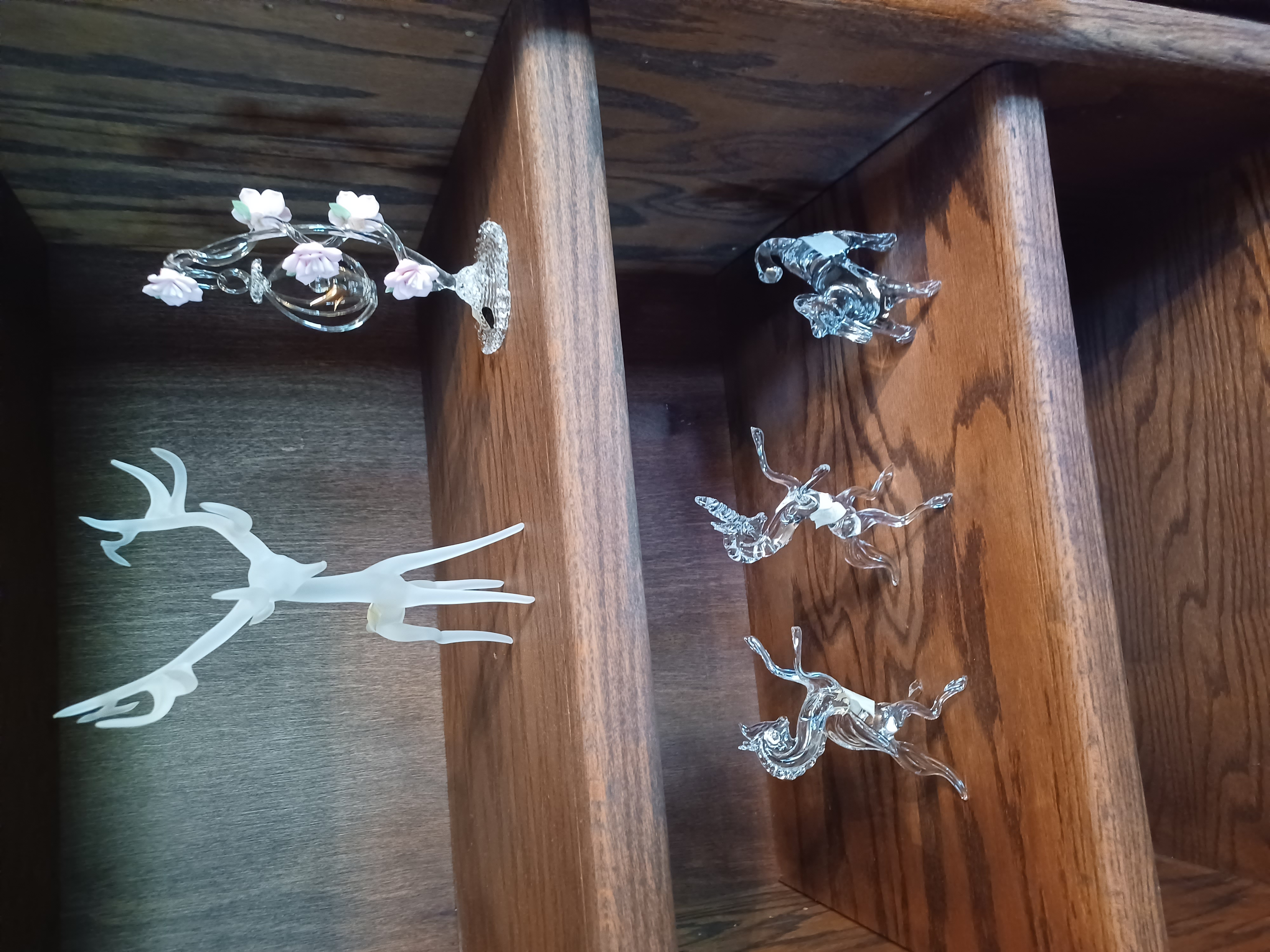 Teacups, Hummel figurines, porcelain and glass clowns, a Mickey Mouse phone, crystal pieces, unicorn figurines, Norman Rockwell items, collector plates, blown glass, gold-trimmed glassware, and much more.