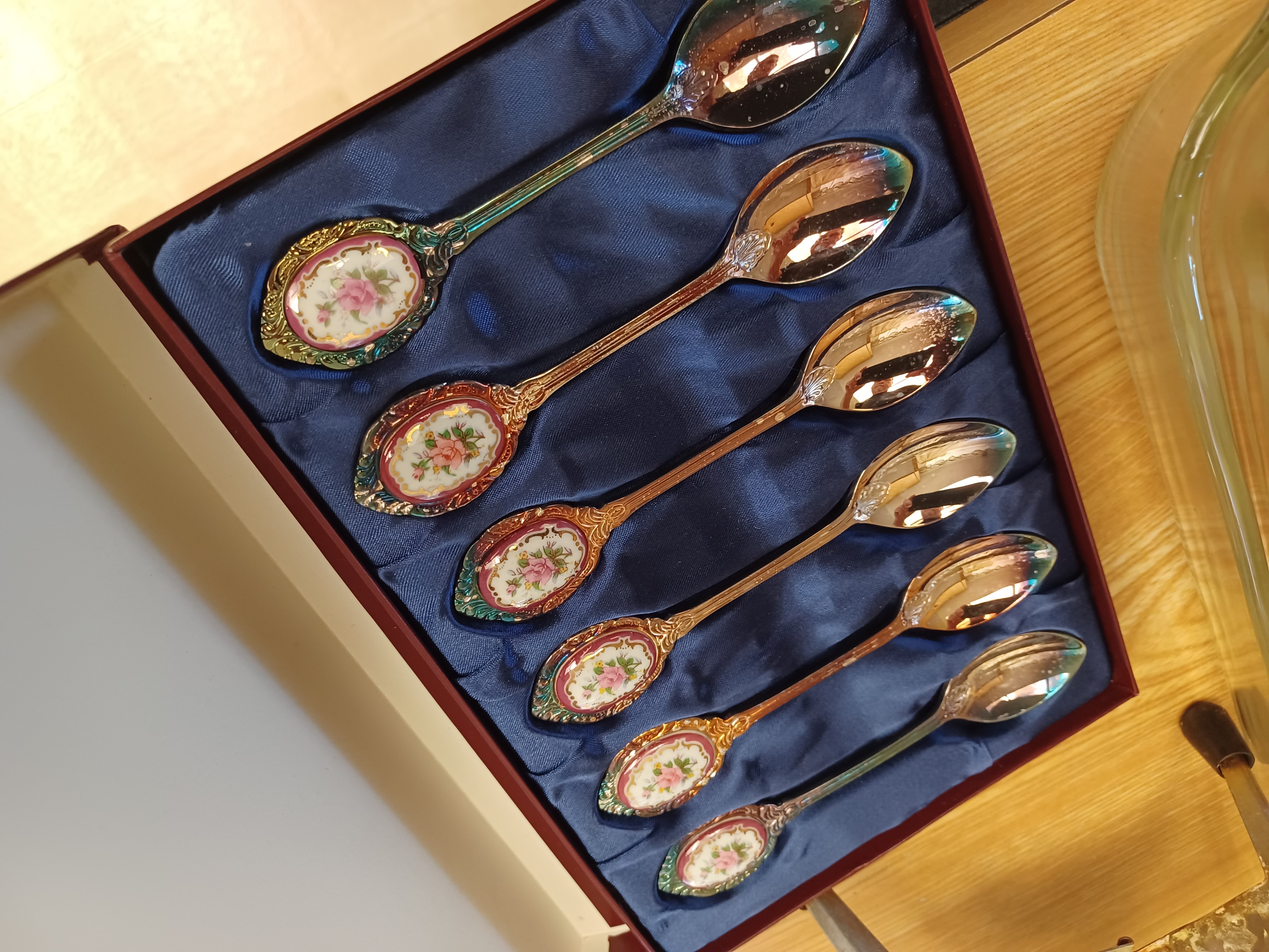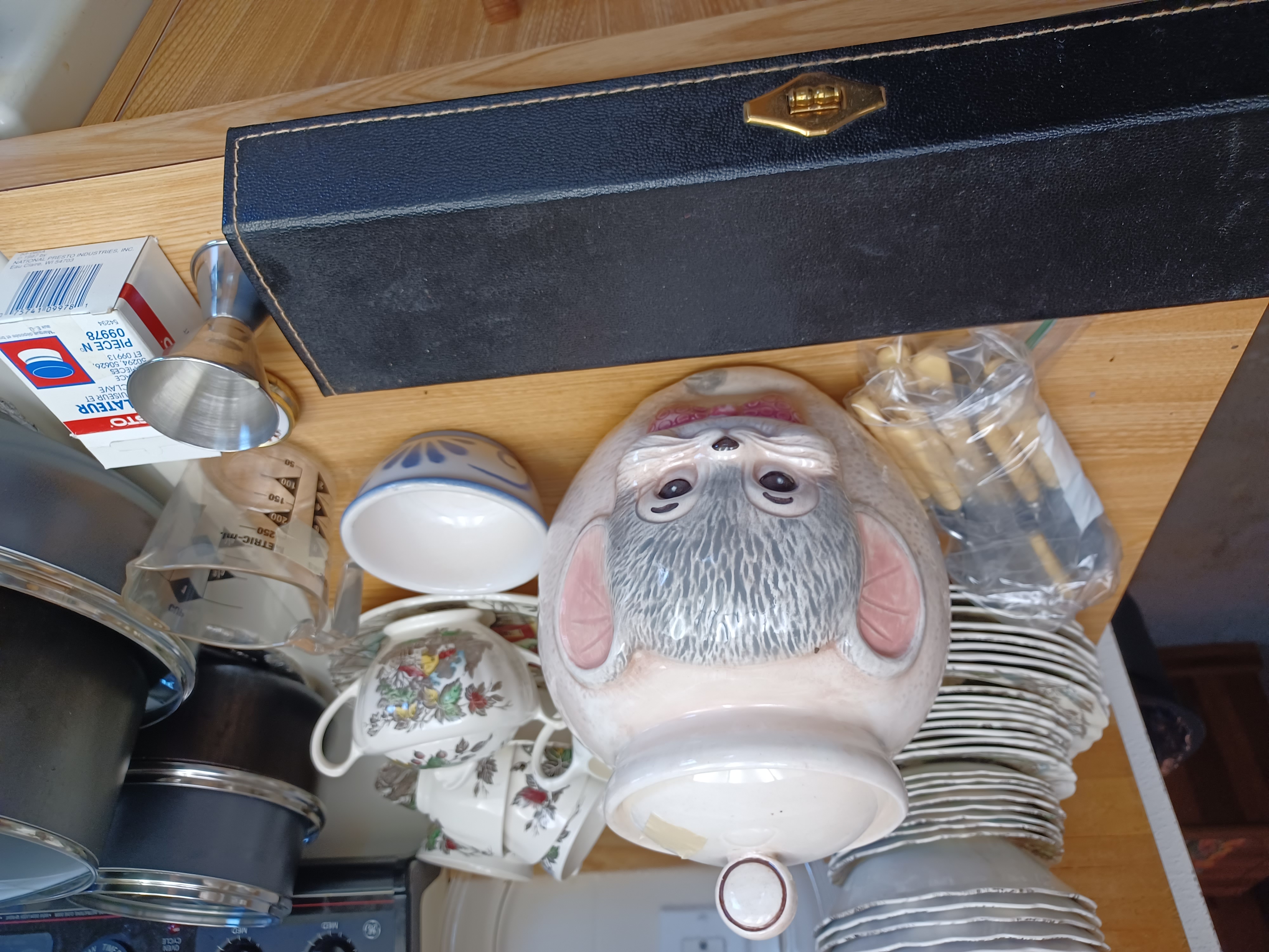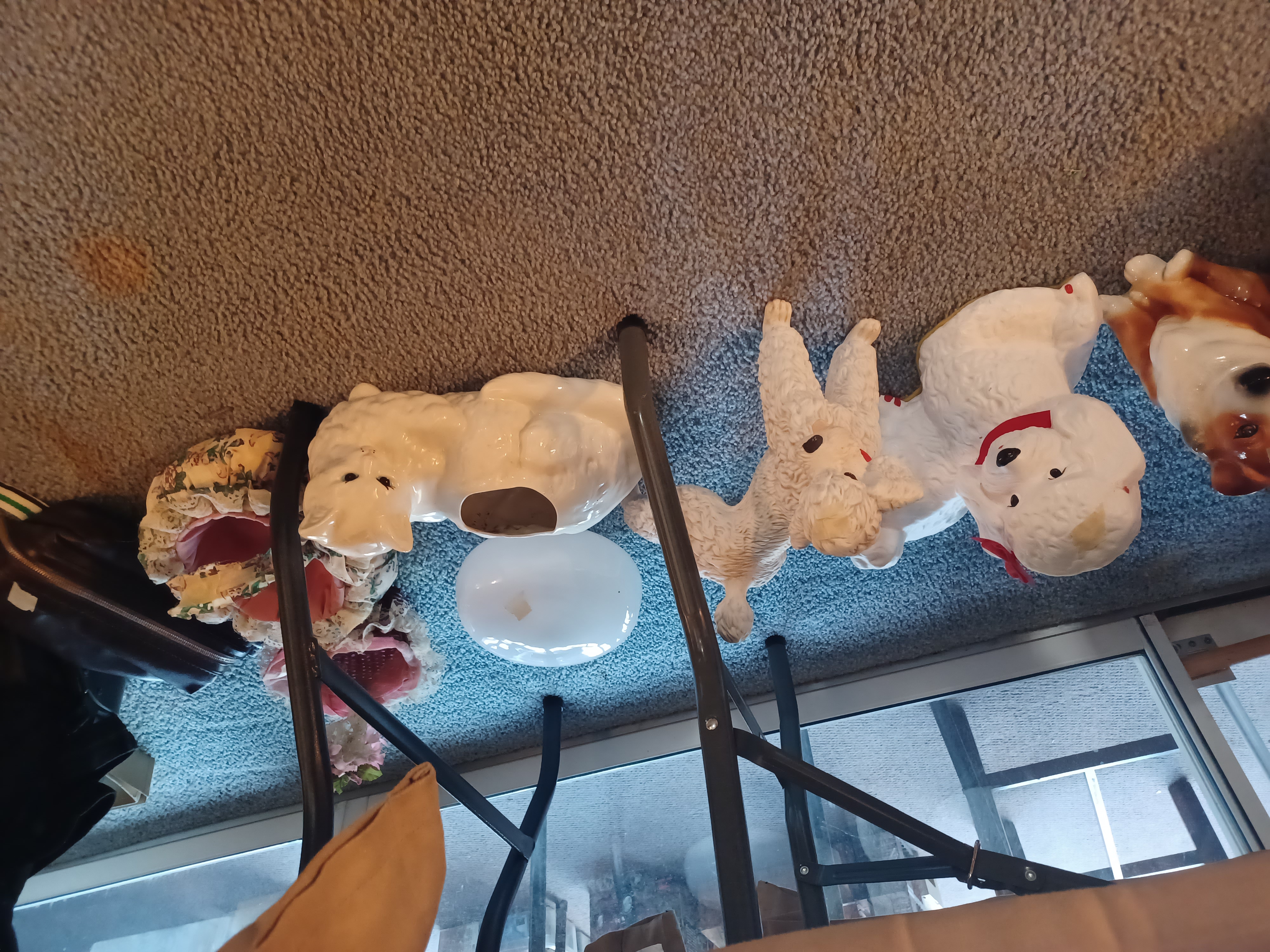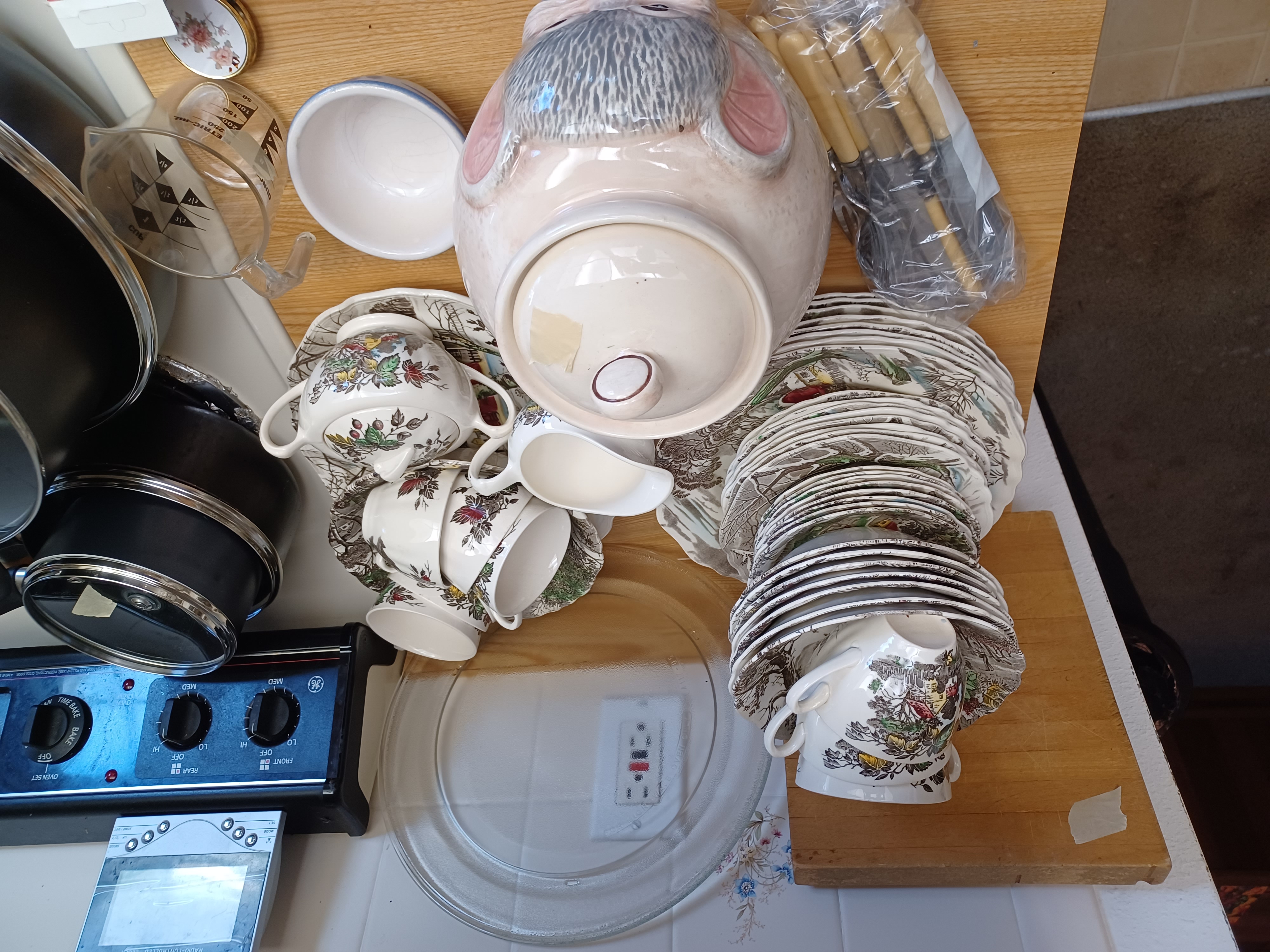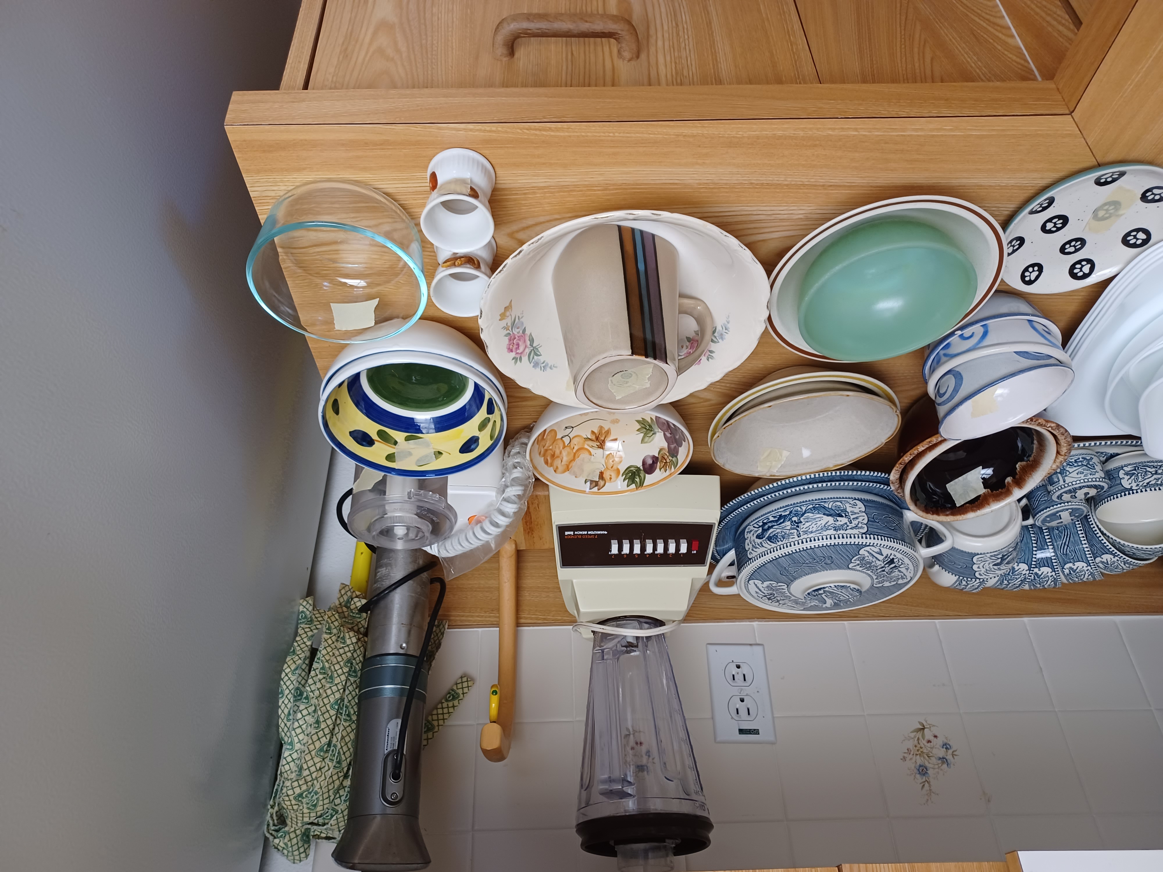 Teacups, Hummel figurines, porcelain and glass clowns, a Mickey Mouse phone, crystal pieces, unicorn figurines, Norman Rockwell items, collector plates, blown glass, gold-trimmed glassware, and much more.