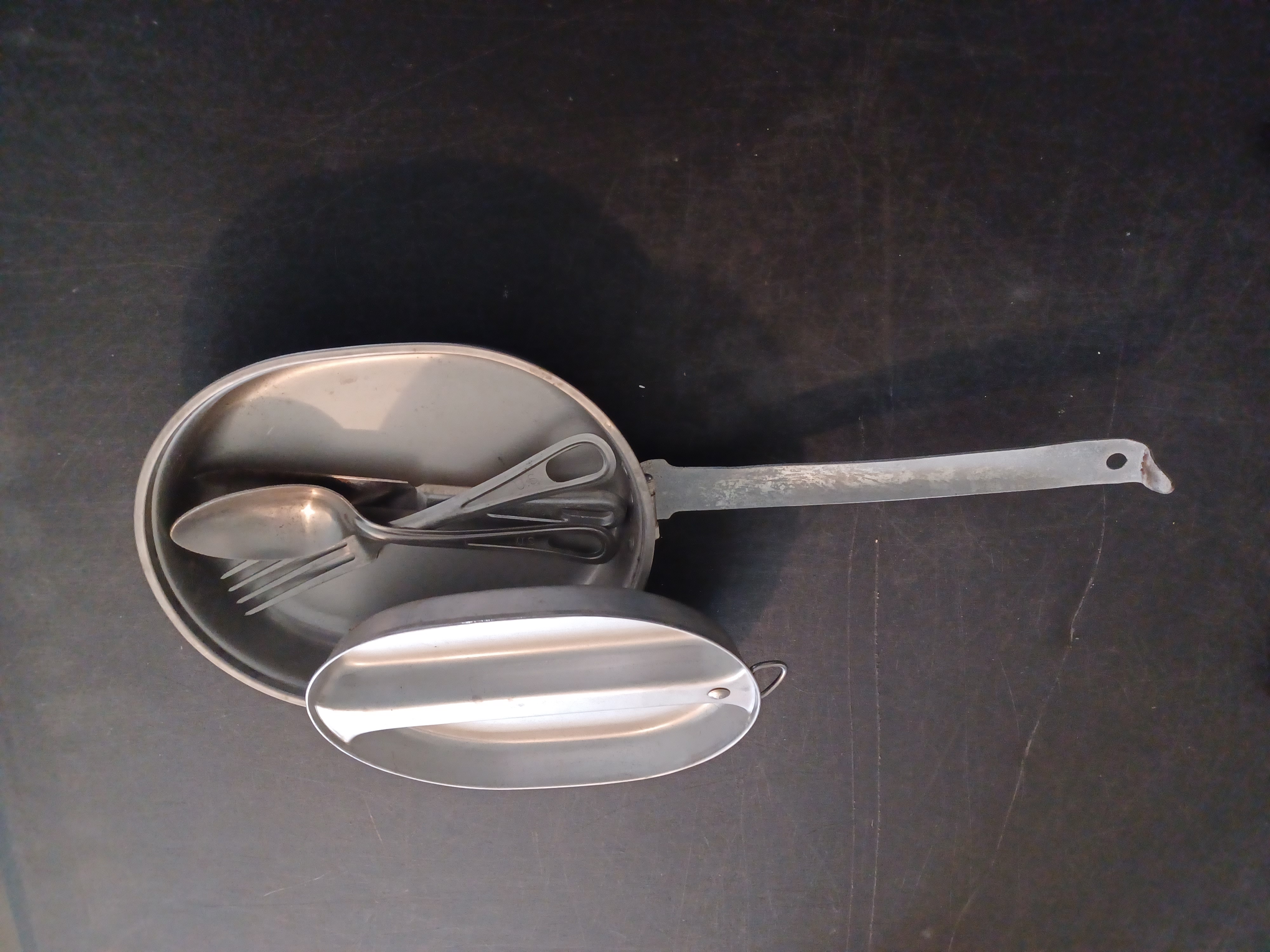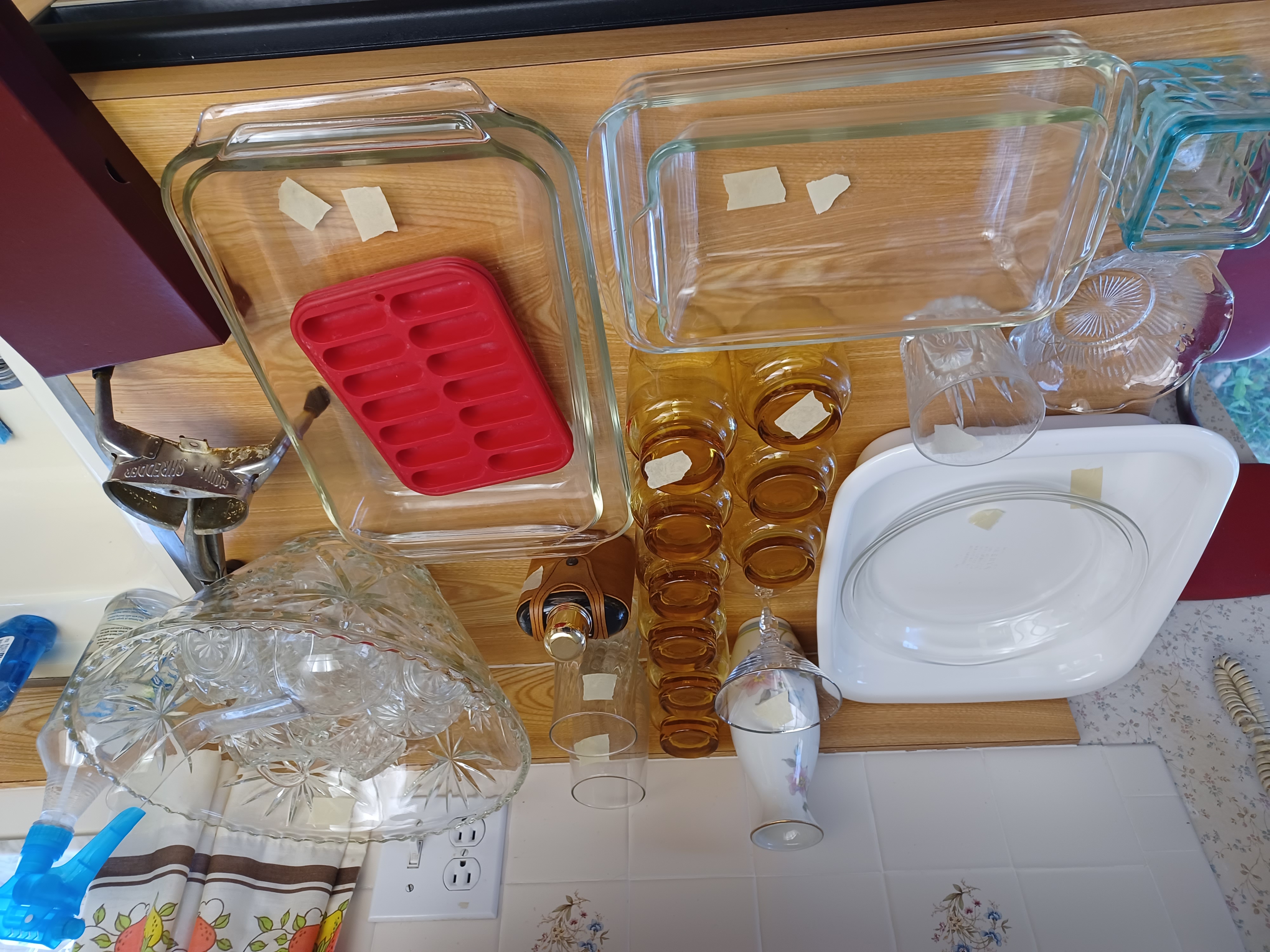Pyrex, Fire-King, pots and pans, glassware, Corelle dishes, a German carving set, vintage step stool/seat, two dinette sets, and Tampa Bay Buccaneers glasses.