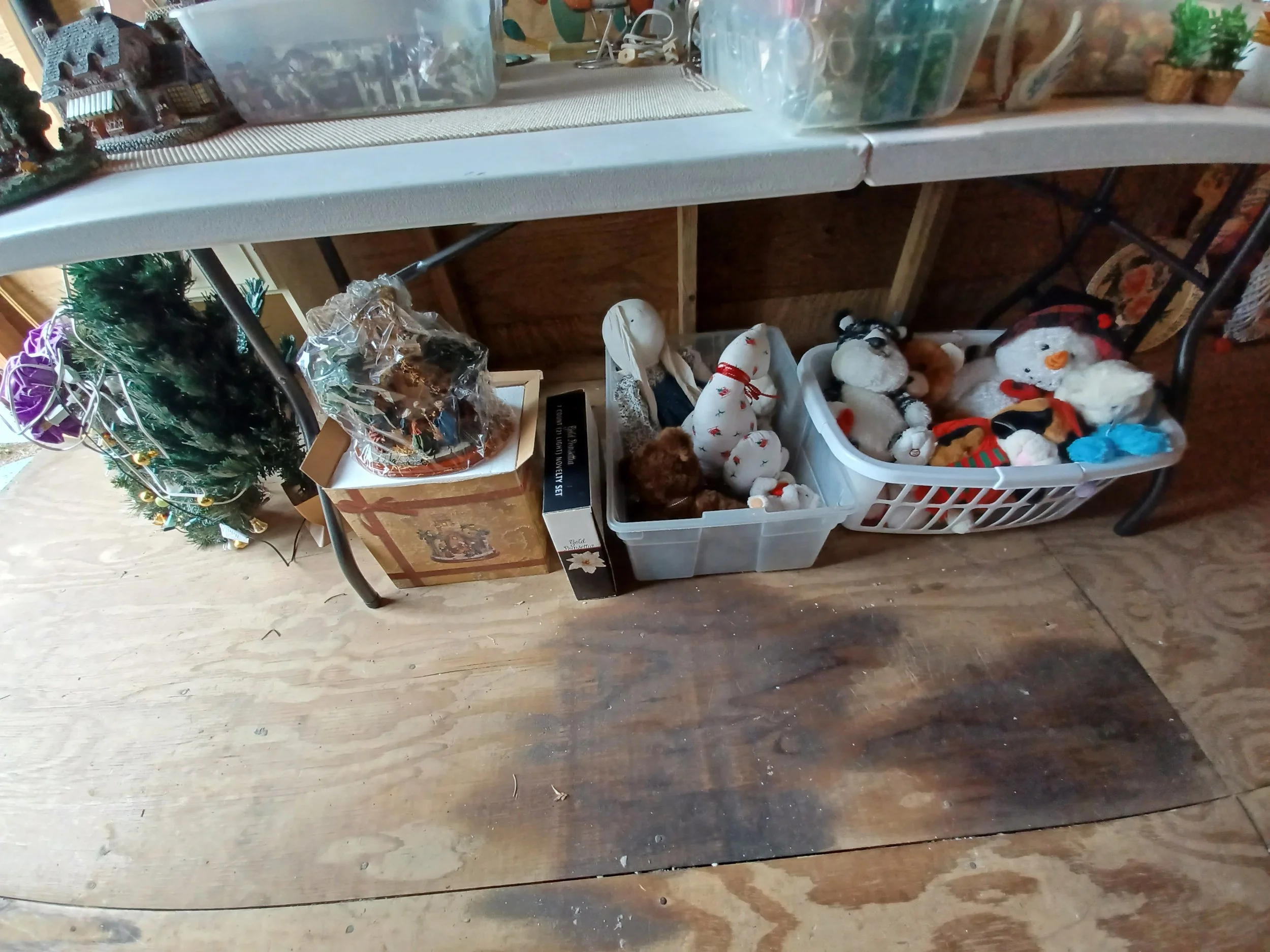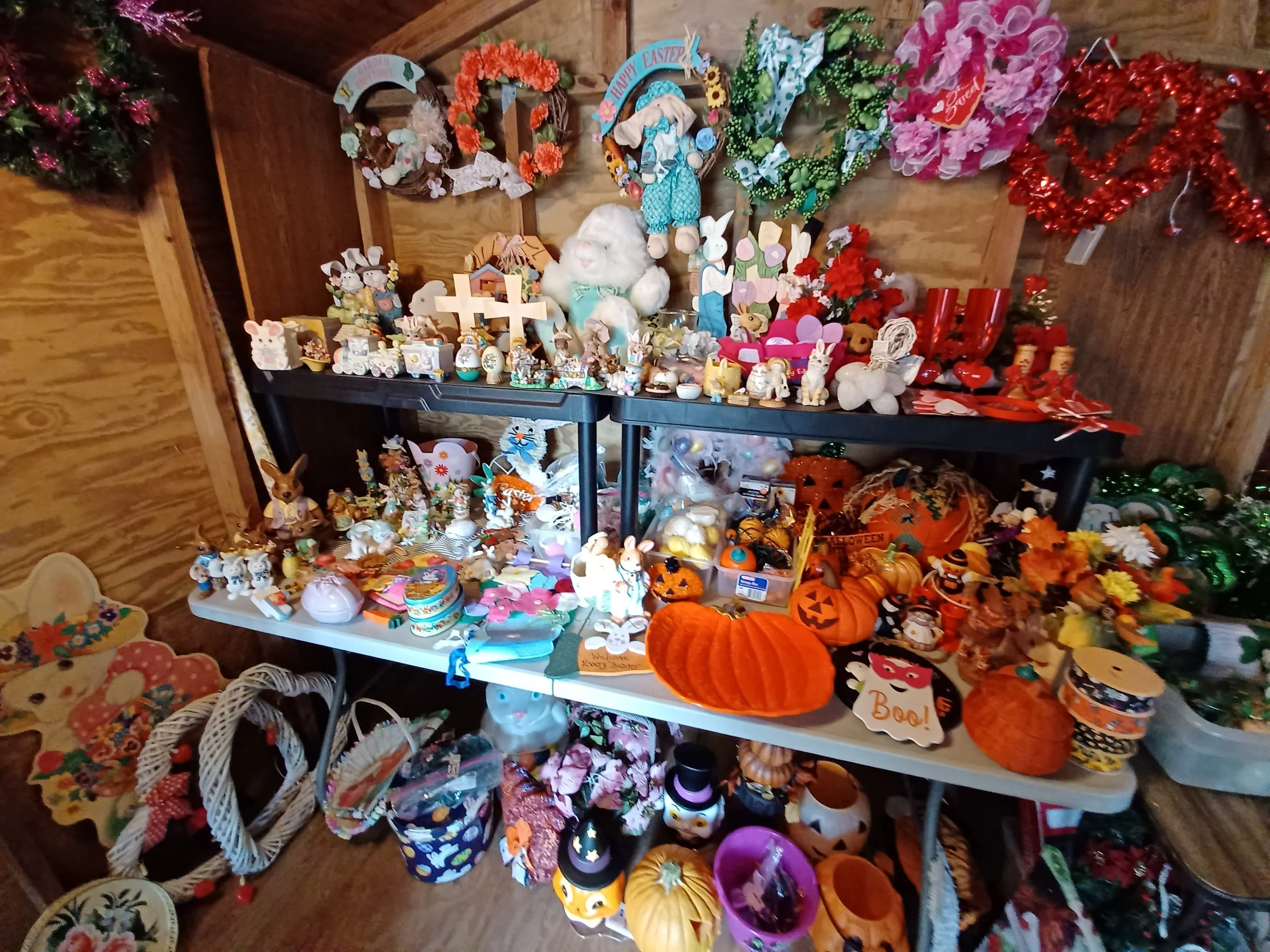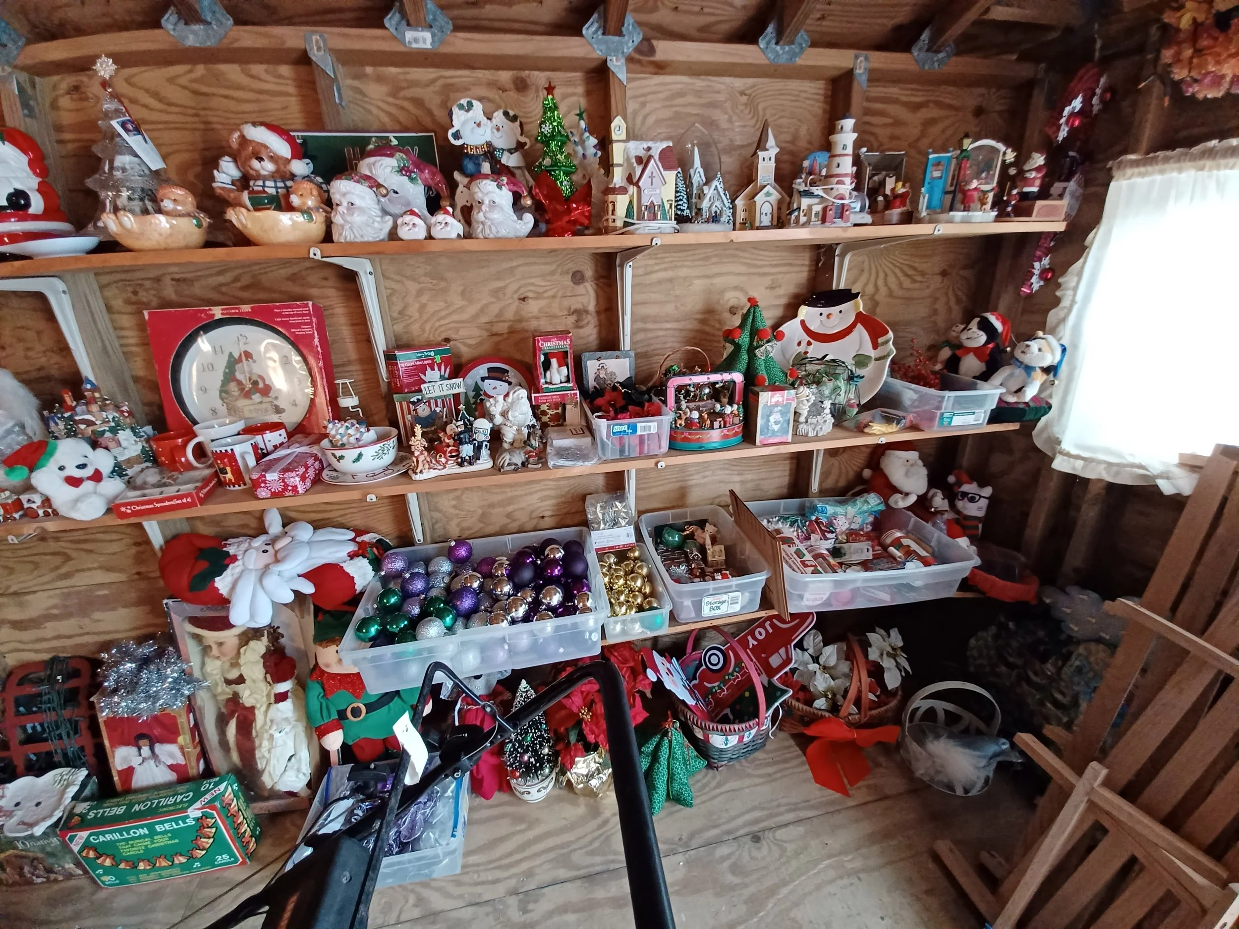 Shed is nothing but holiday stuff.. Every Holiday item is in it!!! Also a vintage Doll House. Shed is also for sale. To be removed after SALE Event.. 10’x14’ shed with 4 foot wide opening double doors and a Front Window!! Will NEED PROFESSIONALLY MOVED!!! Inquire to Hudson Sheds!! Might be able to help…